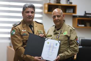 14:06 Medalha de Mérito do Comando-Geral é entregue ao Chefe do Estado-Maior Nesta quinta-feira (22), no Quartel do Comando-Geral, em Curitiba, o Comandante-Geral da Polícia Militar do Paraná, coronel Jefferson Silva, entregou a Medalha de Mérito do Comando-Geral ao Chefe do Estado-Maior da PMPR, coronel Paulo Roberto Lima.