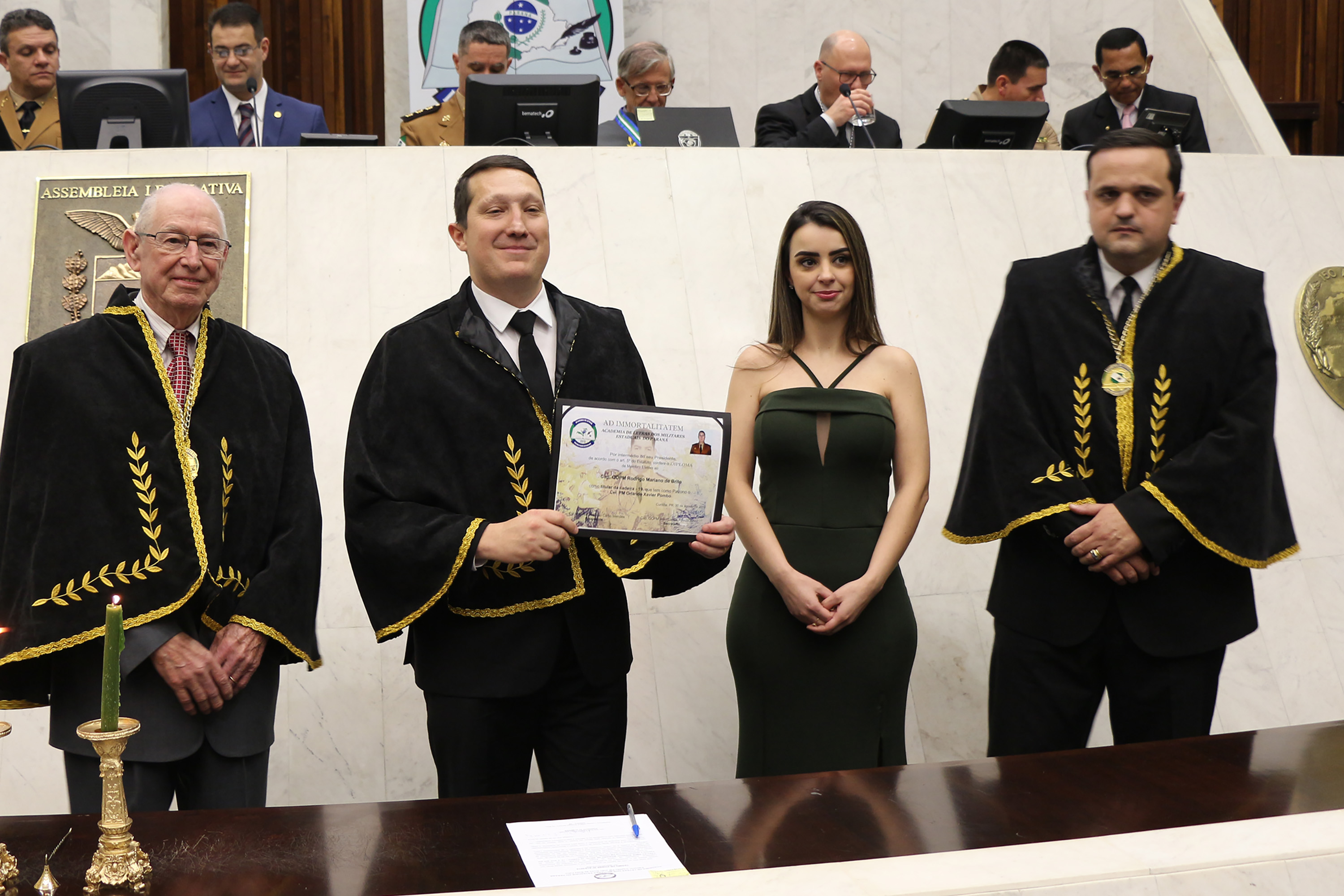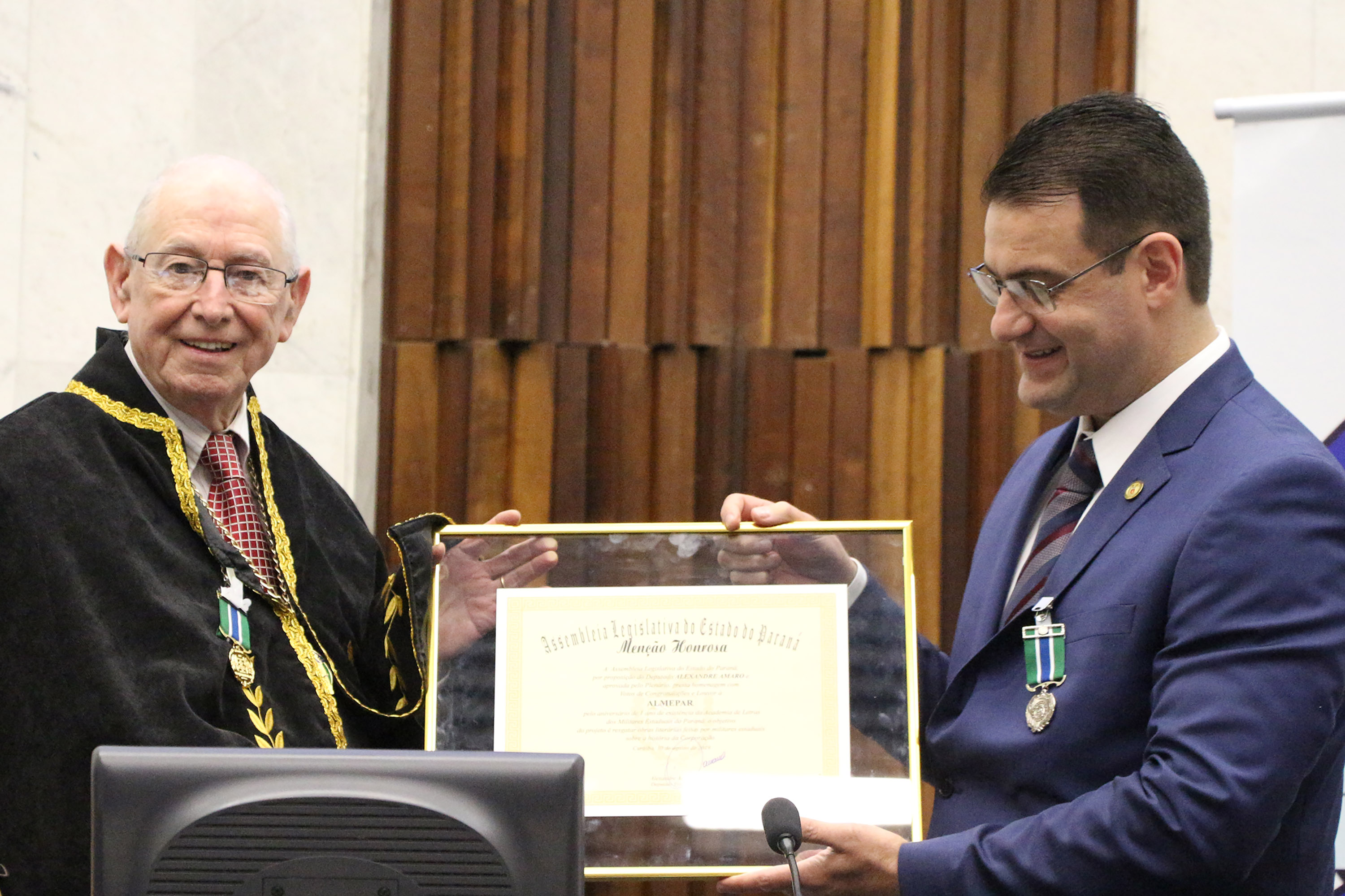 Curitiba, 30 de agosto de 2019. Aniversario Almepar. Foto: Cel Abreu recebe diploma de Academico de Honra.