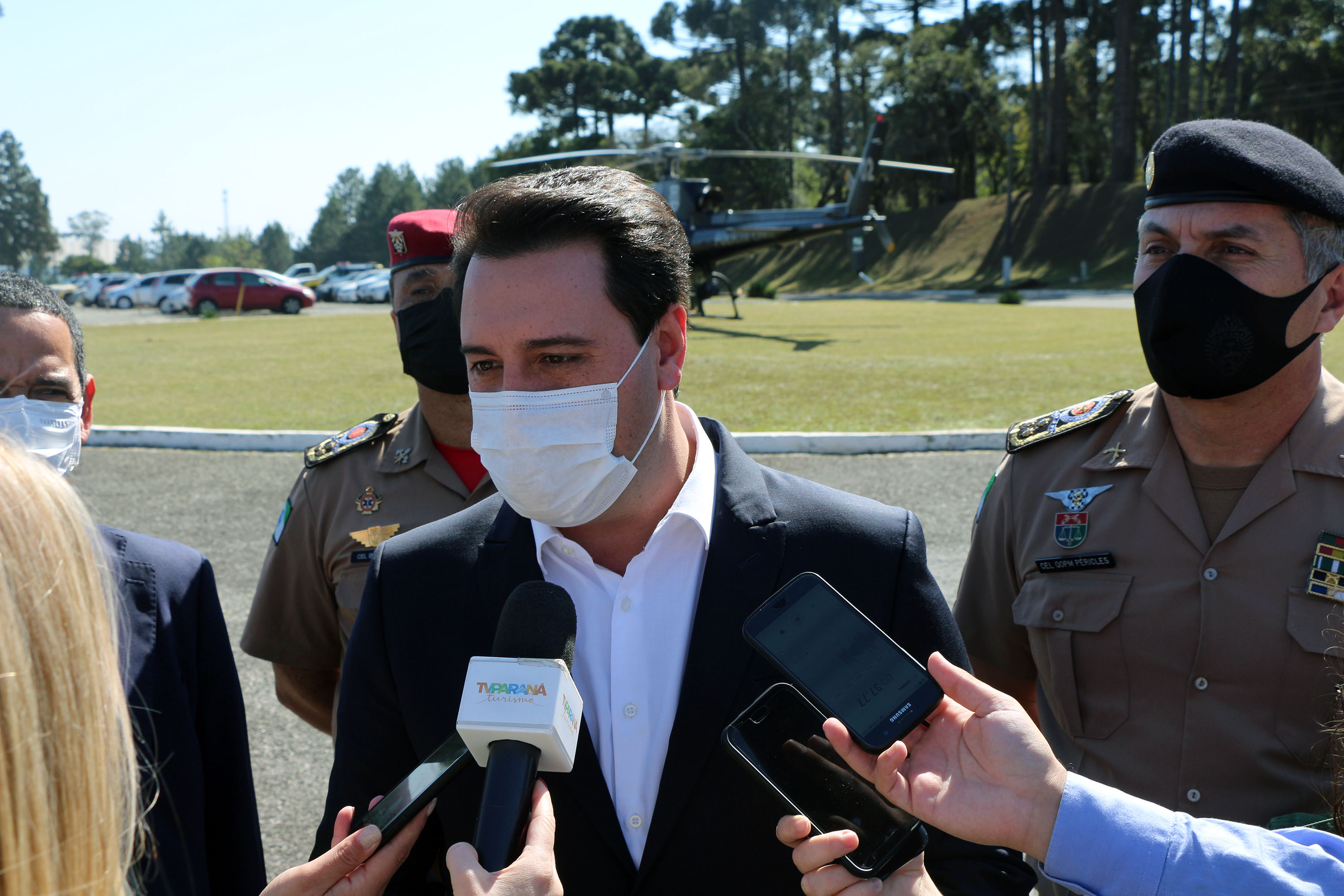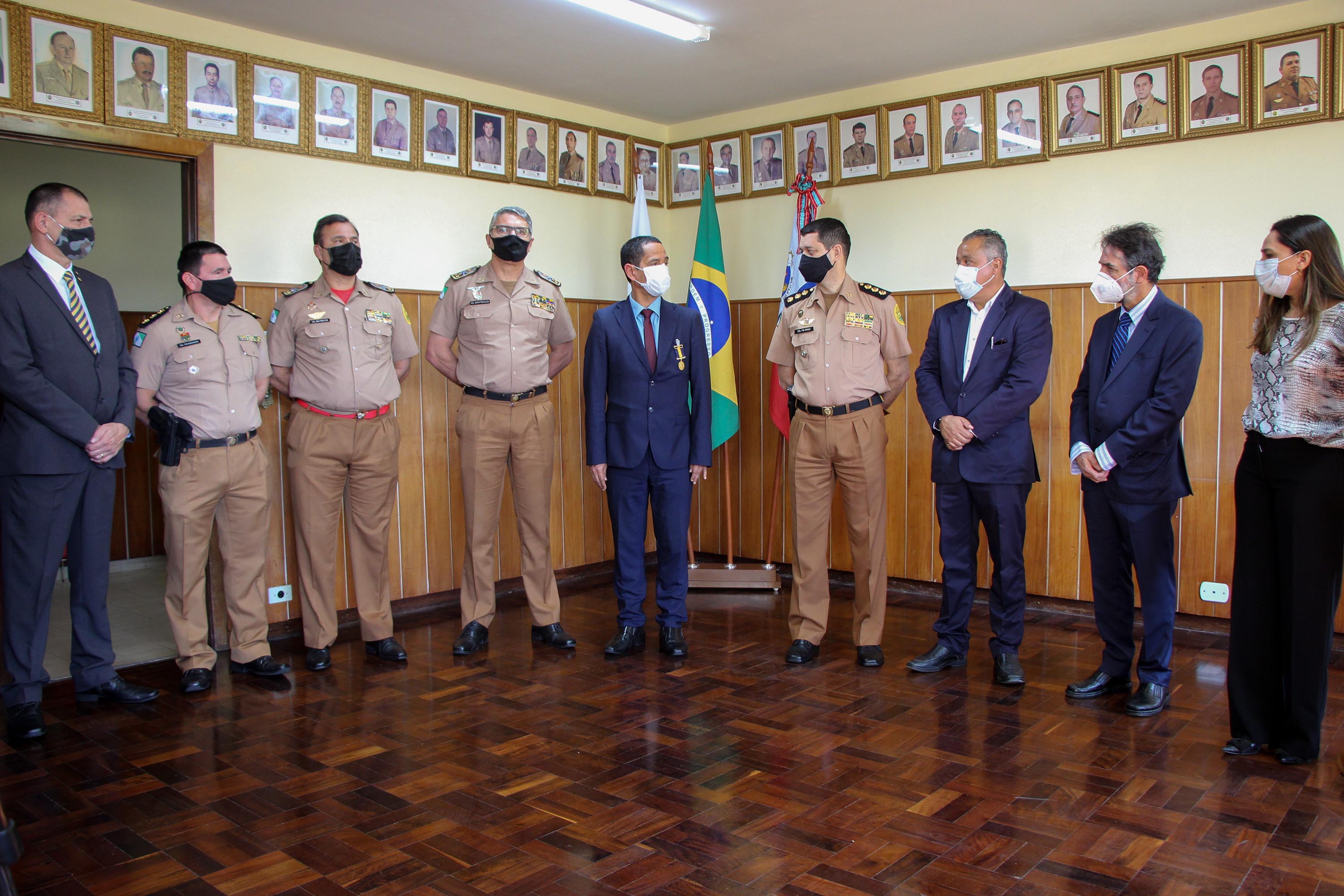 São José dos Pinhais, 10 de agosto de 2020. Aniversário de 166 anos da PMPR. Foto: Secretário de Segurança Pública do Estado do Paraná, Cel EB Romulo Marinho Soares, recebe a Medalha Coronel Sarmento do Comandante-Geral da PMPR, Cel QOPM Péricles de Matos. - Soldado Ismael Ponchio.