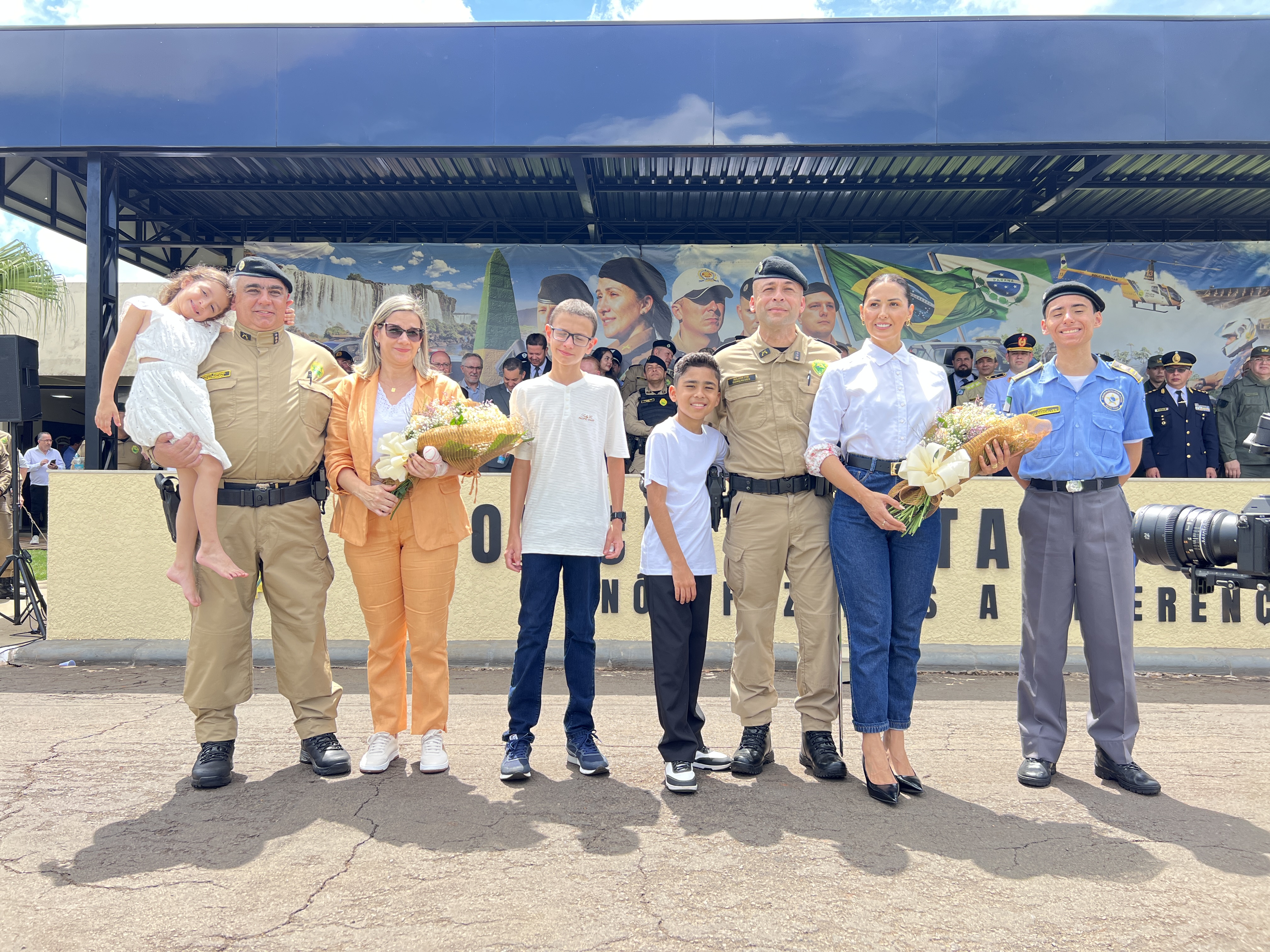 Na continuidade, o subcomandante do batalhão, major Dal Pozzo, entregou ao tenente-coronel Skovronski uma flâmula representando o vínculo construído ao longo de sua permanência na unidade. Houve também a tradicional troca de lembranças entre as famílias do comandante sucedido e do novo comandante, gesto que simboliza acolhimento, gratidão e reconhecimento ao apoio essencial ao trabalho policial-militar.