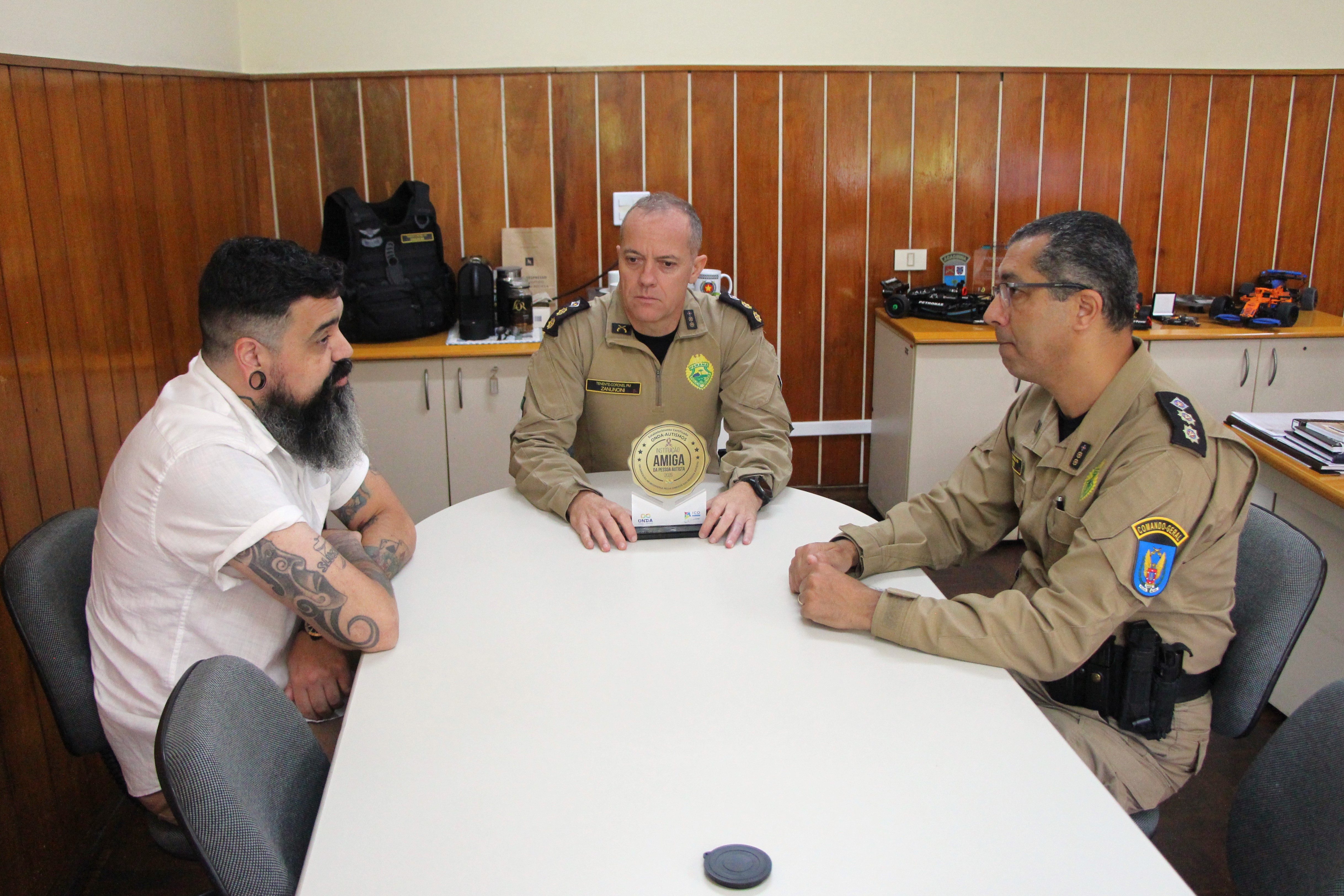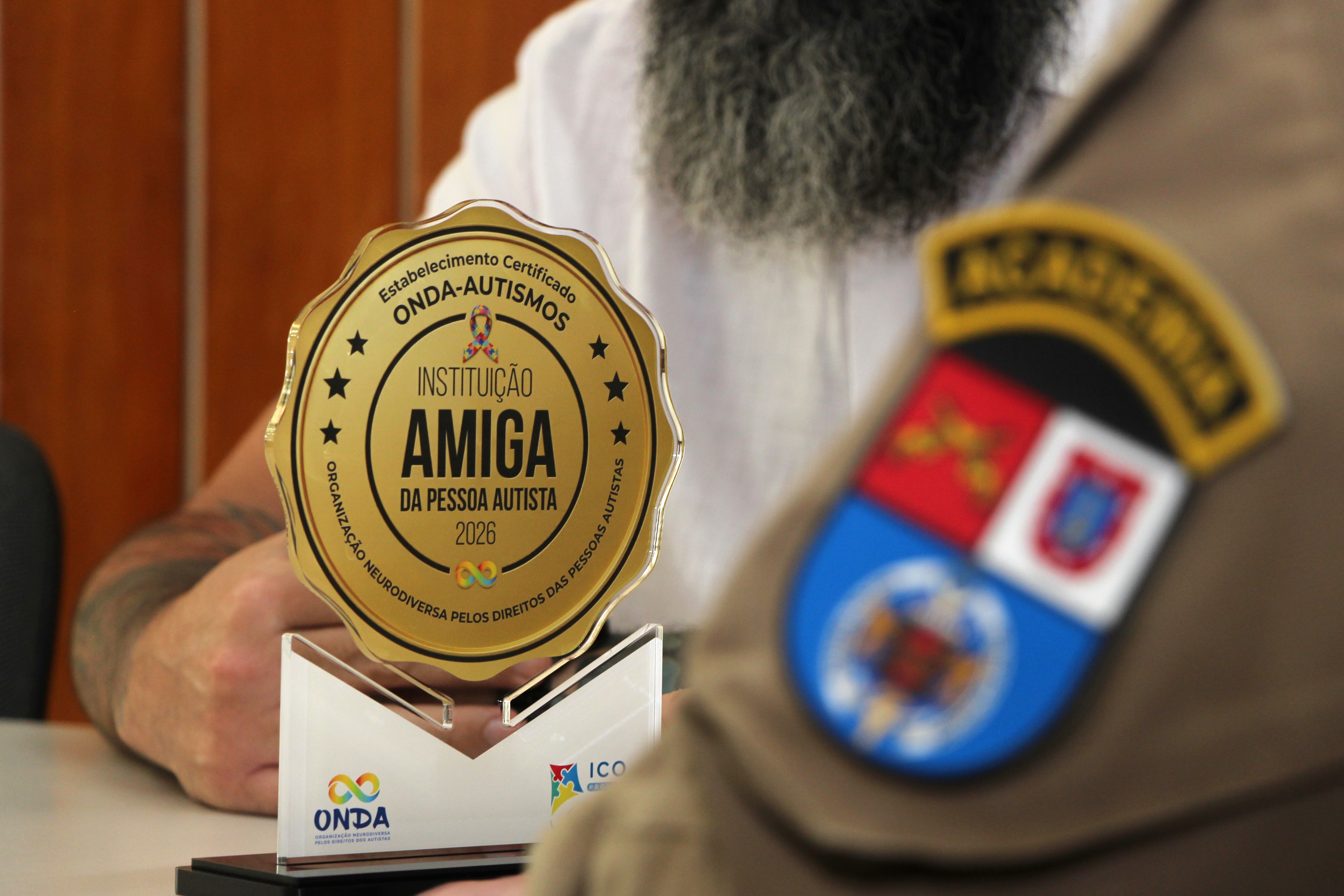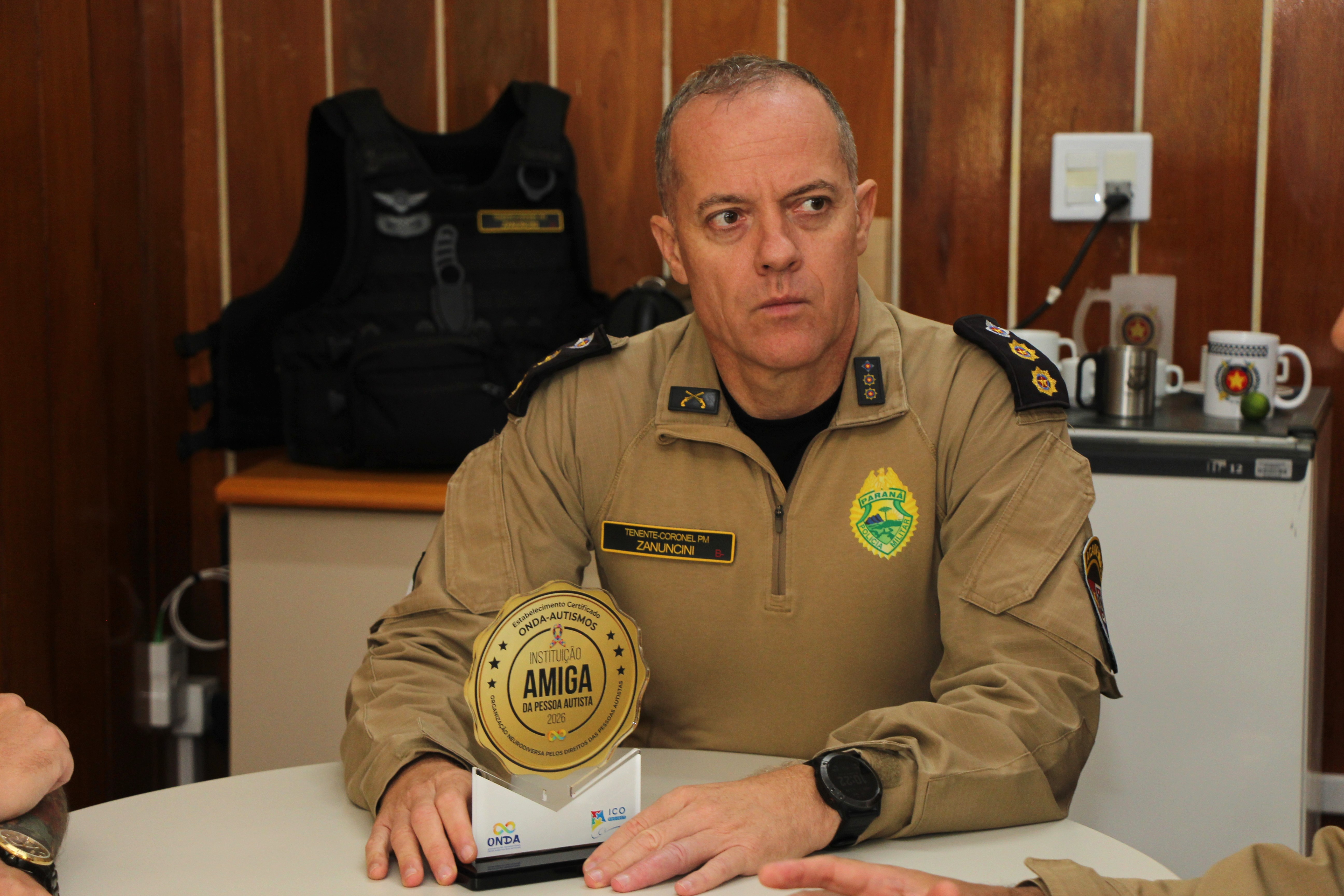 Ainda durante a manhã, o tenente-coronel Juliano Zanuncini, Subcomandante da APMG, recebeu das mãos do Sr. Fábio Cordeiro, o selo de "Instituição Amiga do Autismo". A entrega foi acompanhada pelo tenente-coronel Valter Ribeiro da Silva, pai de uma criança com Transtorno do Espectro Autista (TEA) e um dos idealizadores do encontro. Este reconhecimento simboliza a sólida parceria entre a corporação e a ONDA-AutismoS, chancelando o compromisso da unidade de ensino e da PMPR com a promoção de um ambiente institucional inclusivo e com a formação de militares cada vez mais preparados para o atendimento humanizado.