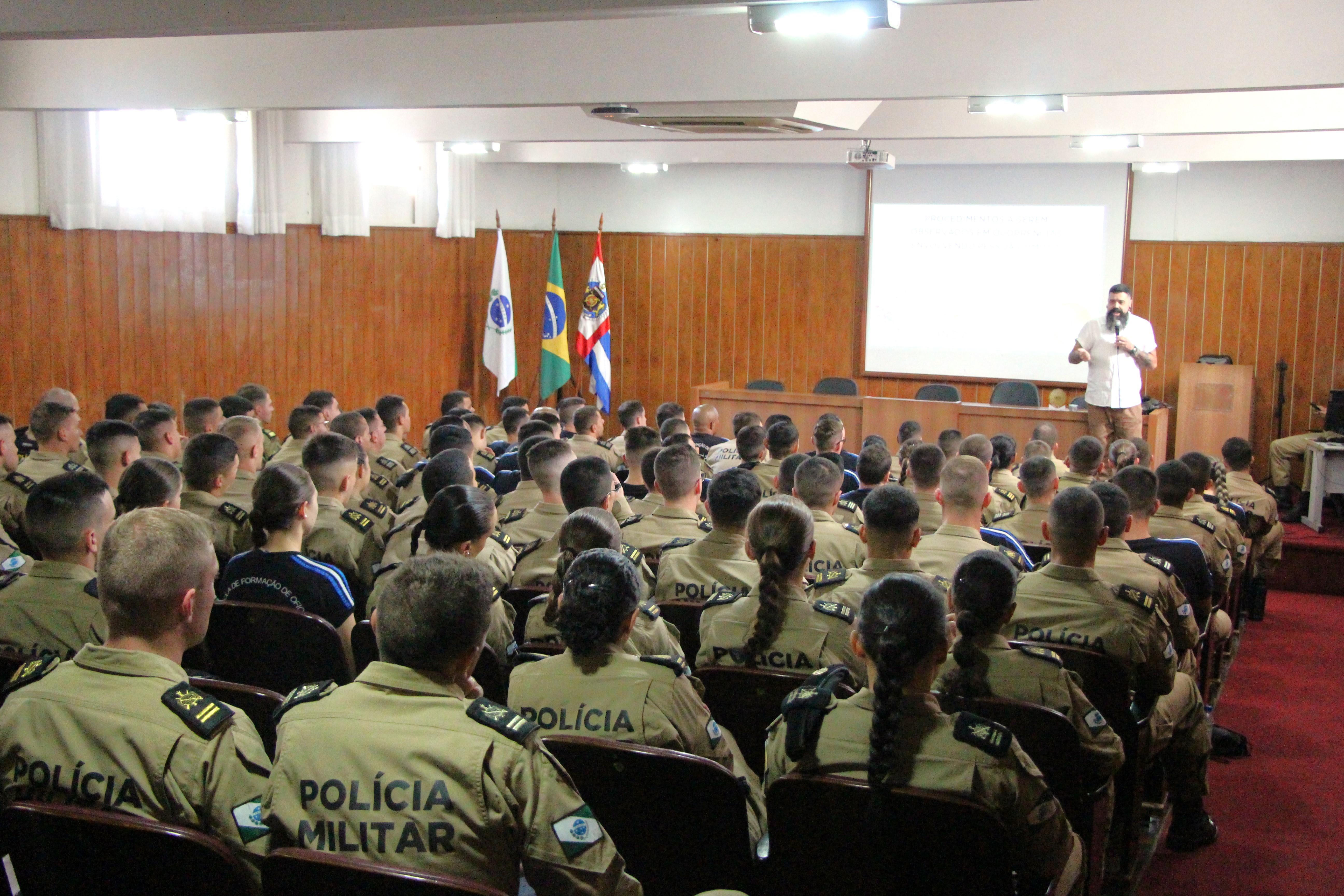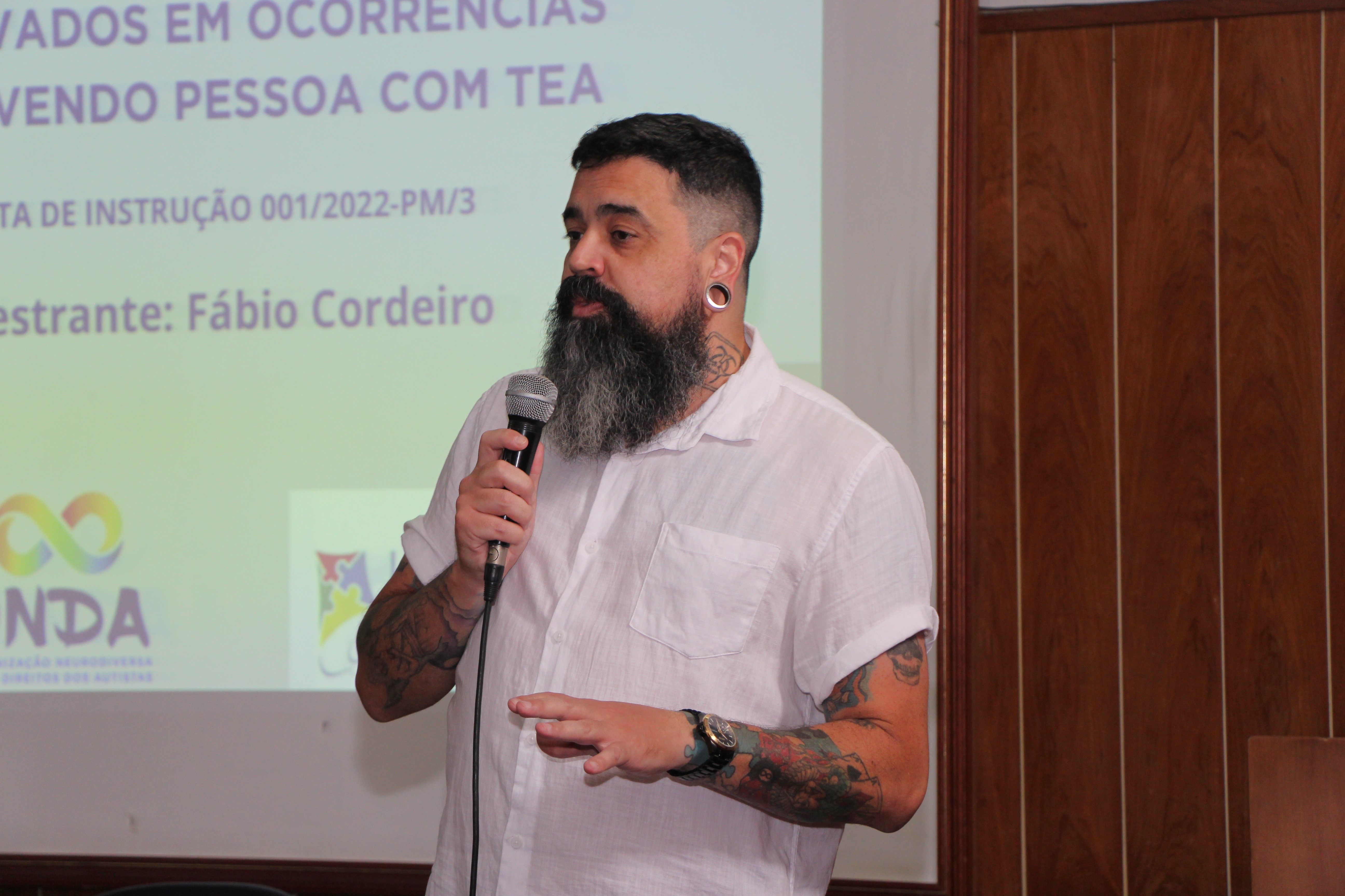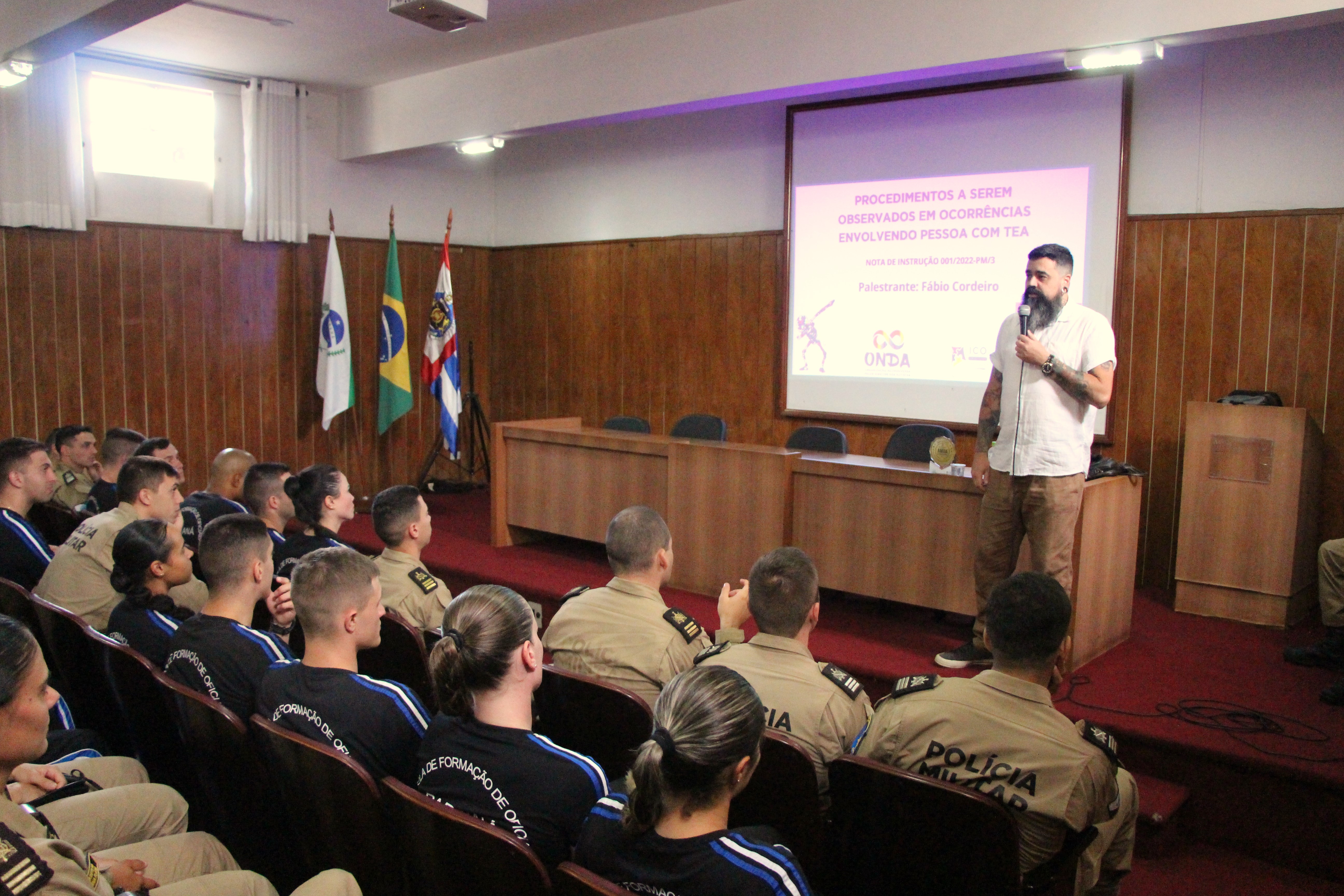 A palestra foi ministrado por Fábio Cordeiro, presidente da Organização Neurodiversa pelos Direitos dos Autistas (ONDA-AutismoS) e cofundador do Coletivo Autista na UFPR (Coletivo Stim). Na ocasião, ele trouxe uma bagagem multifacetada aos cadetes, unindo sua experiência como servidor público federal, graduando em Pedagogia, escritor e palestrante à sua vivência pessoal como autista. A presença de um palestrante que vivencia a neurodiversidade permitiu que os cadetes compreendessem, de forma prática e empática, as nuances sensoriais e comportamentais que podem surgir durante uma abordagem policial, garantindo que a atuação da PM seja pautada pela técnica e pelo discernimento.