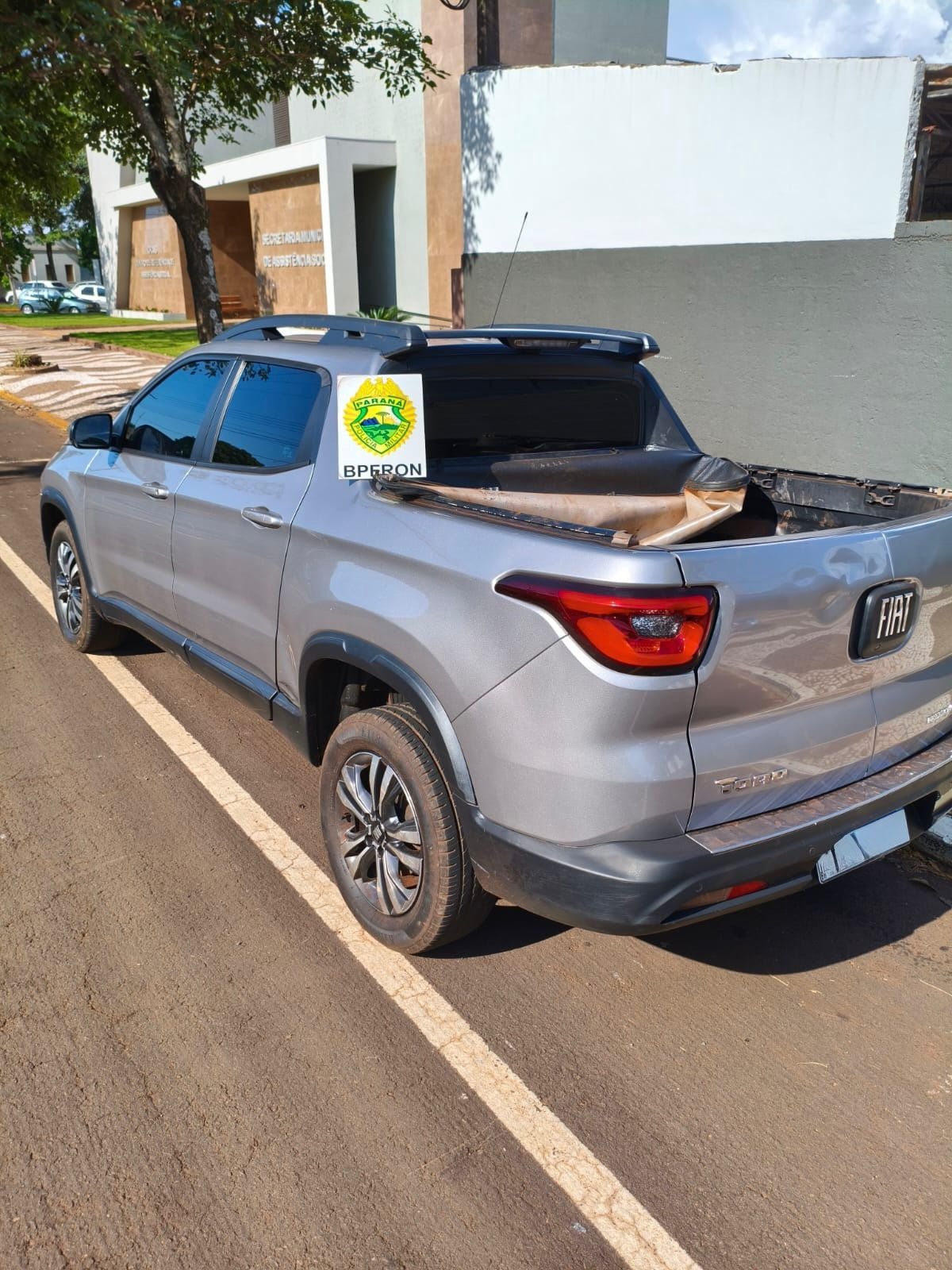 Durante a vistoria, foi localizado um veículo Fiat/Toro, de cor prata, equipado com rádio comunicador, contendo apenas o banco do motorista e adaptado com sistema de emissão de fumaça, característica comum em automóveis preparados para ações relacionadas ao contrabando ou tráfico. Constatou-se ainda que o veículo possuía registro de boletim de ocorrência por fraude, tendo sido desviado de um carregamento de veículos.
