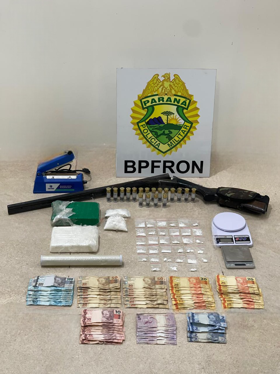 No mesmo dia, em Barracão, o BPFRON, em ação conjunta com o 21º Batalhão de Polícia Militar (BPM), recebeu informações de que uma residência estaria sendo utilizada como ponto de tráfico de drogas. Após monitoramento do local, usuários foram abordados ao saírem do imóvel. Em seguida, foi realizada abordagem na residência, onde foram encontrados 28 invólucros de substância análoga à cocaína prontos para venda, R$ 2.679,00 em espécie fracionado e materiais para embalagem da droga.