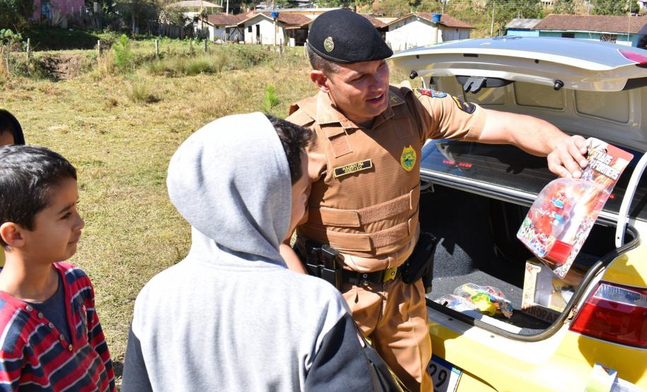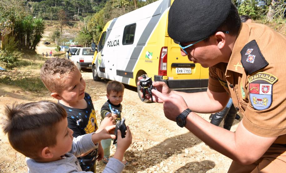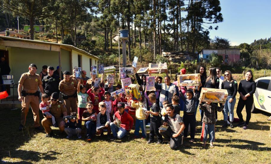 Os moradores da Colônia Marques de Abrantes e Antinhas, da cidade de Tunas do Paraná, foram surpreendidos com a visita de policiais militares que levaram presentes, cestas básicas e doces para as crianças. A atividade faz parte das comemorações do aniversário de 165 anos da Polícia Militar. O trabalho social ocorreu no último sábado (03/08) pela iniciativa do 22º Batalhão de Polícia Militar (22º BPM), pertencente ao 6º Comando Regional da PM (6º CRPM), com apoio da Polícia Civil e de outros órgãos e instituições locais.