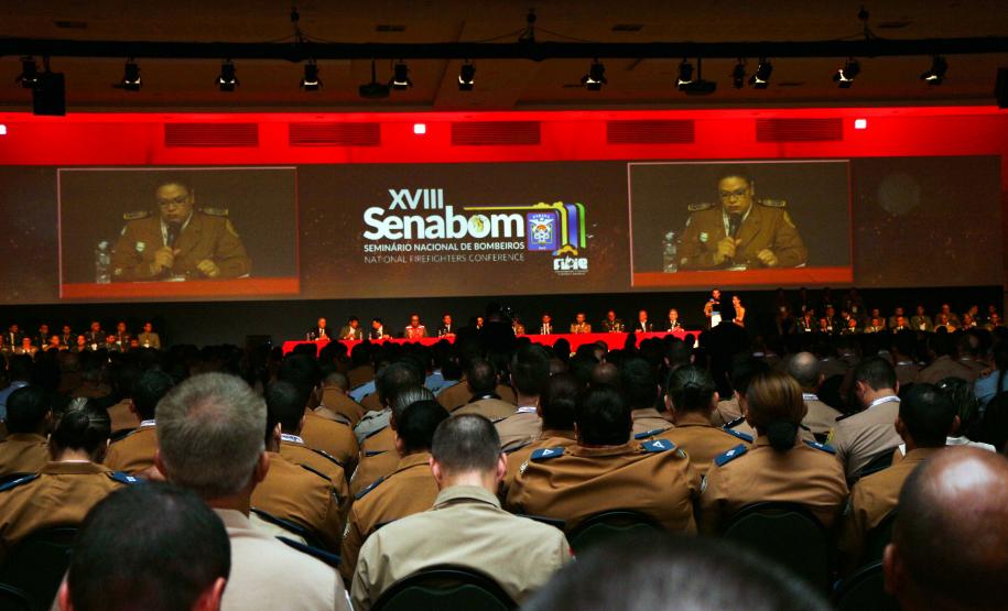 A abertura do XVIII Seminário Nacional de Bombeiros – Senabom/2018 ocorreu na manhã desta quarta-feira (21/11) no auditório principal do Rafain Convention Center em Foz do Iguaçu (PR) com a presença dos Comandantes-Gerais de Polícias e Corpos de Bombeiros Militares de todo o Brasil e representantes do exterior. A palestra de abertura foi com Kathleen H. Almand, Vice-Presidente de pesquisa da Associação Nacional de Proteção contra Incêndios, do Reino Unido, com o tema Incêndio no Edifício Grenfell Tower, Londres, 2017 - Aprendizados e ações tomadas para se evitar novas tragédias. O Senabom segue até sexta-feira (23/11) com atividades científicas, competições e feira.