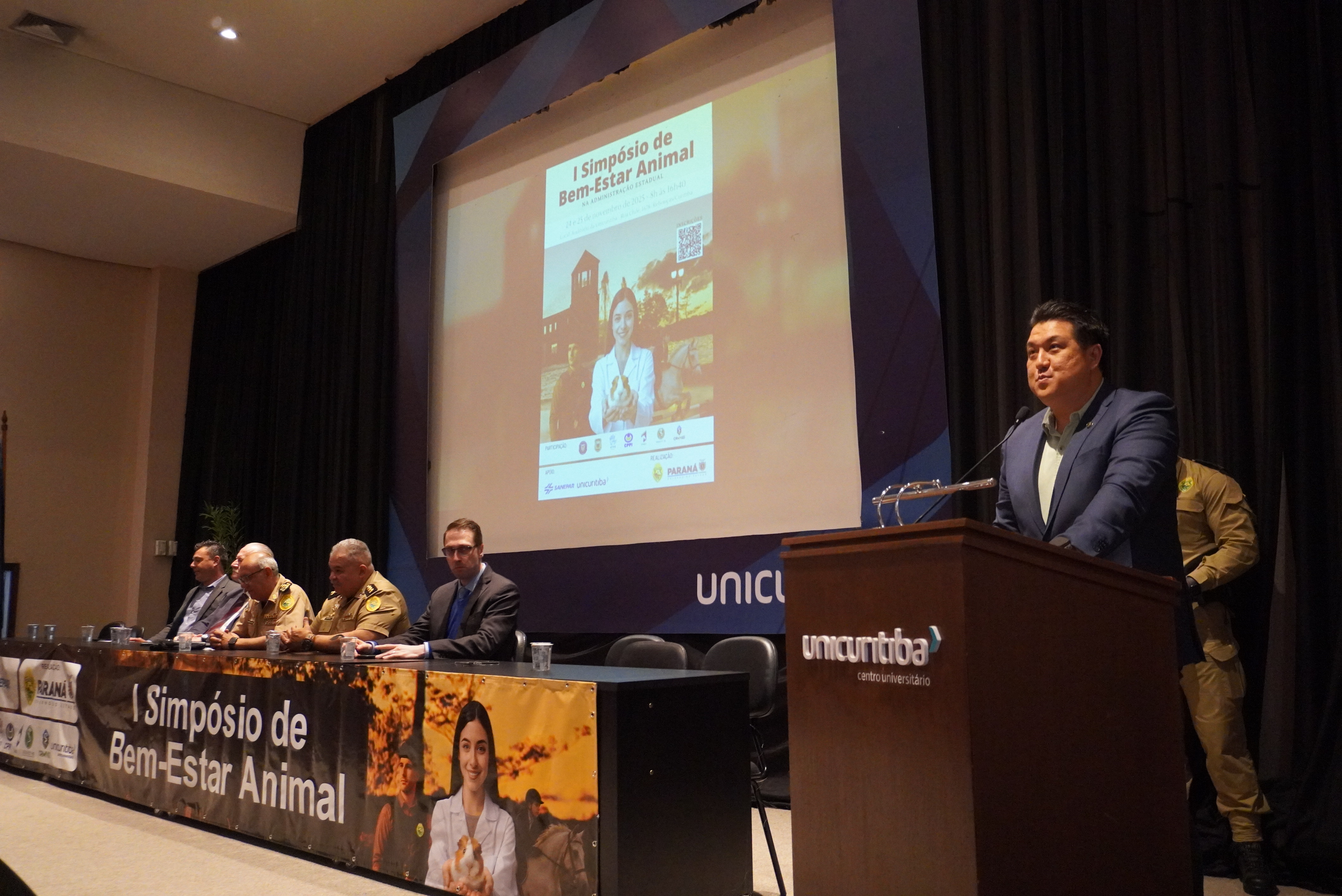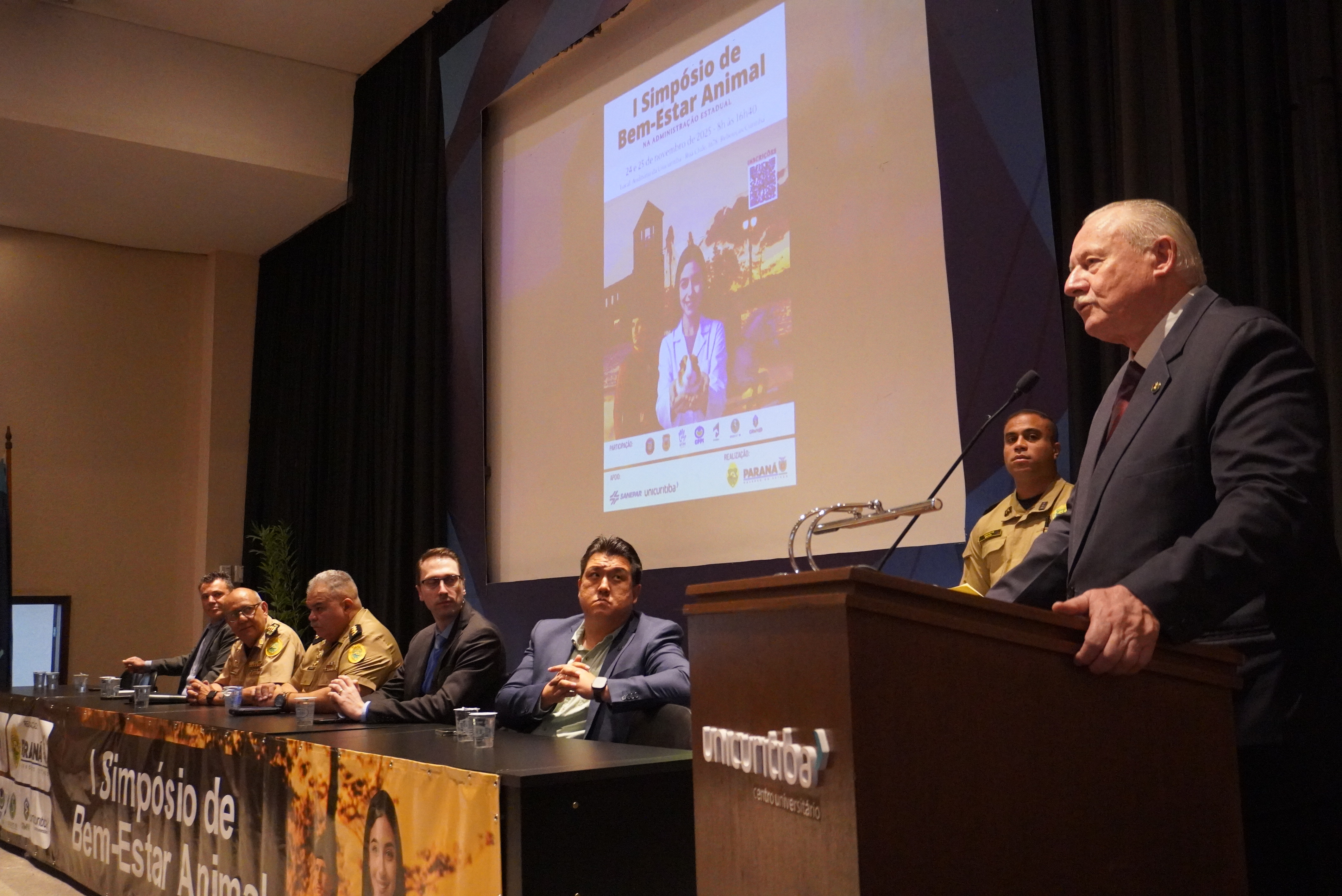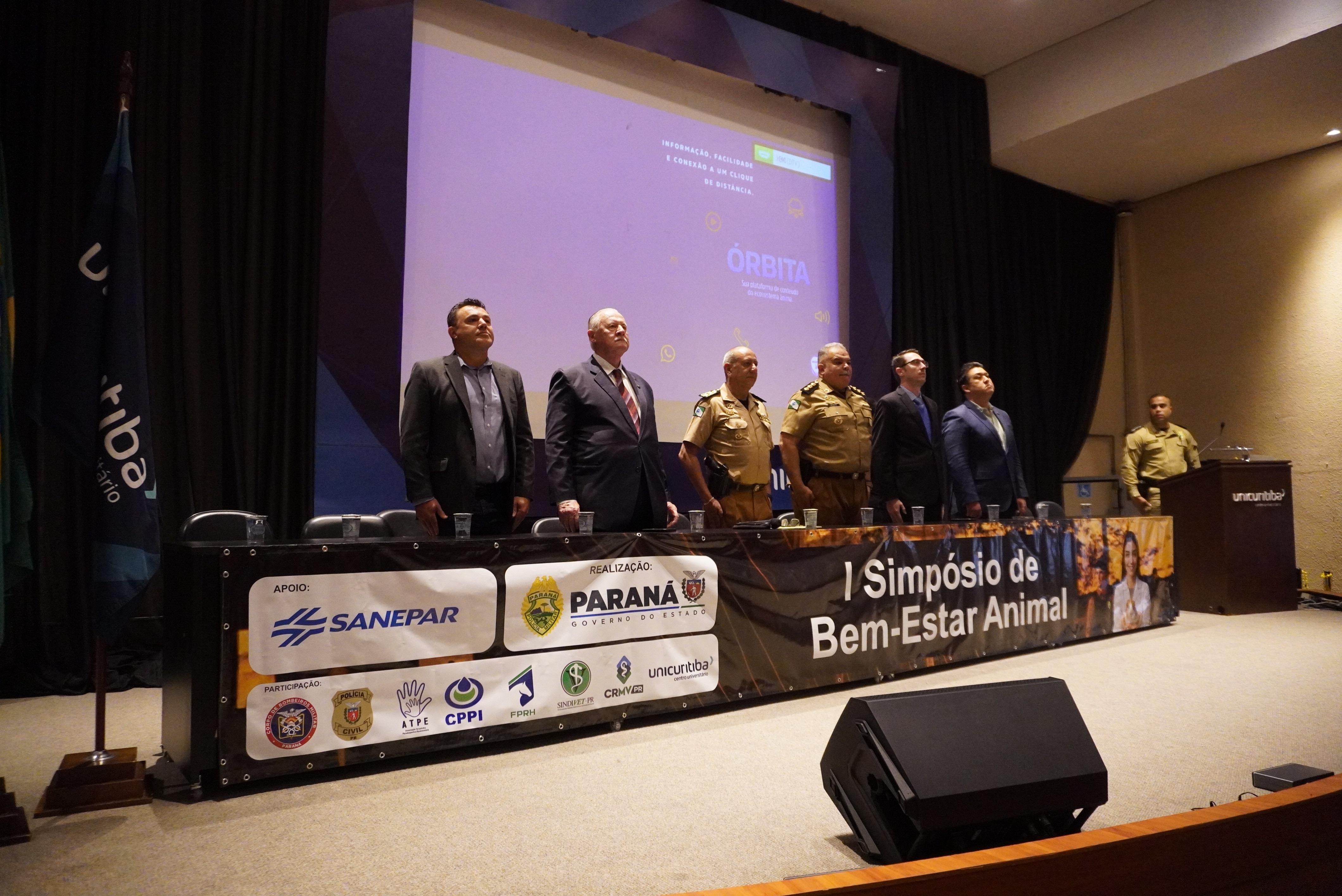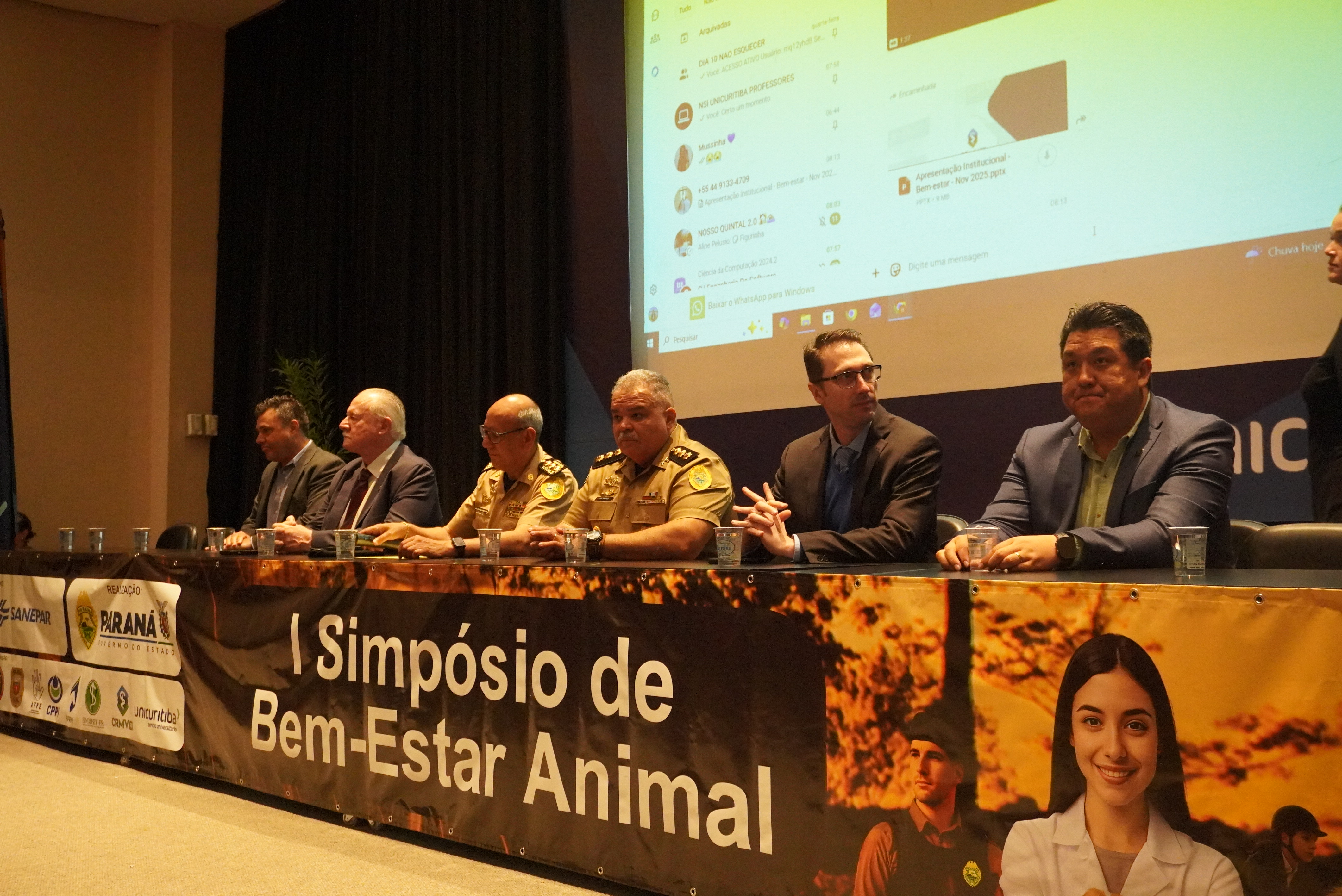 A Polícia Militar do Paraná realizou, na manhã desta segunda-feira, a abertura do I Simpósio de Bem-Estar Animal, promovido com o objetivo de fortalecer práticas responsáveis, técnicas atualizadas e políticas institucionais voltadas ao cuidado e à proteção dos animais empregados nas atividades de segurança pública. O encontro ocorreu nas dependências da UniCuritiba e contou com a presença do Chefe do Estado-Maior da PMPR, coronel Paulo Roberto Lima, que representou o Comando da corporação e destacou a importância da iniciativa para o aprimoramento das ações realizadas pelas unidades especializadas.