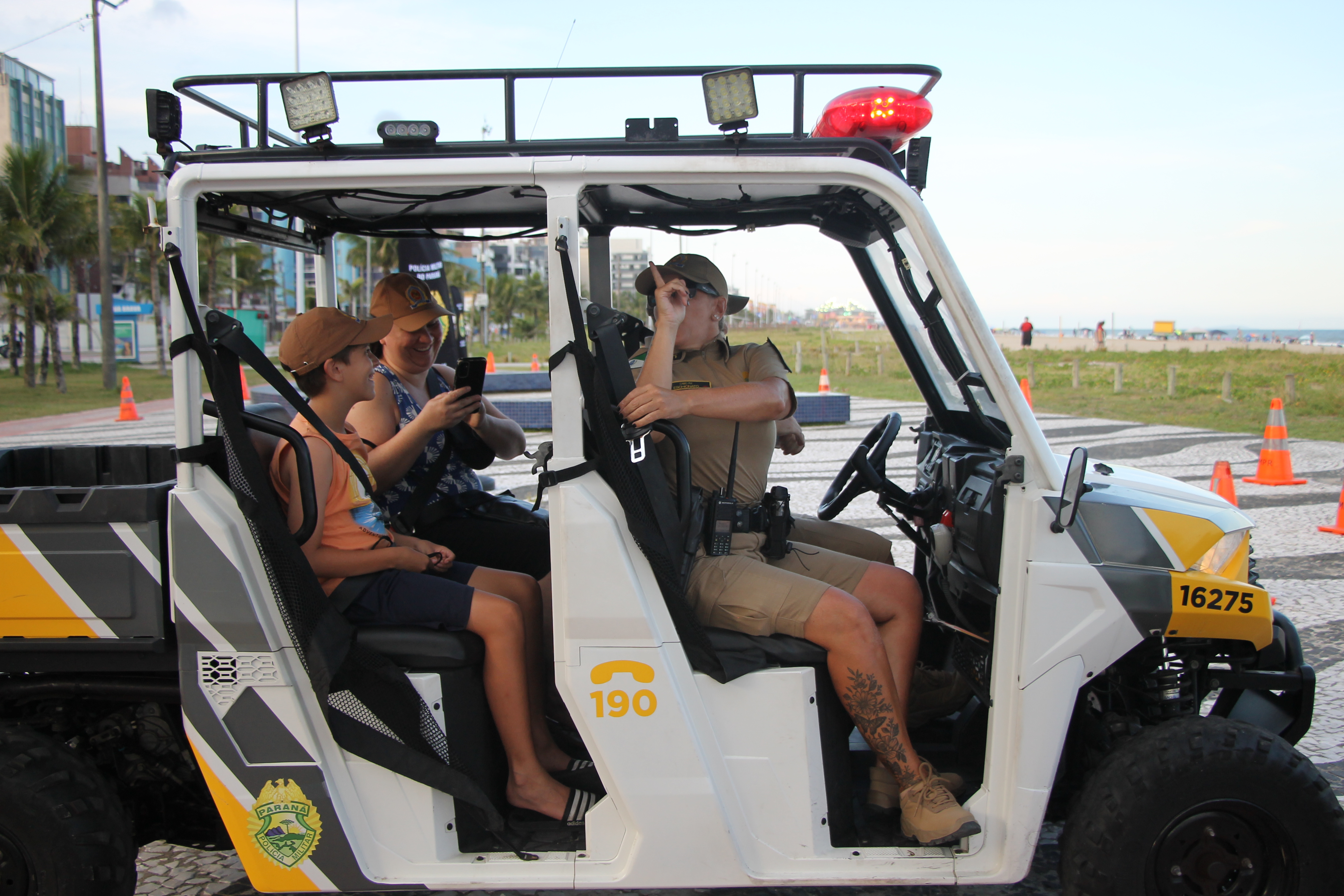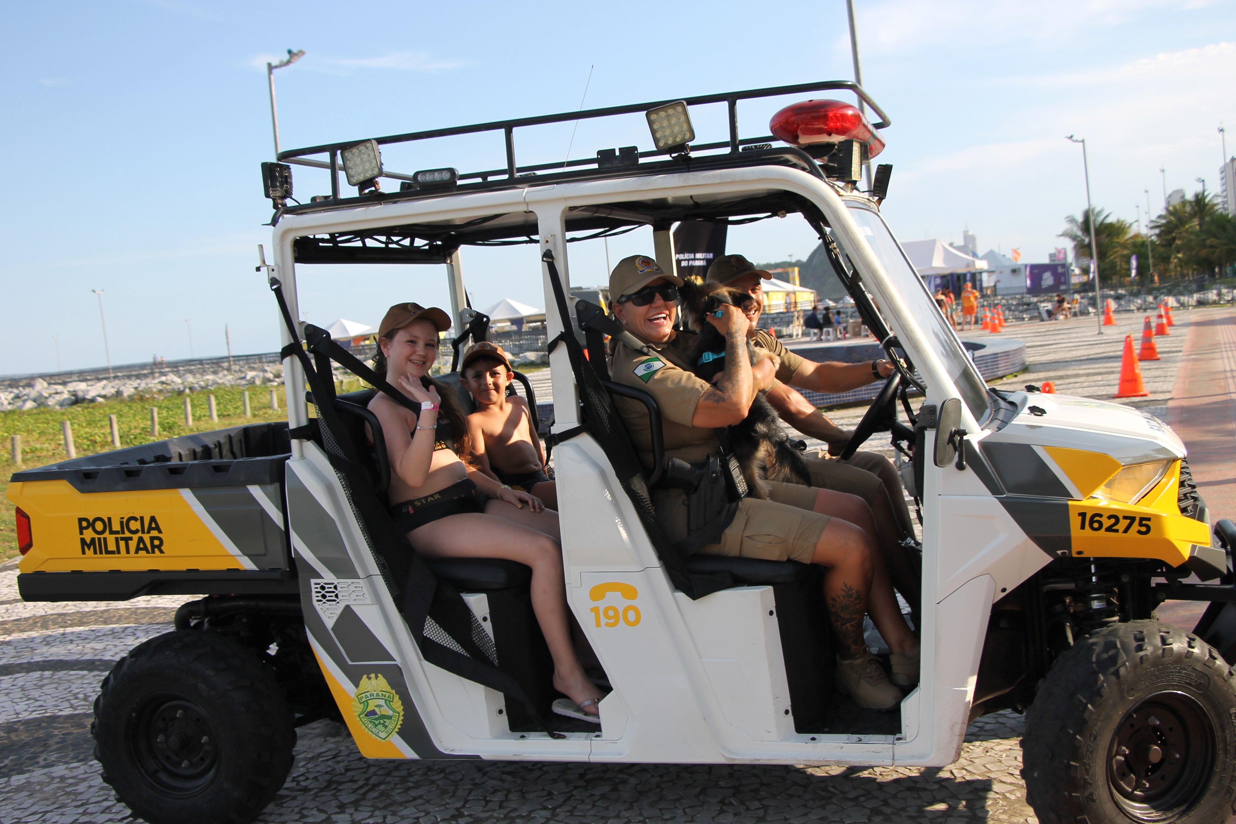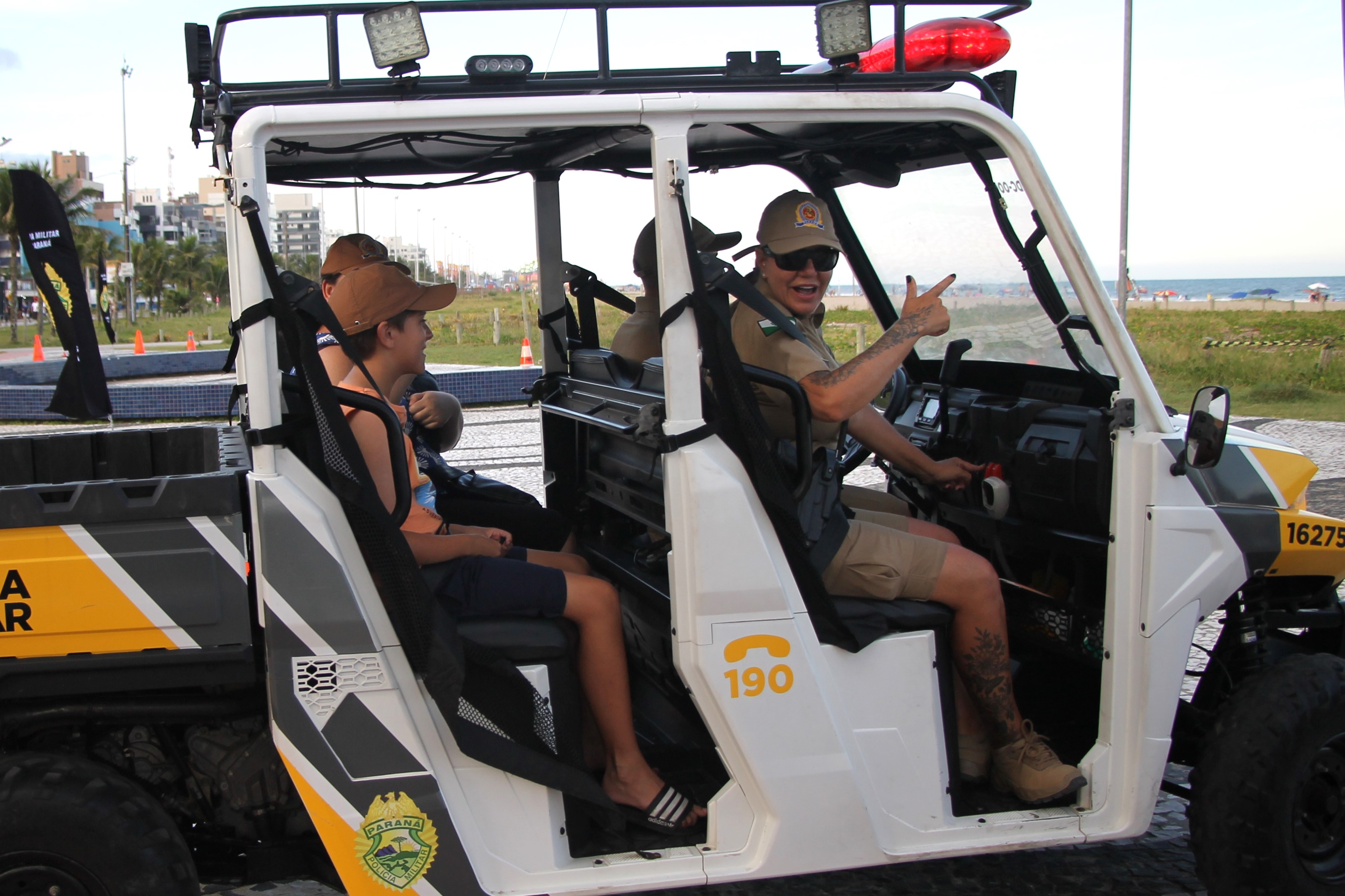 Sirene tocou, giroflex não assustou, pelo contrário, arrancou risadas! Nesta quarta-feira (28), no Molhe de Matinhos, a “Voltinha UTV PMPR” transformou o policiamento ostensivo em um verdadeiro momento de aproximação, aprendizado e diversão no litoral paranaense, especialmente para as crianças e suas famílias que aproveitam as praias do Estado.