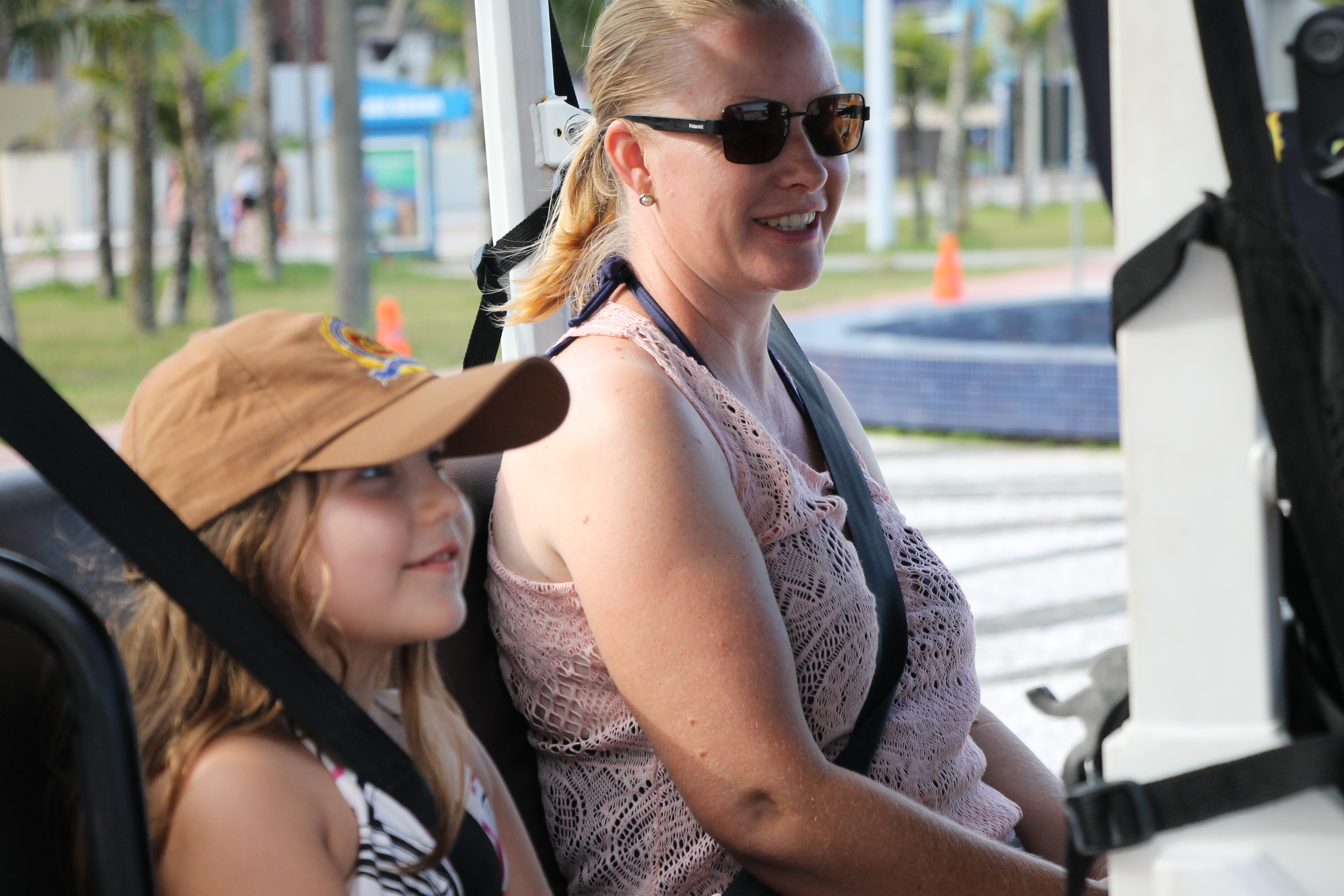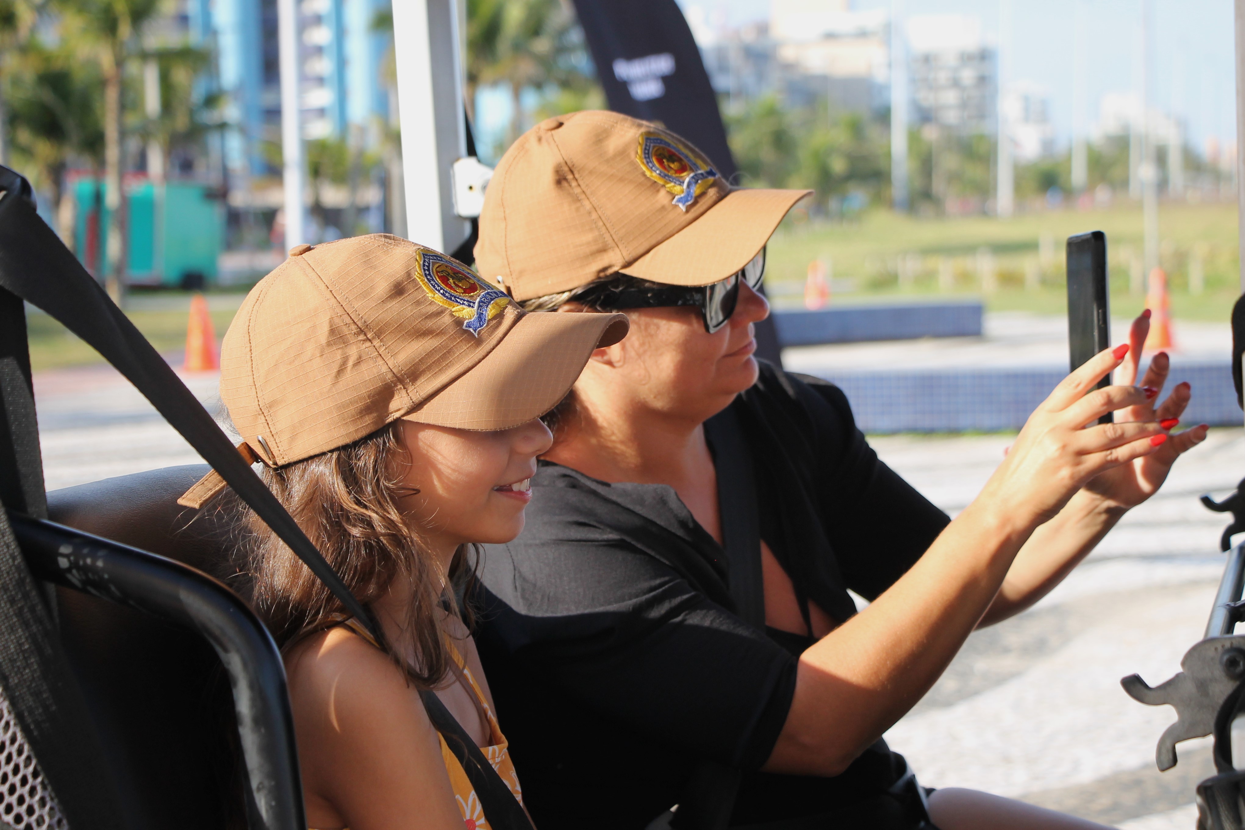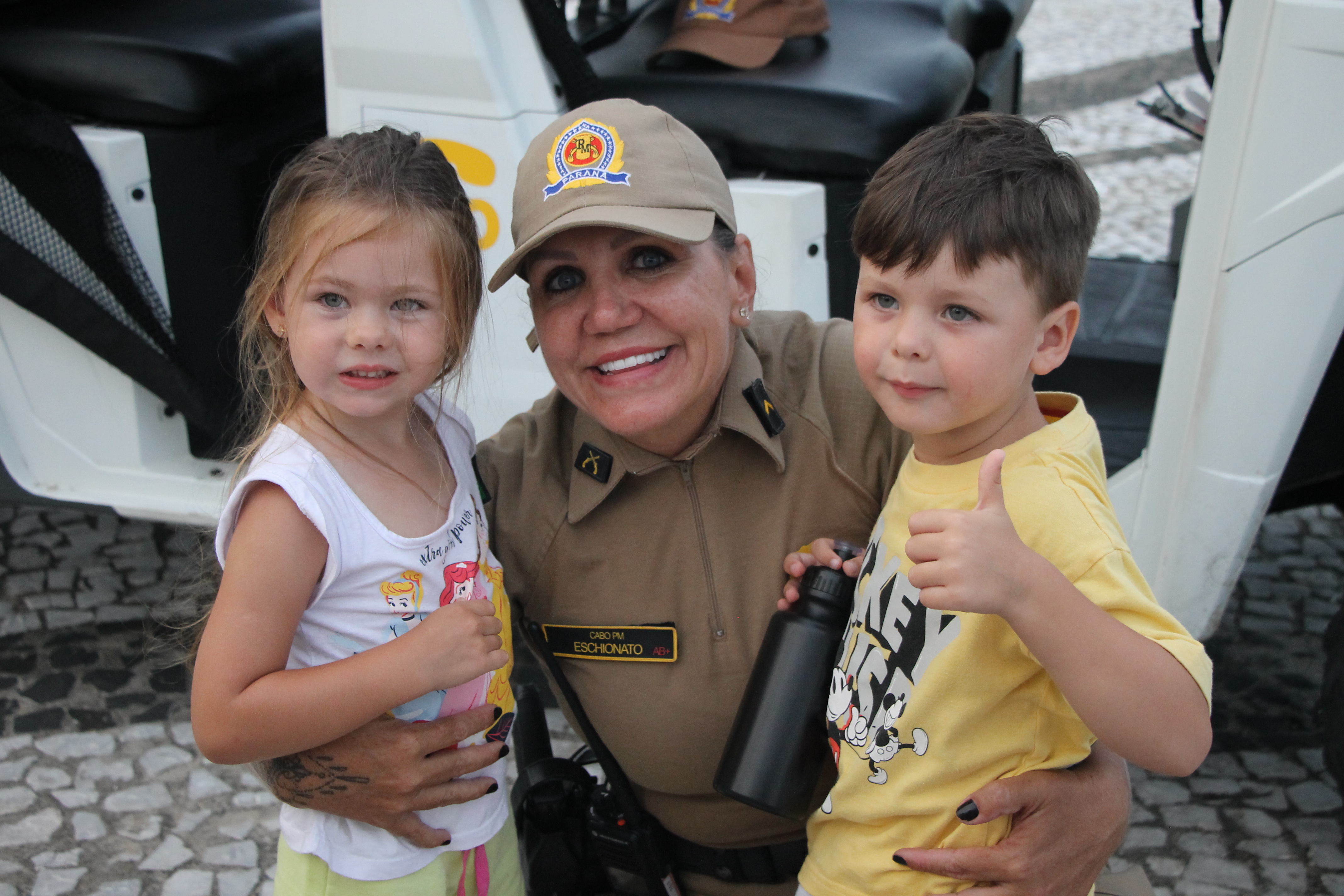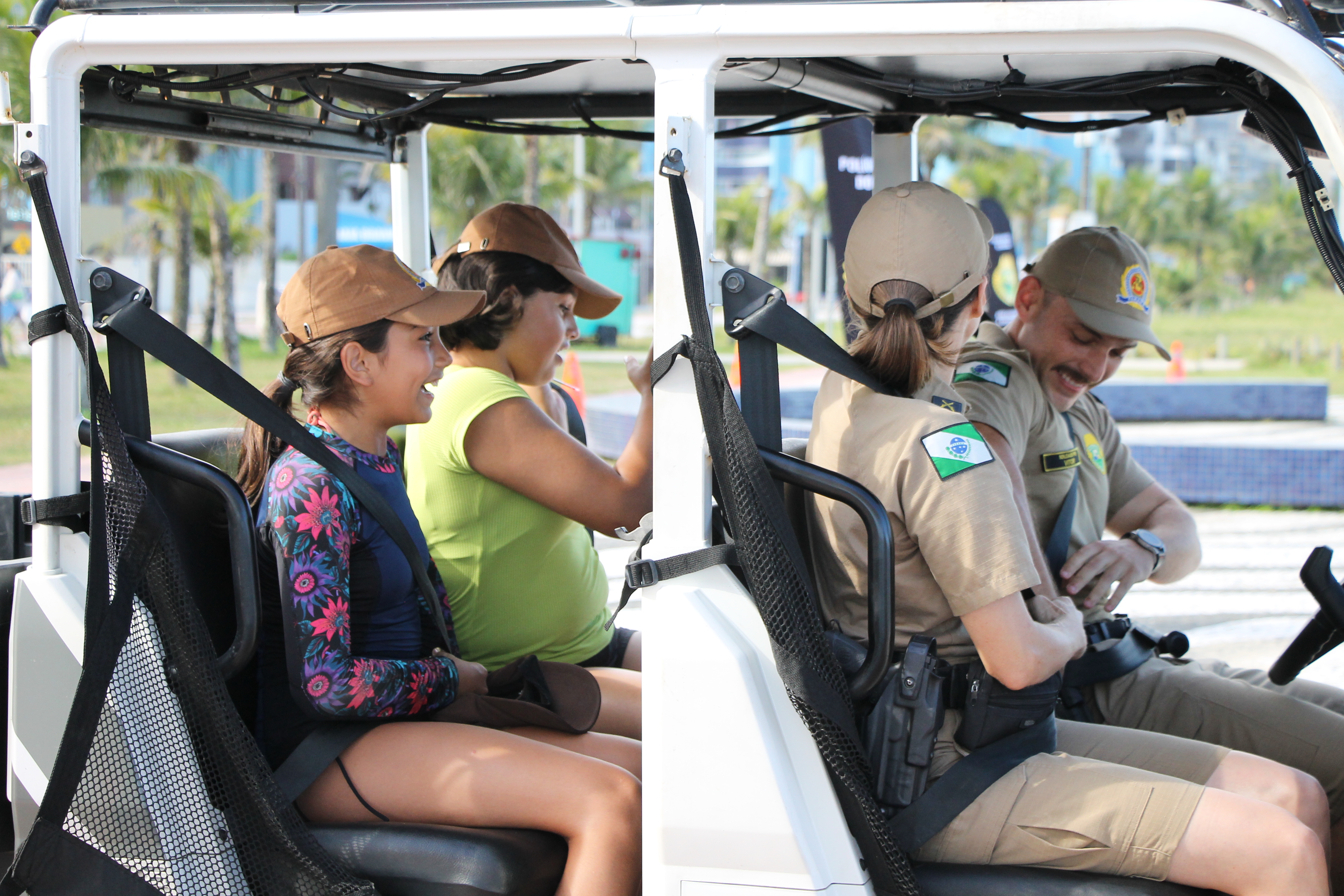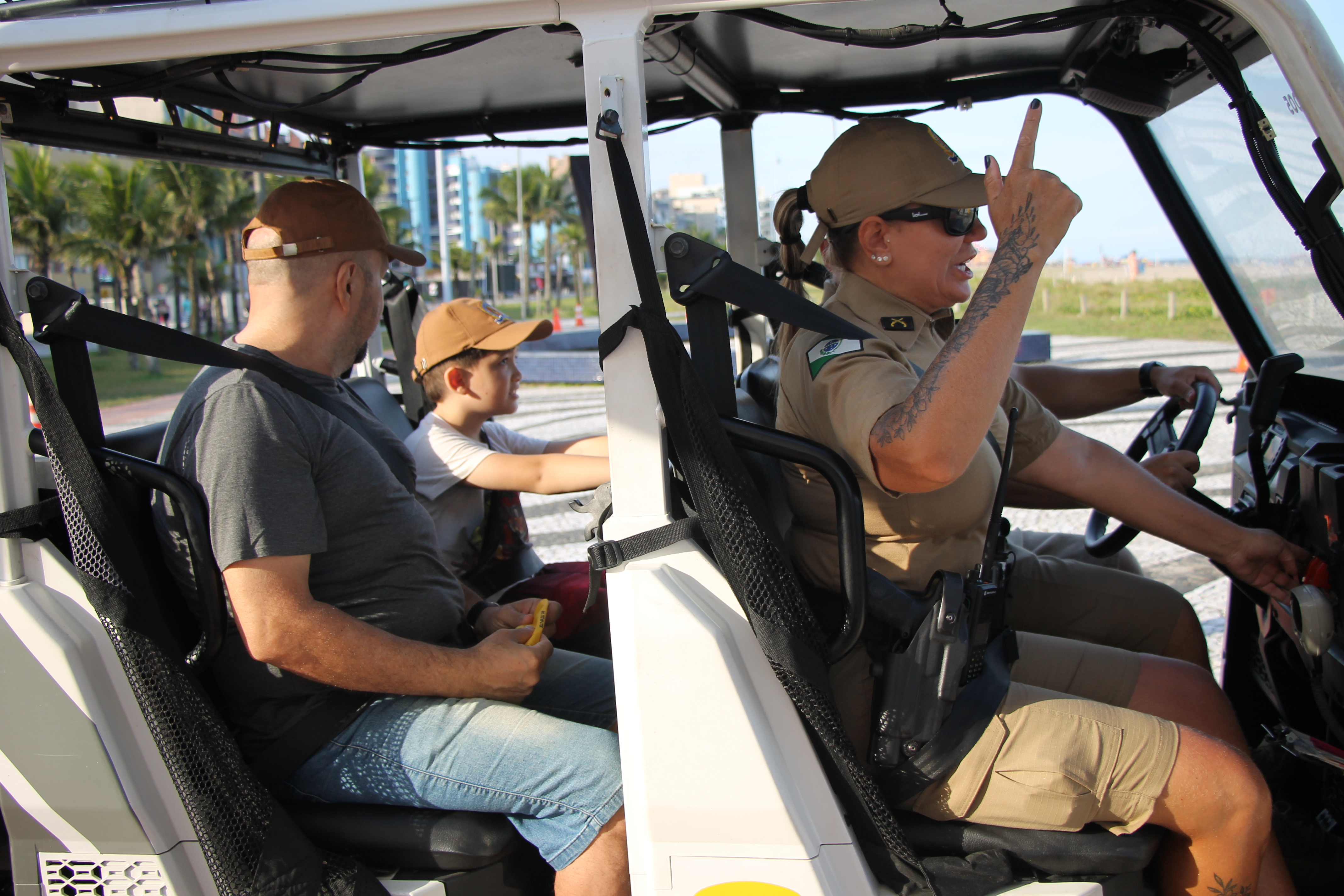Com o cinto devidamente afivelado, os pequenos embarcam nos UTVs para um percurso curto, cuidadosamente sinalizado com cones, garantindo total segurança. Durante o trajeto, os policiais conversam, brincam e reforçam mensagens importantes, mostrando que segurança também pode ser divertida.