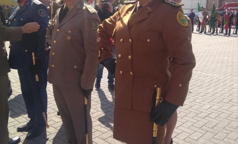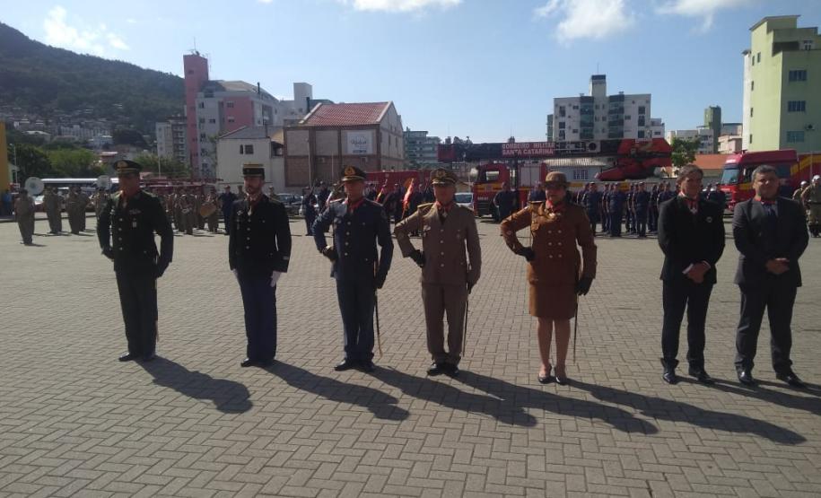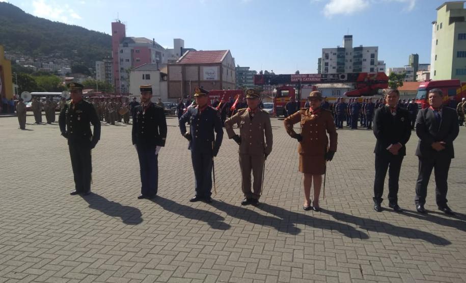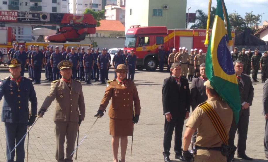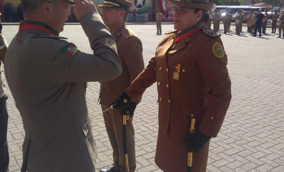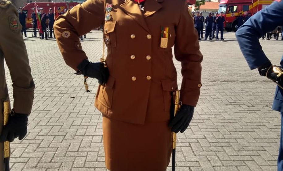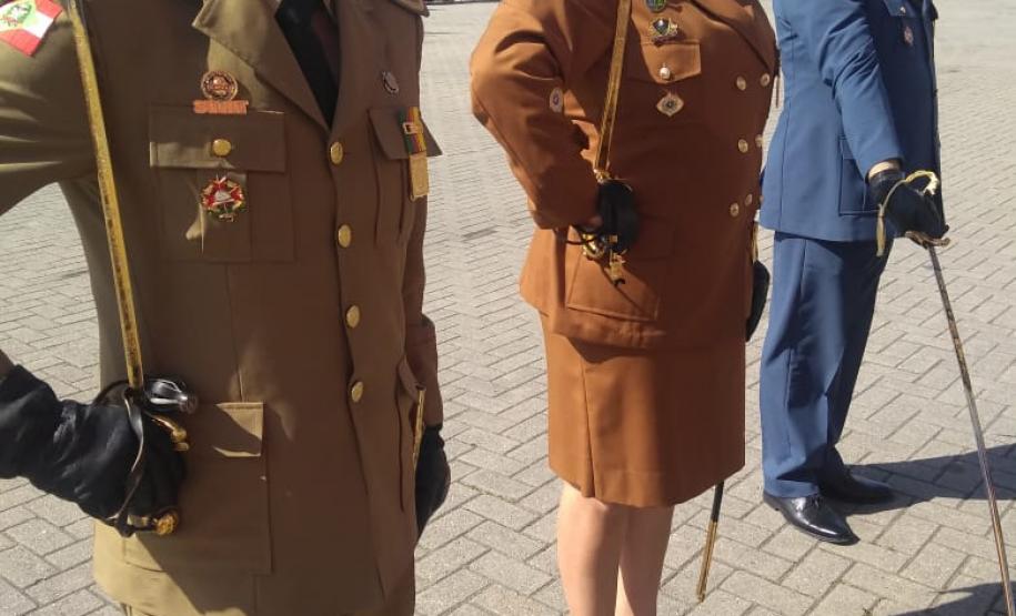 A coronel Audilene foi convidada para prestigiar a cerimônia organizada pela Polícia Militar e pelo Corpo de Bombeiros catarinenses em razão do Dia de Santa Catarina, data tradicional no estado em que são feitos festejos à padroeira Santa Catarina.
