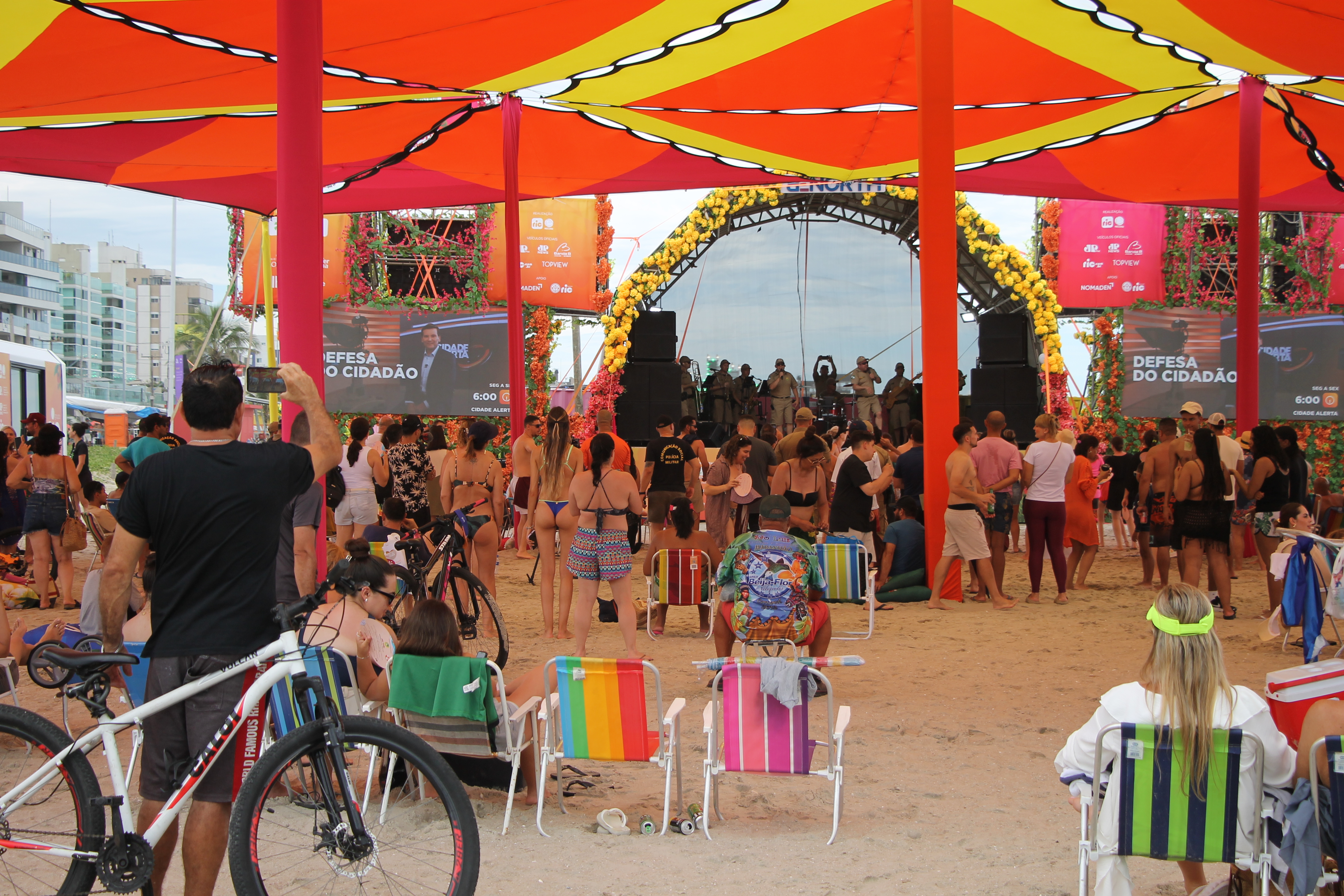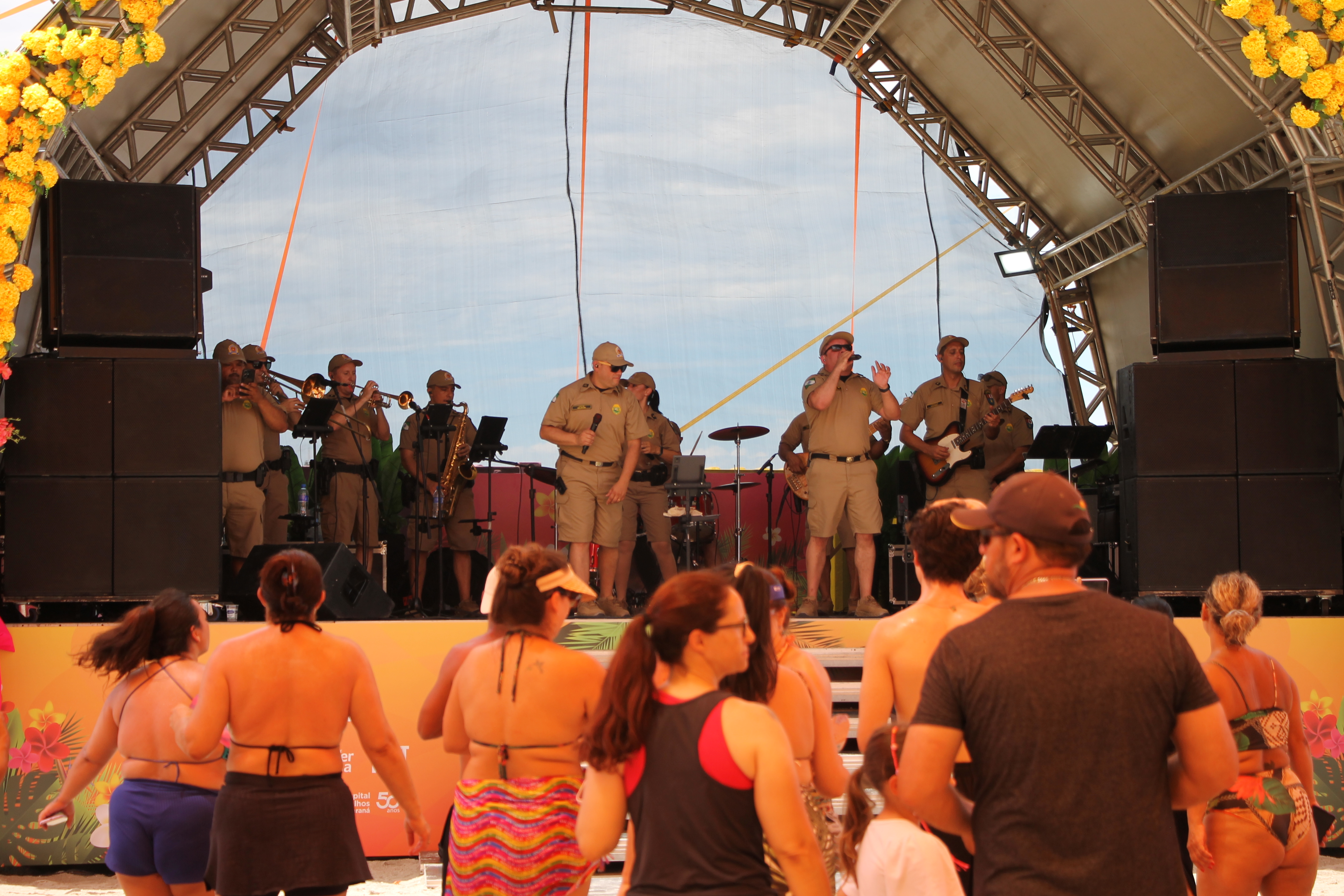 A Arena Mundo RIC, instalada na Avenida Atlântica, em frente ao SESC, no balneário de Caiobá, em Matinhos, viveu um domingo especial (11) com a estreia da Banda de Música da Polícia Militar do Paraná (PMPR) em seu palco principal. O Comandante-Geral da PMPR, Coronel Jefferson Silva, prestigiou a apresentação que marcou mais um momento de integração entre a Corporação e a comunidade, levando música e alegria aos veranistas que aproveitam o litoral paranaense.