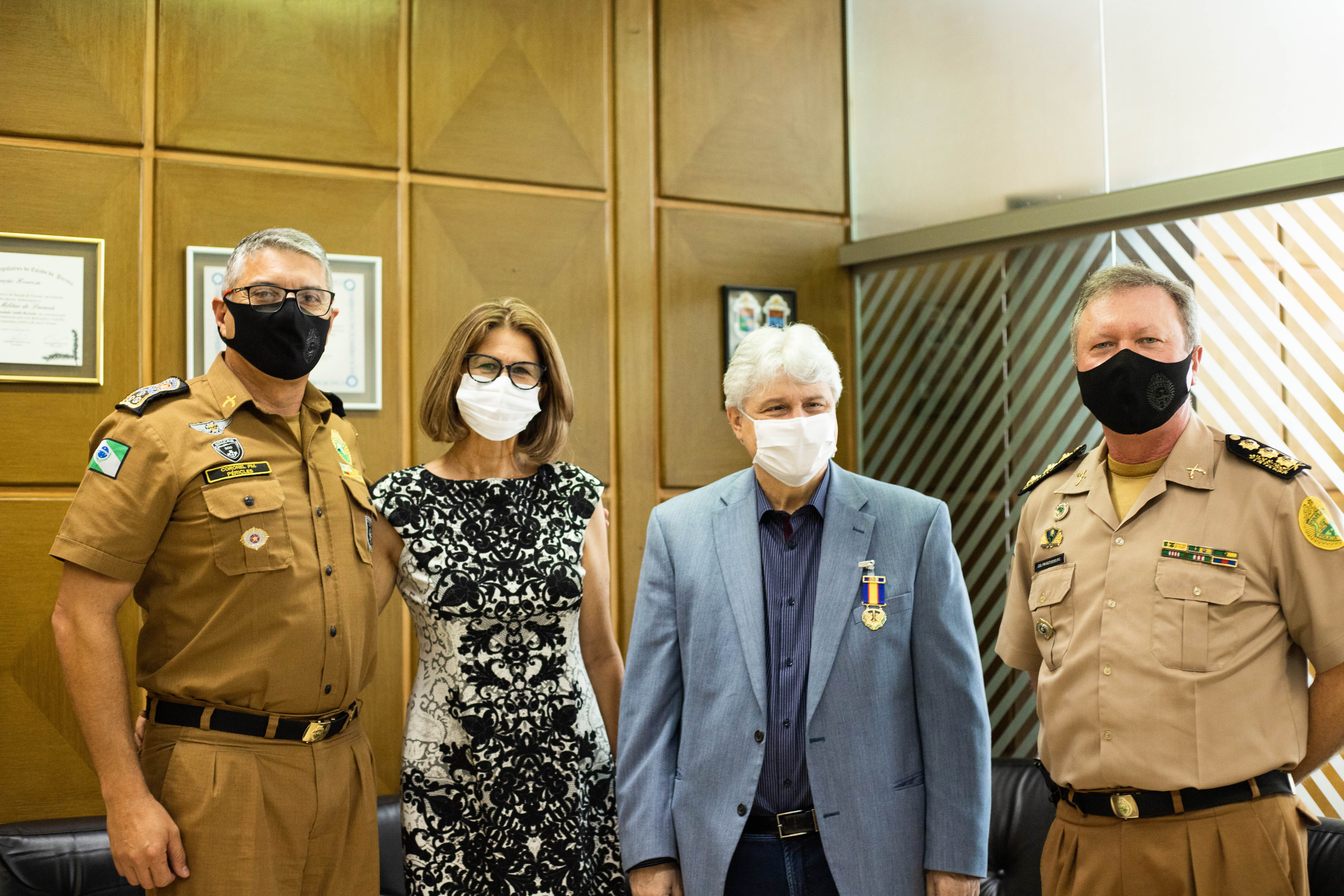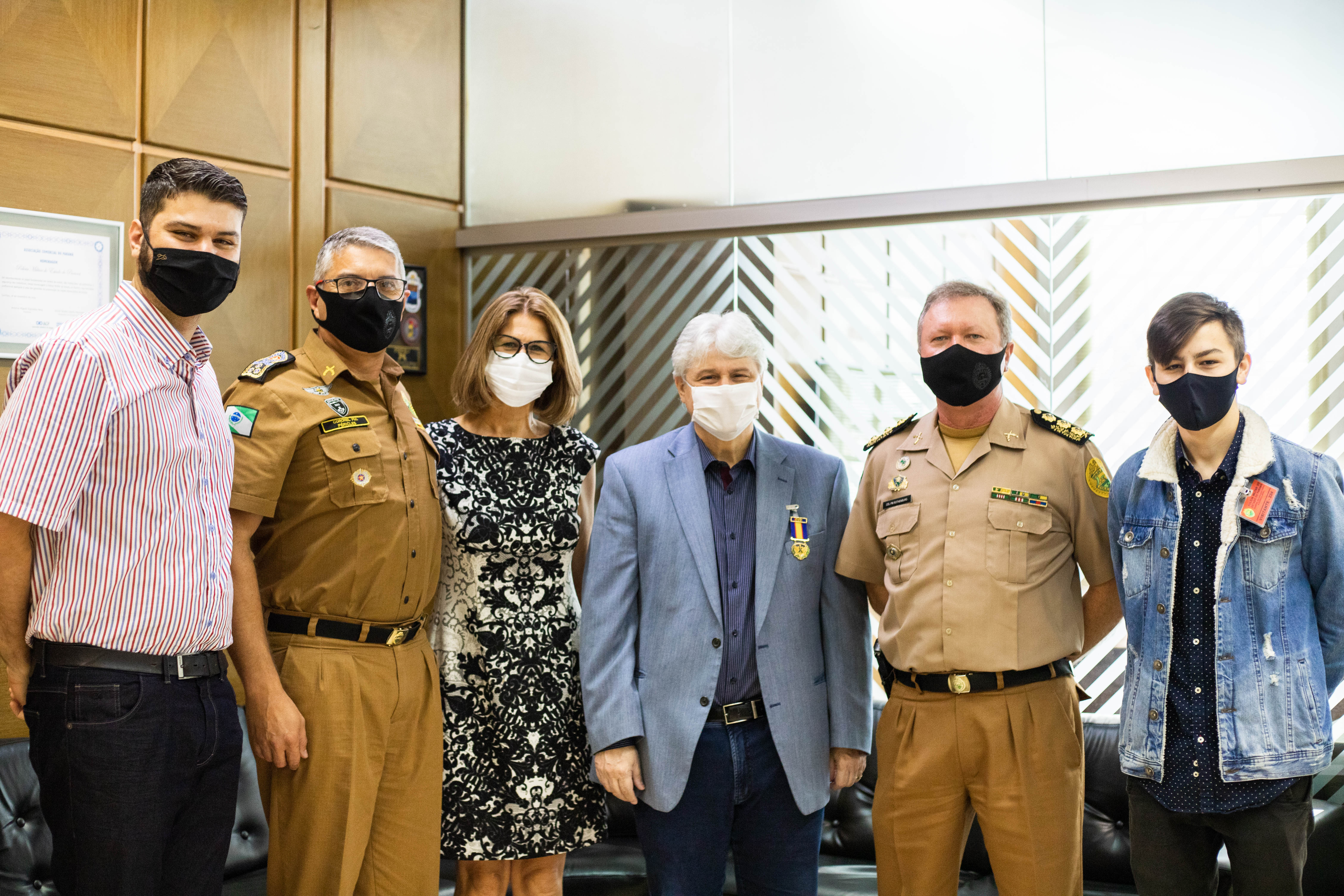 Estiveram presentes, também, na entrega da medalha, o Coronel Rothenburg, Chefe do Estado Maior da PMPR; a senhora Eliane Matos, psicóloga; Gabriel Matos, jurista; e Guilherme Ferreira Kilter, Supervisor de Universitários da PIB.