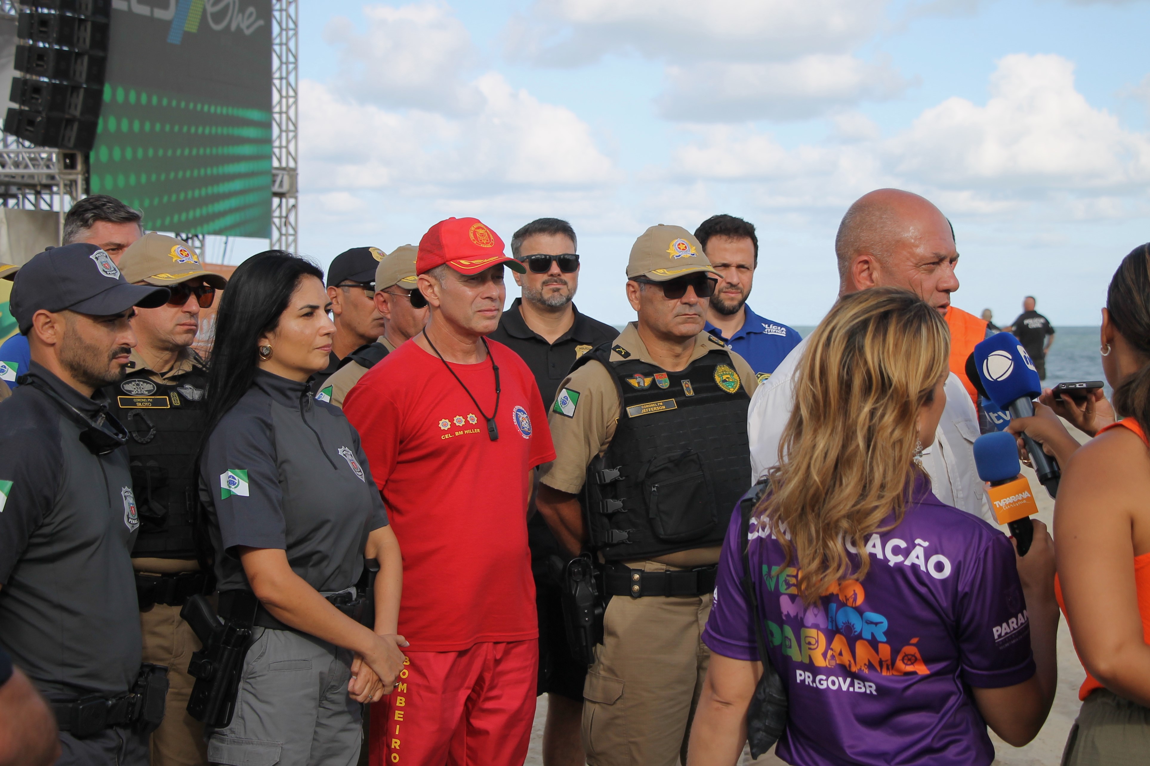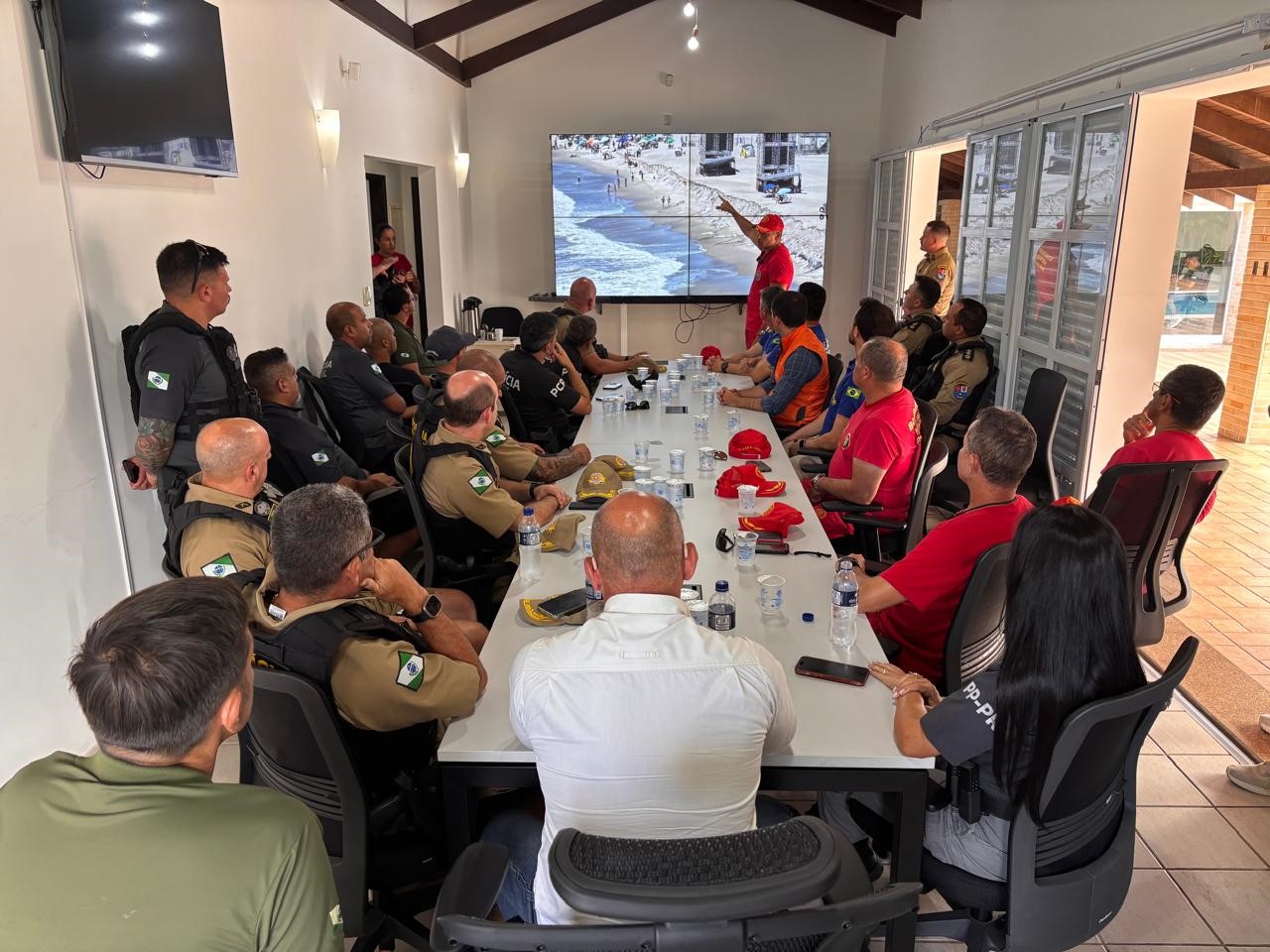 Nesta quinta-feira (22), em Matinhos, os representantes das forças de segurança pública do Paraná se reuniram com o secretário de Estado da Segurança Pública, coronel Hudson Leôncio Teixeira, para alinhar as estratégias de atuação durante os shows do Verão Maior Paraná que acontecem neste final de semana em Matinhos e Pontal do Paraná.