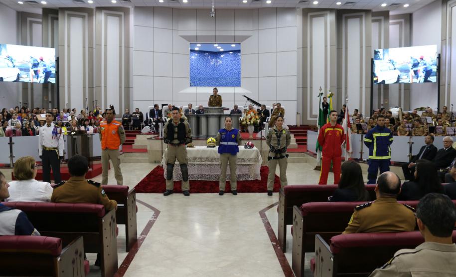 Representando as modalidades de socorro que o Corpo de Bombeiros desenvolve em todo o estado (salva vidas, incêndio ambiental, vistorias, combate a incêndio, resgate em altura, atividade de mergulho, atendimento pré-hospitalar, defesa civil, socorro tático e escolas de aperfeiçoamento de bombeiros), uma tropa representativa esteve no culto e recebeu a benção dos pastores.