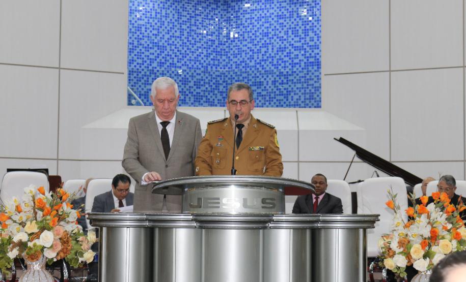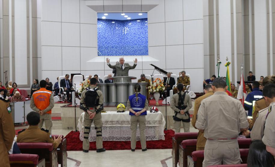 A Igreja Evangélica Assembléia de Deus recebeu na terça-feira (09/10) integrantes do Corpo de Bombeiros do Paraná para a celebração do Culto de Ação de Graças pelos 106 anos da Instituição. O pastor Wagner Tadeu Gaby abençoou a tropa representativa da Corporação e também o Comandante do Corpo de Bombeiros, coronel Fábio Mariano de Oliveira.