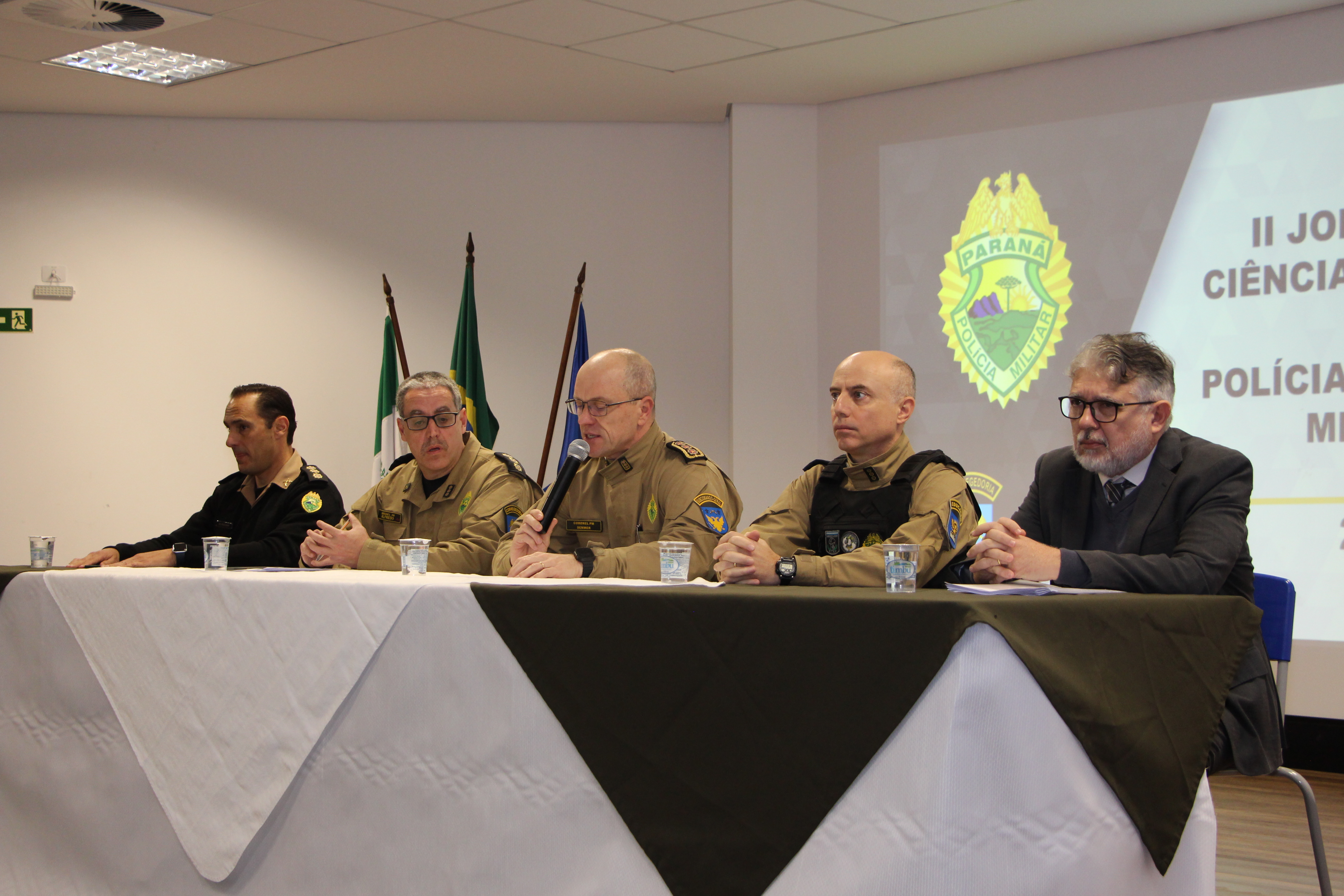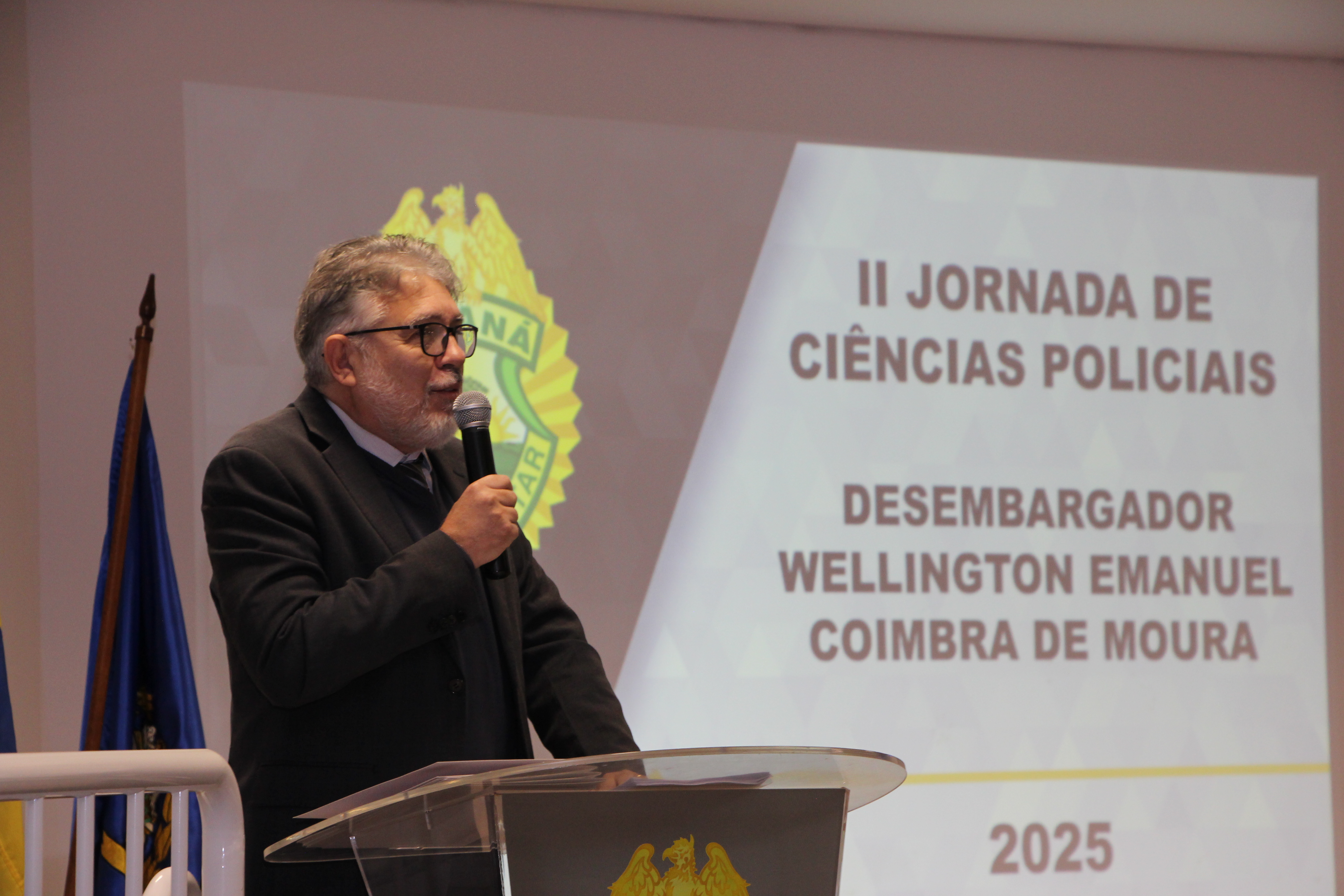 Nesta quinta-feira (23), a Polícia Militar do Paraná (PMPR), por meio da Corregedoria-Geral da corporação, deu início à II Jornada de Ciências Policiais – Polícia Judiciária Militar, evento voltado ao aprimoramento técnico e jurídico de oficiais e praças em todo o Estado. A cerimônia de abertura contou com a presença do Comandante-Geral em exercício da PMPR, coronel Paulo Henrique Semmer; do Corregedor-Geral, coronel Alfredo Euclides Dias Netto; do Desembargador do Tribunal de Justiça do Paraná, Wellington Emanuel Coimbra de Moura e de demais autoridades.