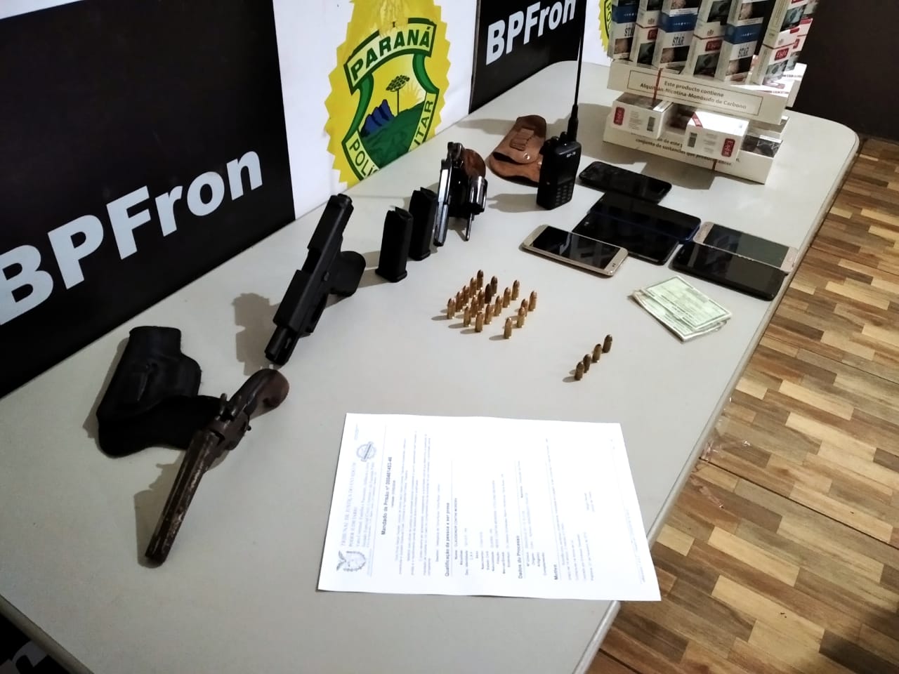 Por fim, a equipe policial estava em patrulhamento quando abordou um estabelecimento comercial e encontrou uma pistola, de calibre .380, um revólver, de calibre .357, e uma garrucha, além de munições, rádio HT, cigarros contrabandeados e um carro.