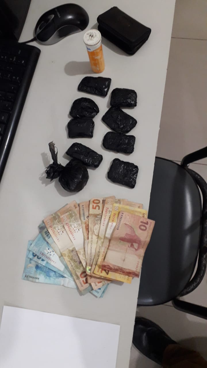 Durante o deslocamento da equipe à delegacia de Polícia Civil com o detido, próximo ao destacamento de Cubatão, um rapaz também conhecido no meio policial a partir de denúncias relacionadas ao tráfico de drogas foi abordado. Com ele, foram localizadas três porções de maconha em um pote, totalizando 6,1 gramas.
