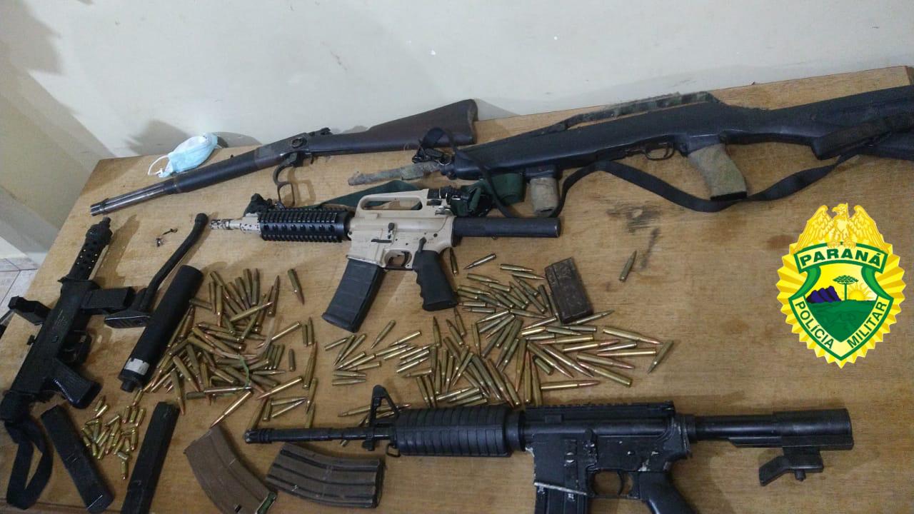 Destaque para abordagem realizada em Santo Antônio da Platina-PR nesta madrugada, por policiais militares do 2º batalhão, a um veículo após acompanhamento tático, onde foram apreendidas 5 armas longas sendo 02 fuzis calibre .556, 01 carabina calibre .30, 01 carabina puma e 01 submetralhadora, além de várias munições. O condutor do veículo foi preso.
