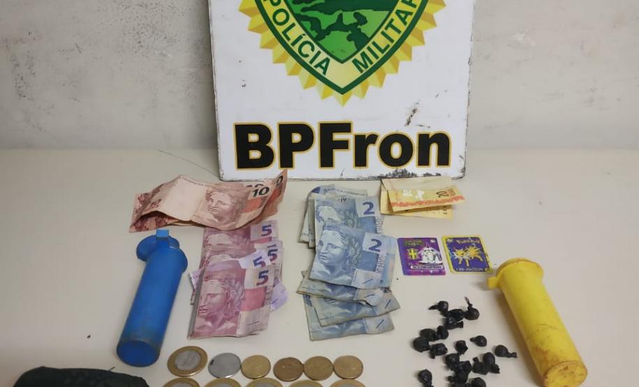 Na mesma cidade, no domingo (14/04), os militares do BPFron apreenderam 54 buchas de cocaína no Jardim Jupira, onde um homem, de 24 anos, ao perceber a presença policial, dispensou um objeto. Durante a abordagem foi localizado dinheiro e, ao ser verificado, foi constatado que se tratava de dois tubos amarelos com a droga.