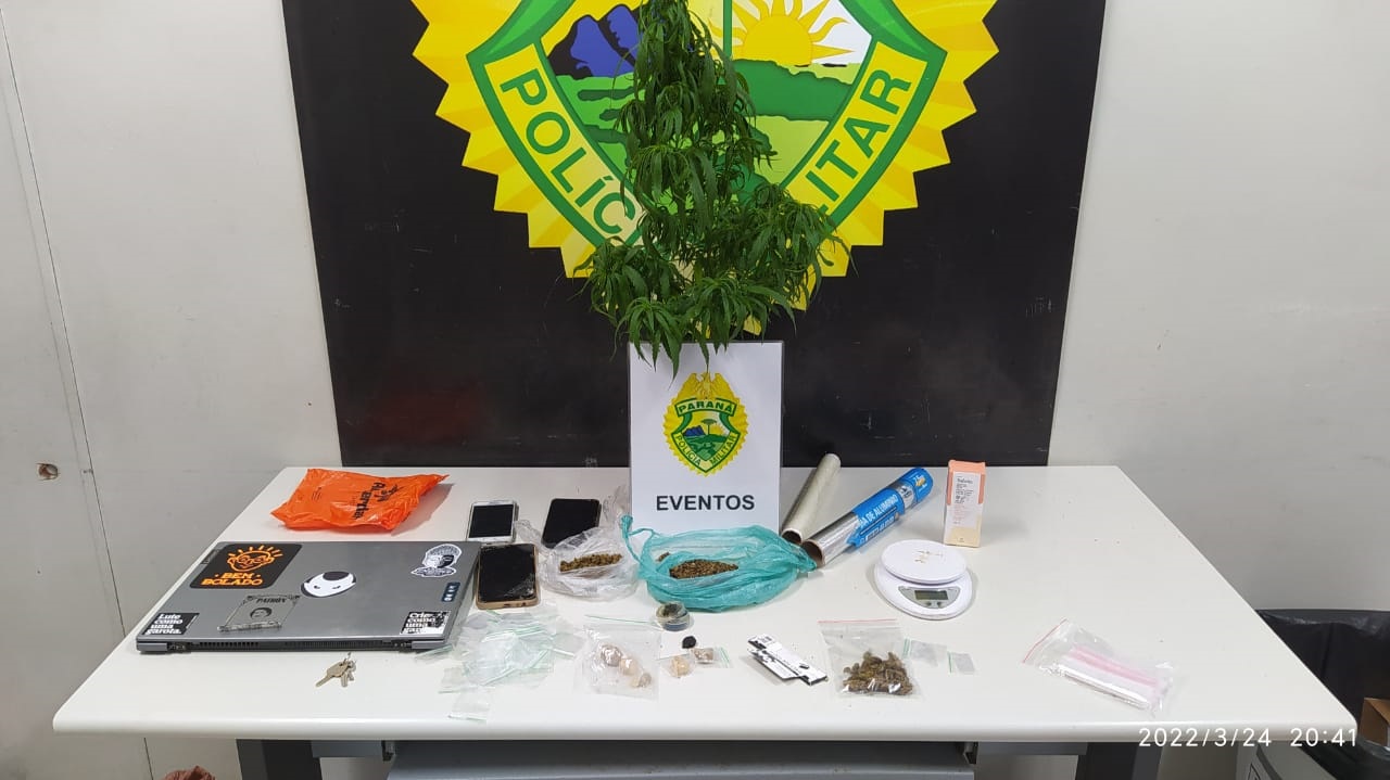 No local informado, foram abordados um homem de 27 anos e uma mulher de 21. Com eles foram encontrados 32 gramas de maconha, 4 unidades de drogas sintéticas pesando aproximadamente 19 gramas, uma planta similar a pé de maconha além de uma balança de precisão e um notebook.