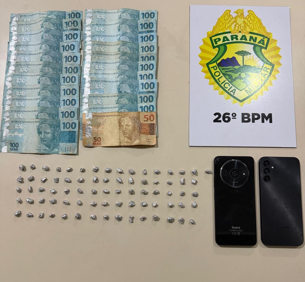 Em continuidade às buscas no interior da residência, os policiais localizaram outras porções da mesma substância escondidas em um móvel no quarto do suspeito, totalizando 76 pedras de crack, que somaram aproximadamente 15,4 gramas. Também foram apreendidos dois aparelhos celulares e a quantia de R$ 2.150,00 em dinheiro, cuja origem não foi comprovada.