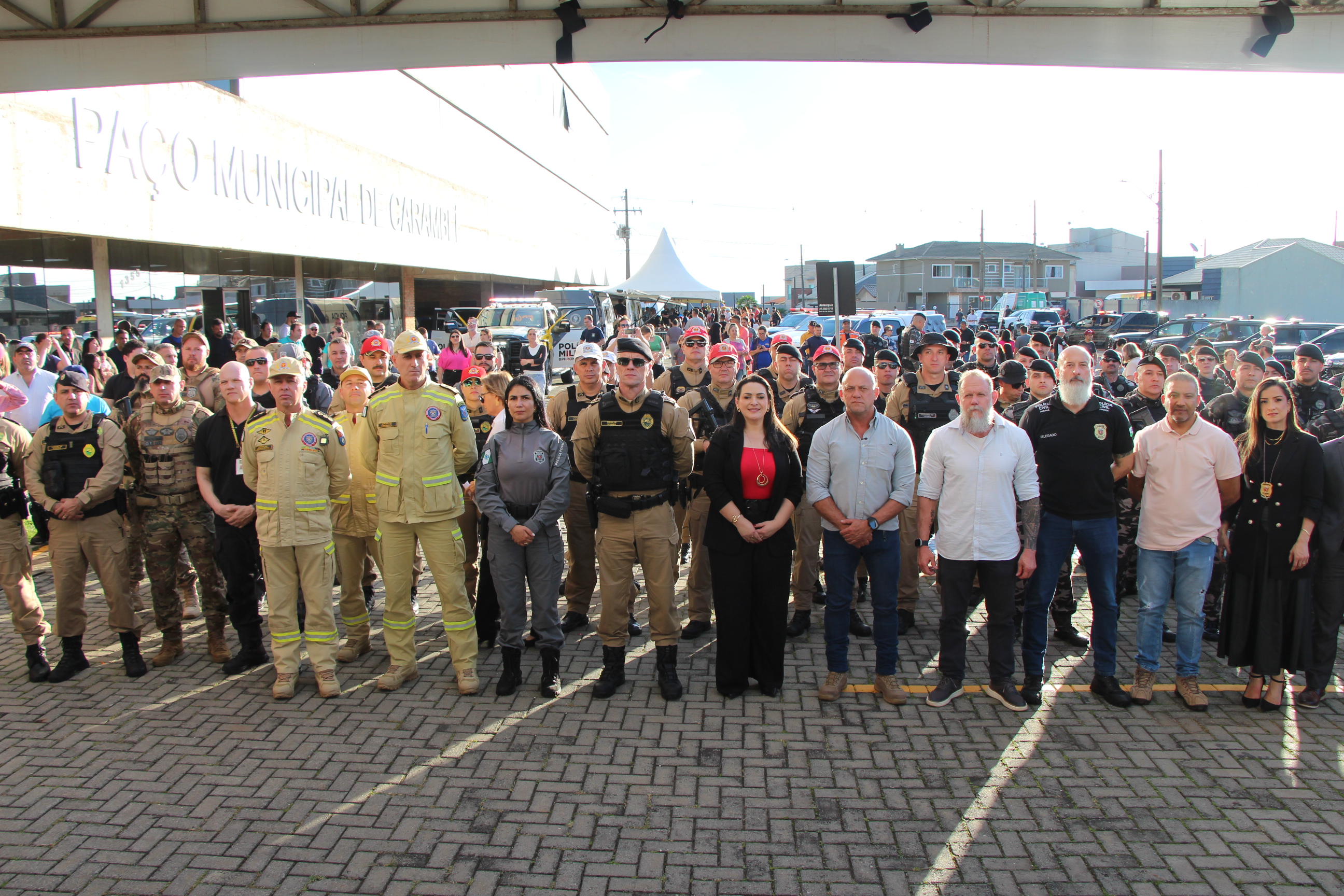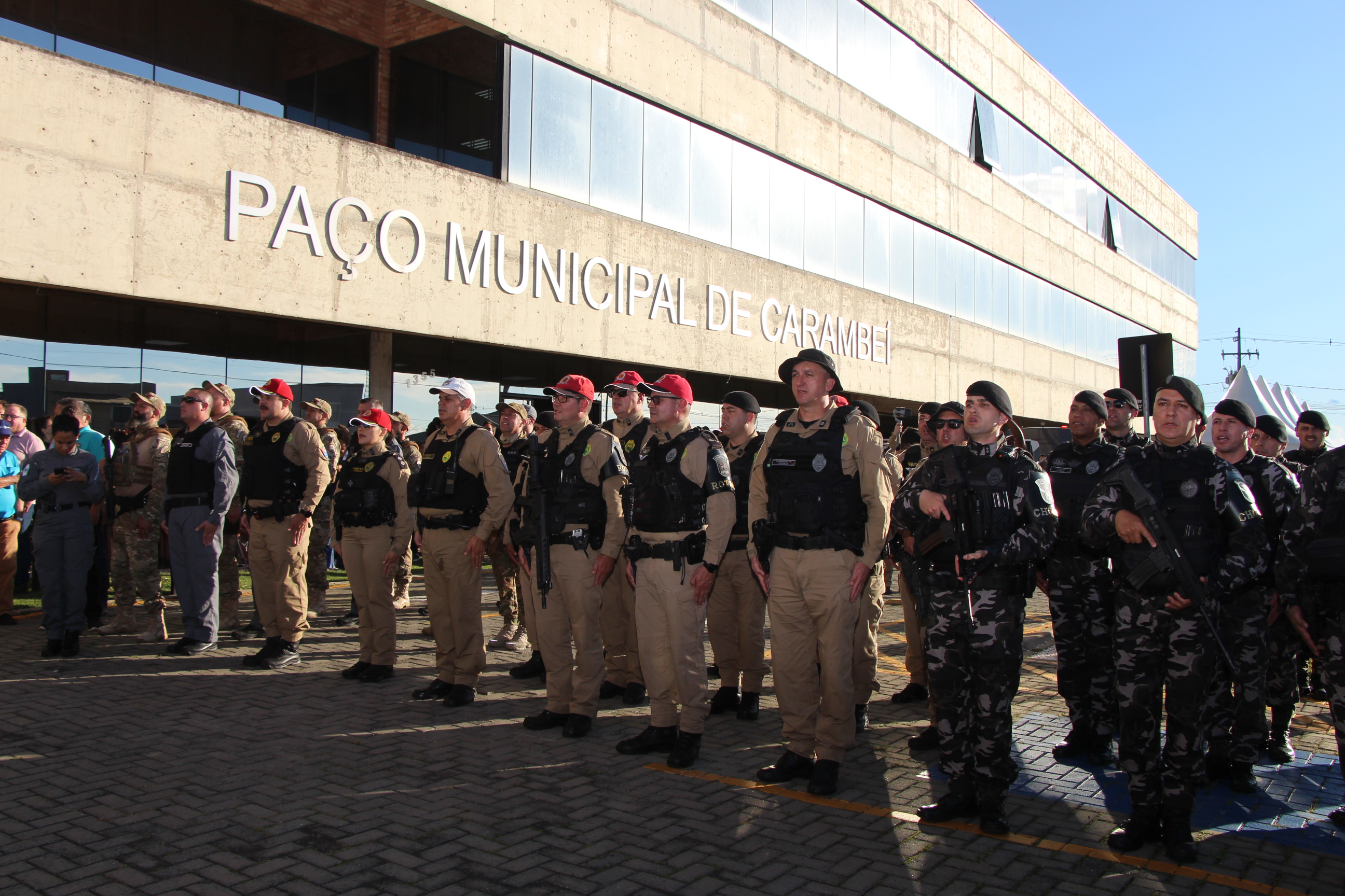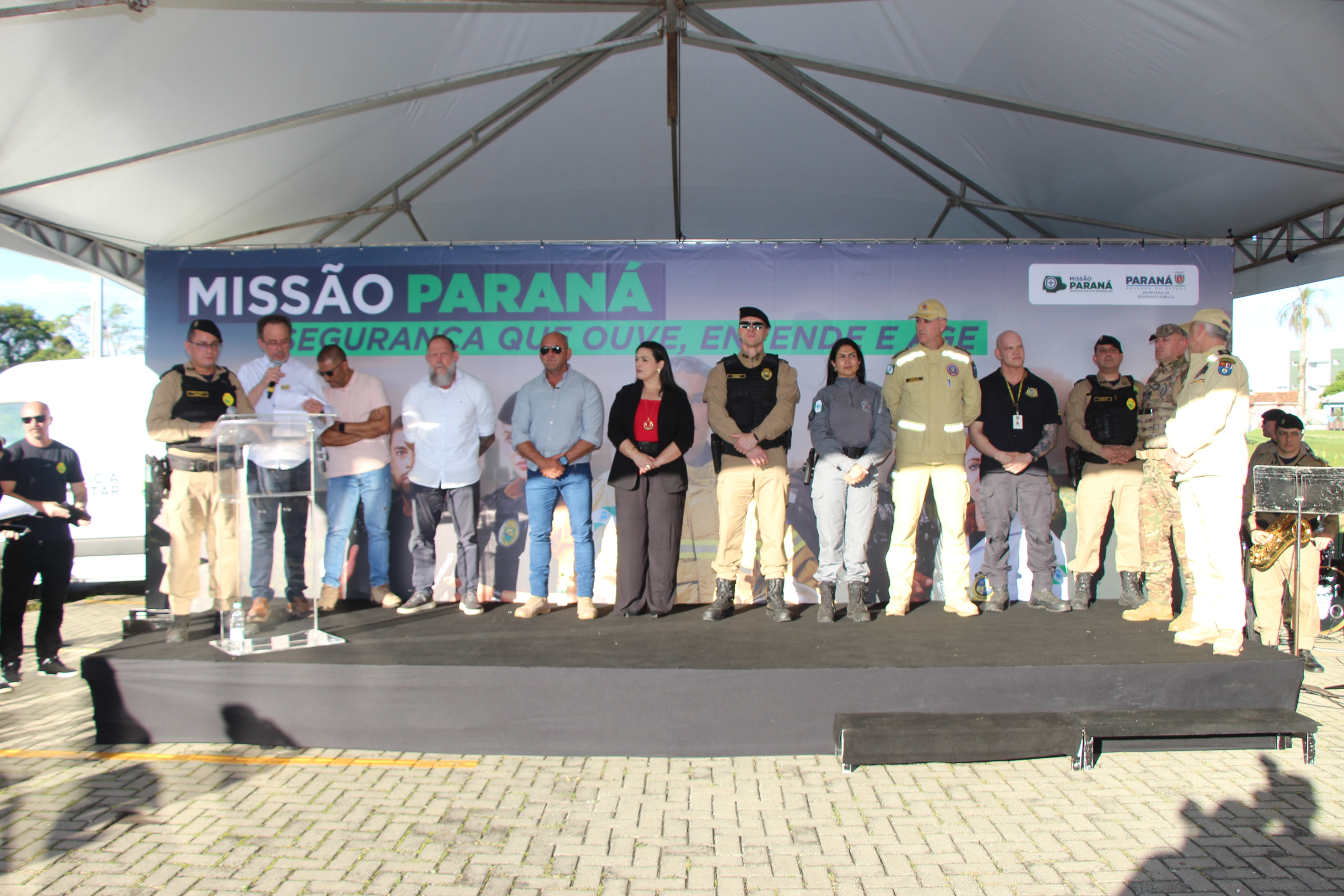 A Polícia Militar do Paraná participou, nesta terça-feira (4), do lançamento da Missão Paraná III – Operação Sinergia IV, realizado em frente ao Paço Municipal de Carambeí. A ação integra o conjunto de iniciativas voltadas ao fortalecimento da integração entre as forças de segurança e à aproximação com a comunidade e contou com a presença de autoridades civis e militares, entre elas a prefeita de Carambeí, Elizabeth Stroher, o Comandante-Geral em exercício da Polícia Militar do Paraná, coronel Paulo Henrique Semmer, e o Secretário da Segurança Pública do Paraná, coronel veterano Hudson Leôncio Teixeira, além de representantes da Polícia Civil, Polícia Científica, Polícia Penal, Corpo de Bombeiros Militar do Paraná e Guarda Municipal.