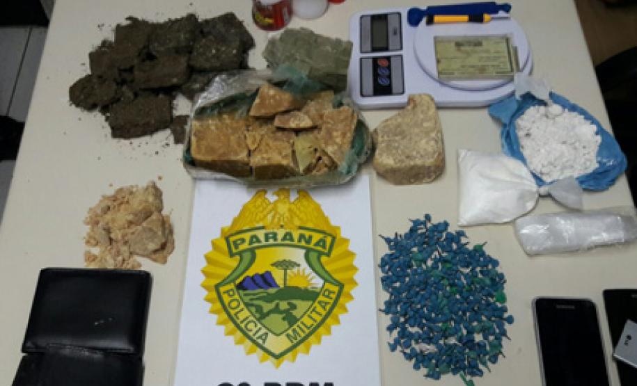Dentro do recipiente foi encontrada uma quantia de cocaína e na casa os policiais apreenderam, após buscas, uma mochila contendo uma balança de precisão, 432 gramas de maconha, 1,2 quilo de crack, 236 gramas de pasta base de cocaína, sacos plásticos para embalar droga e aparelhos celulares.