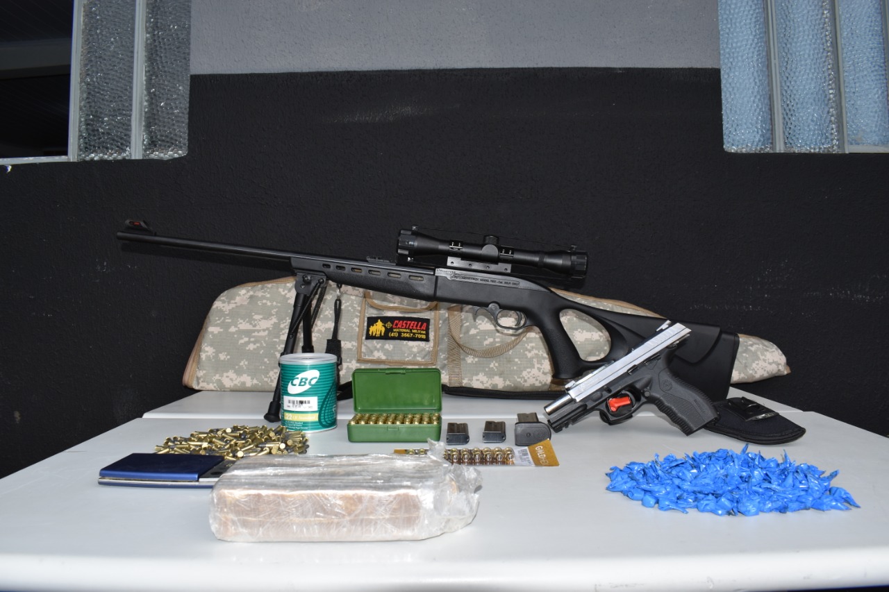 De acordo com o batalhão, foram apreendidos no total uma carabina calibre .22, uma pistola calibre .380, 260 munições, 55,7 g de maconha, 188 pedras de crack e um tablete de 1kg da mesma substância a qual poderia ser fracionada em mais de 3 mil pedras para consumo, o que resultaria em mais de 30 mil reais em lucro ao tráfico, além de outros objetos utilizados para o fracionamento das drogas.