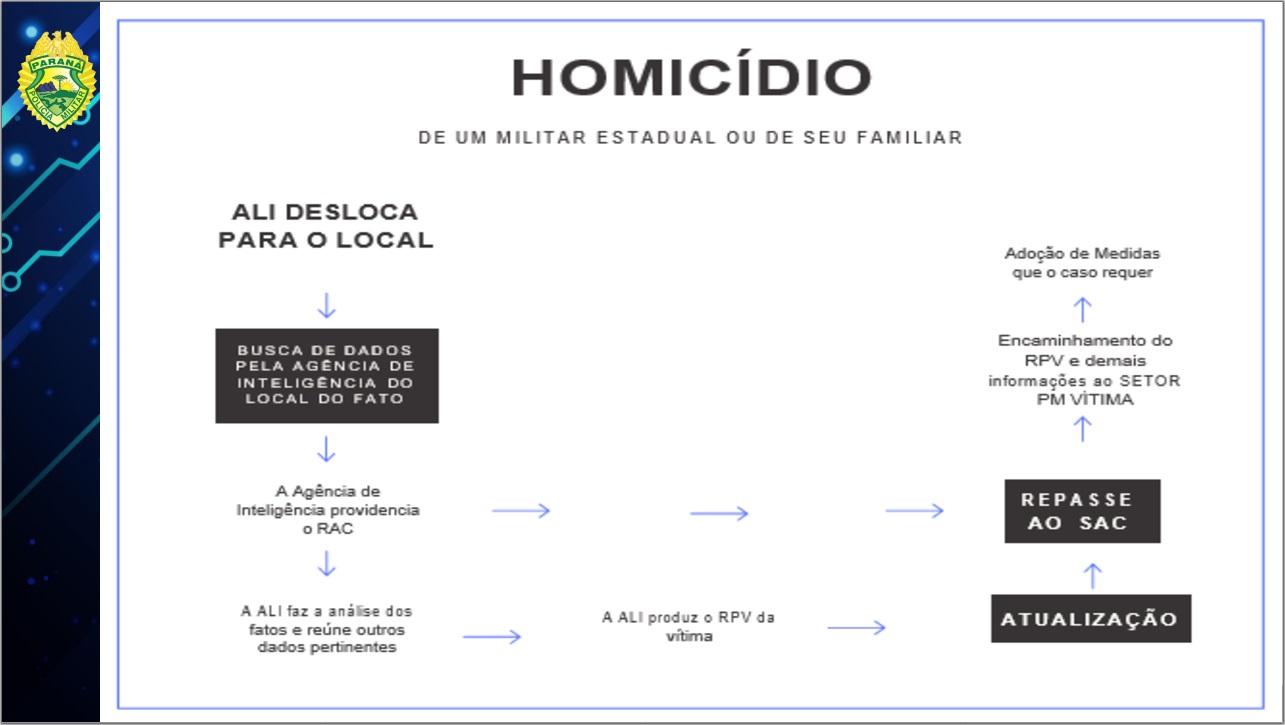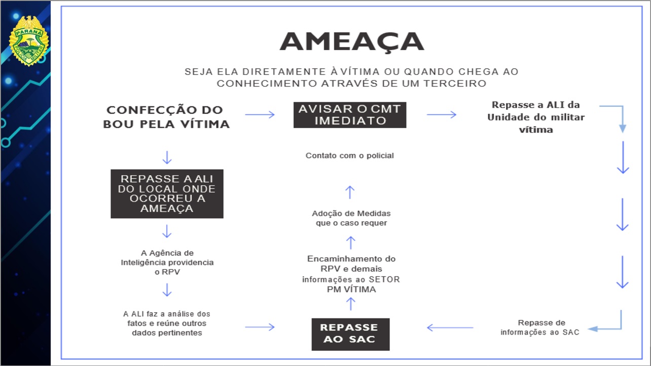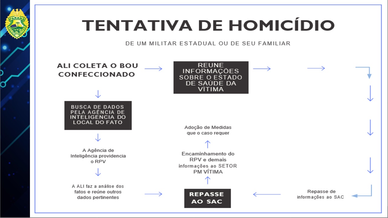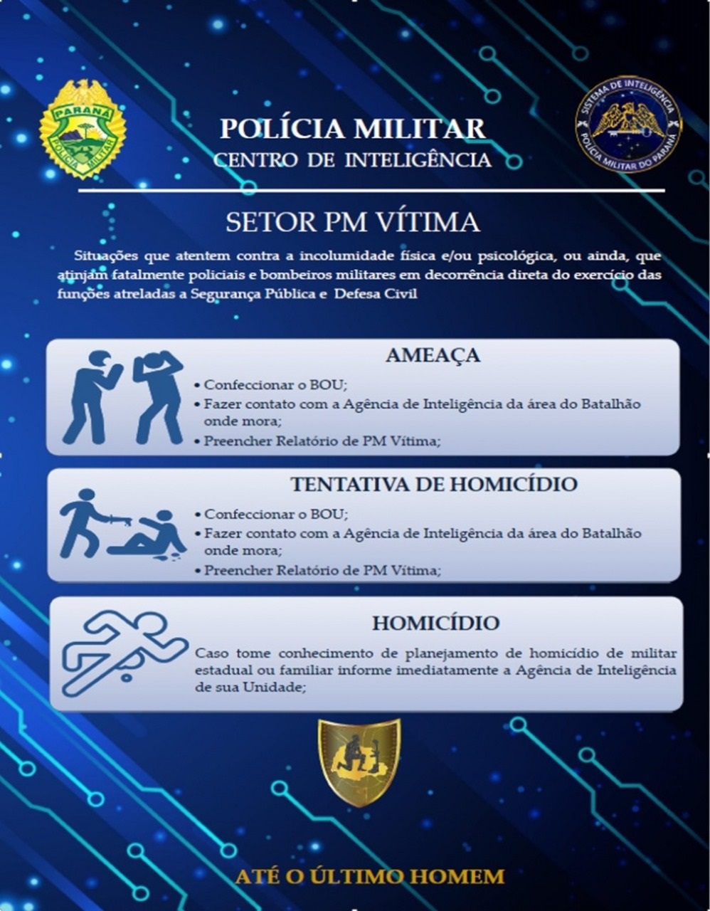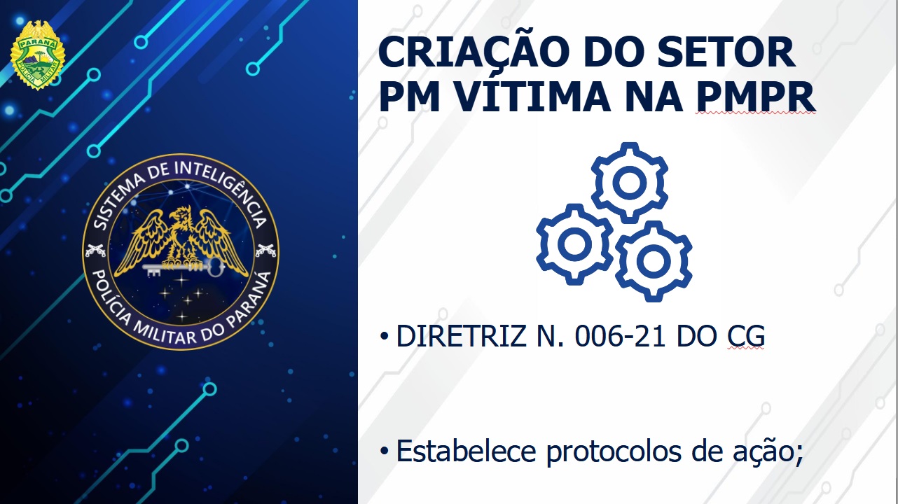 Considerados os casos de policiais militares tombados e ameaçados em decorrência do serviço, foi elaborada a Diretriz 006/2021-CG que Institui o setor de PM Vítima na DINT, que tem como uma das principais missões o estabelecimento de protocolos de ação e a colaboração com a Polícia Judiciária no esclarecimento dos crimes de Ameaça, Tentativa de Homicídio e Homicídio contra policiais militares ou seus familiares em decorrência, exclusivamente, do exercício da função ou ainda, em represália a Instituição e/ou em retaliação a ações ou operações policiais.