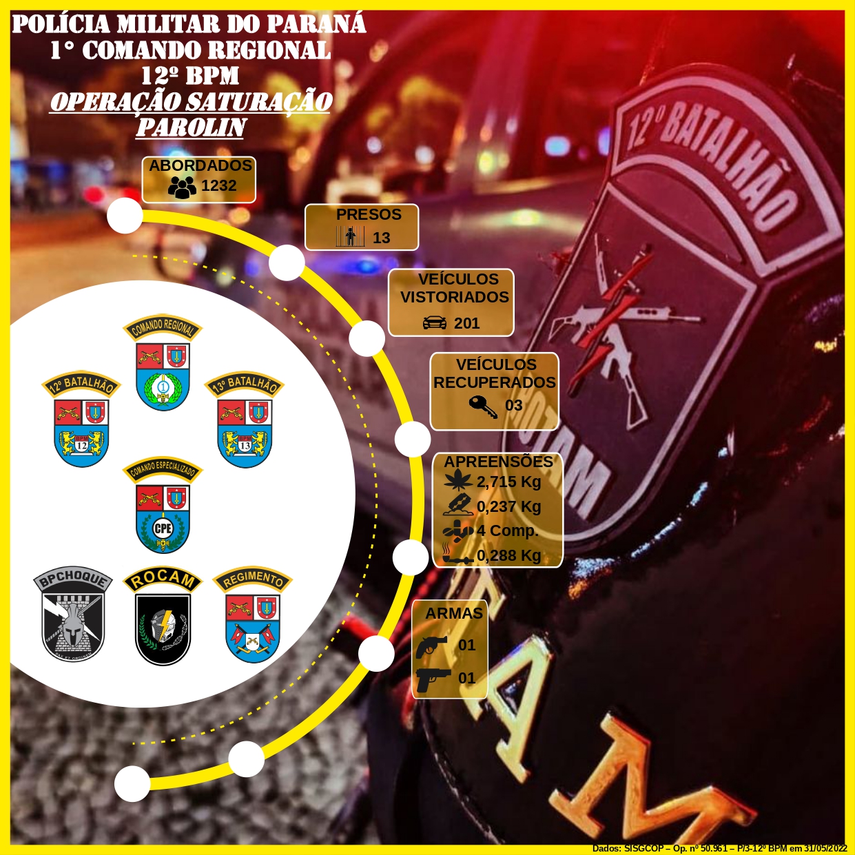 Com início em 16/05 e encerramento em data de ontem (30/05), a Operação Saturação teve o objetivo de exercer o policiamento ostensivo no bairro Parolin, com ações preventivas e repressivas por meio de atividades de presença, bloqueios táticos, abordagens policiais, incursões em áreas de degradação social, fiscalizações de veículos e pessoas.