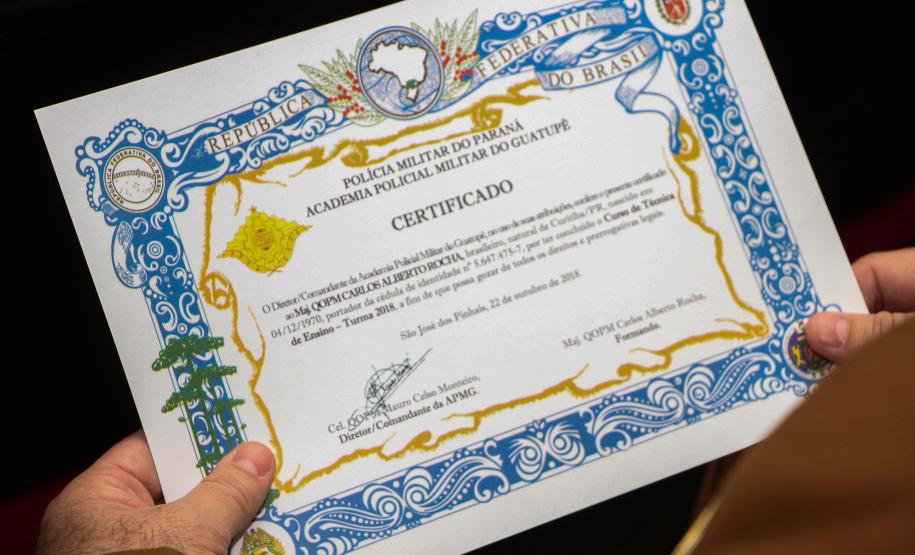A cerimônia foi coroada com a entrega dos diplomas aos formandos, oriundos de unidades da Capital, Região Metropolitana e Interior, e também com homenagens. A primeira foi para o coronel Tortato, pelo apoio na execução do curso, e também aos instrutores e professores que se empenharam para compartilhar conhecimentos e doutrina aos alunos.
