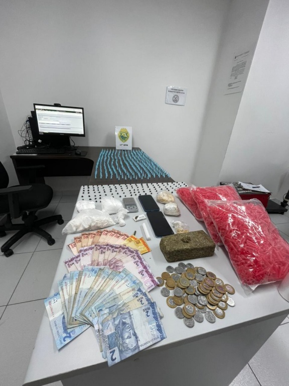 Entre os itens apreendidos estavam 441 pinos plásticos com substância análoga à cocaína, 118 invólucros de crack, quatro porções de cocaína não fracionada, uma pedra de crack, um tablete de maconha, uma munição calibre .22, uma balança de precisão e R$ 317,75 em dinheiro, além de diversos objetos utilizados para o preparo e a comercialização dos entorpecentes.