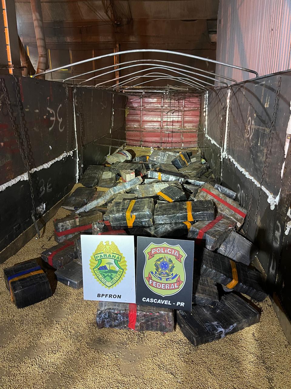 Durante a busca pessoal, nada de ilícito foi localizado com o condutor, de 58 anos, contudo, ele apresentou intenso nervosismo ao ser questionado sobre a carga transportada. Informado de que o caminhão seria vistoriado, o homem confessou que levava drogas escondidas em meio a uma carga de soja.