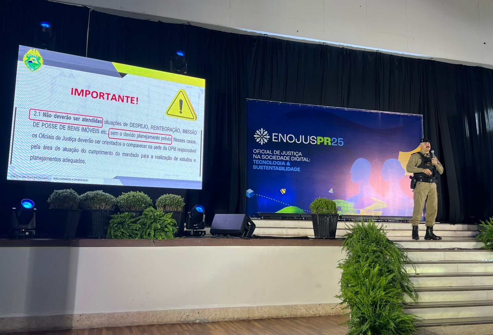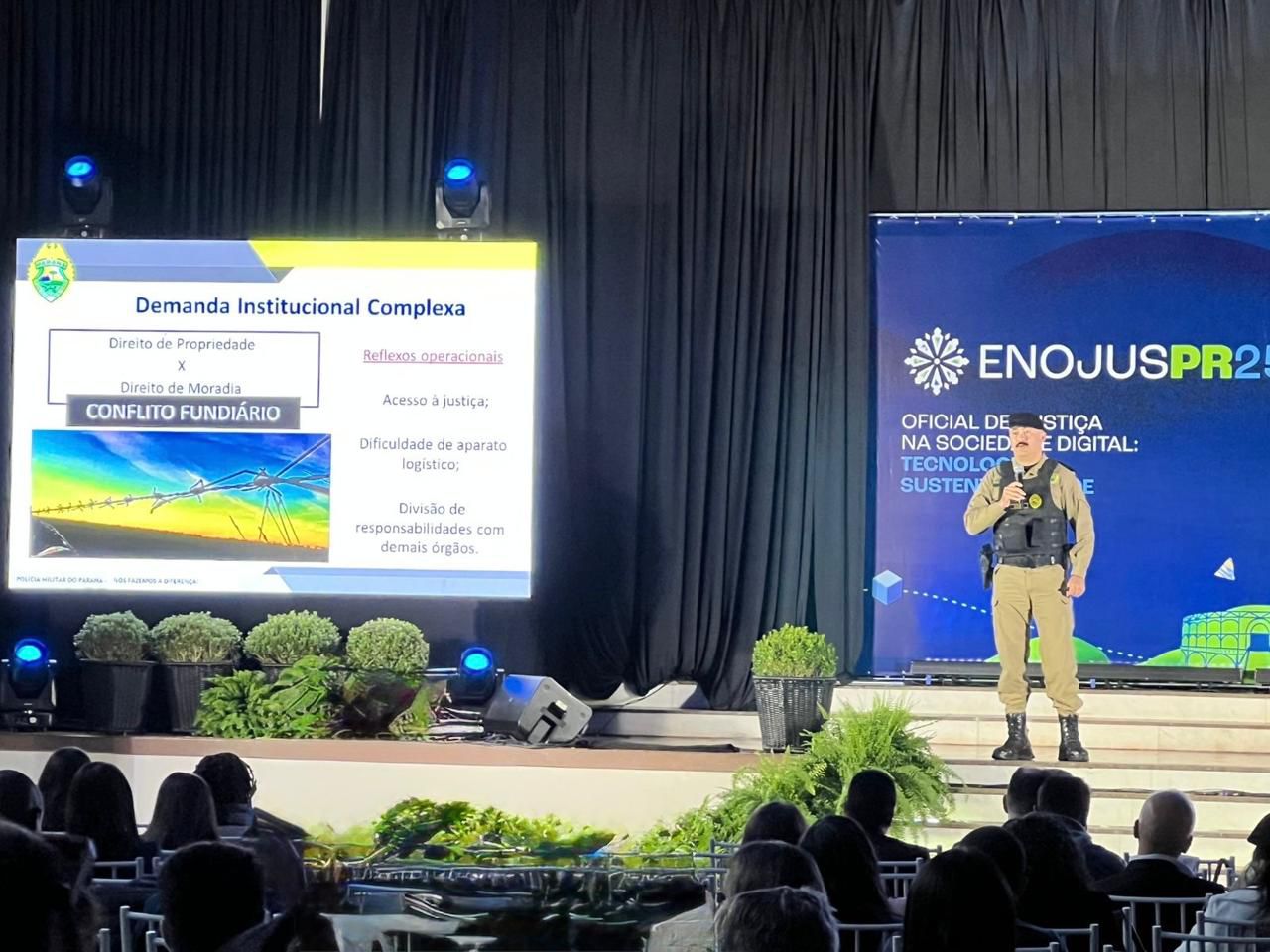 A Polícia Militar do Paraná (PMPR), por meio da Coordenadoria de Mediação dos Conflitos Fundiários (COORTERRA), destacou-se no IX Encontro Nacional dos Oficiais de Justiça do Brasil (ENOJUSPR25), realizado em 25 de setembro de 2025.