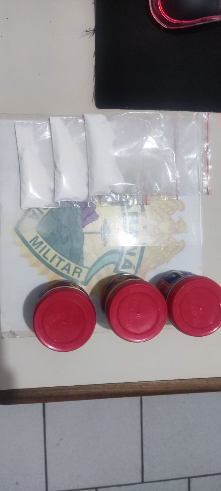 No veículo estavam o condutor e uma passageira. Durante a busca no interior do automóvel, os militares estaduais localizaram três frascos contendo aproximadamente 26 gramas de cocaína escondidos no porta-luvas.