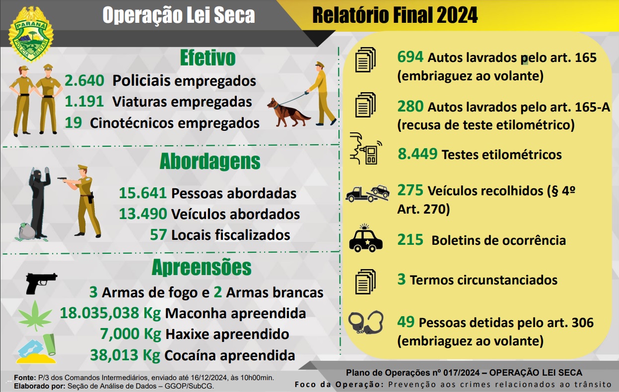 Nesta terça-feira (17), a Polícia Militar do Paraná (PMPR) apresentou os resultados da Operação Lei Seca referentes ao segundo semestre de 2024. A iniciativa teve como foco principal a redução de mortes no trânsito, combinando ações de fiscalização e conscientização sobre os riscos da associação entre álcool e direção.
