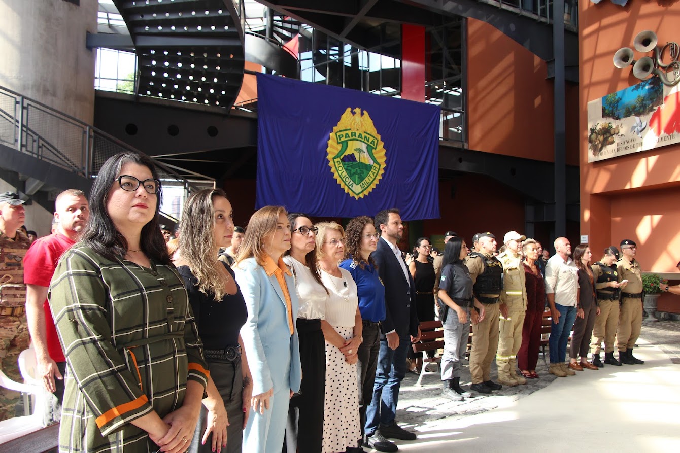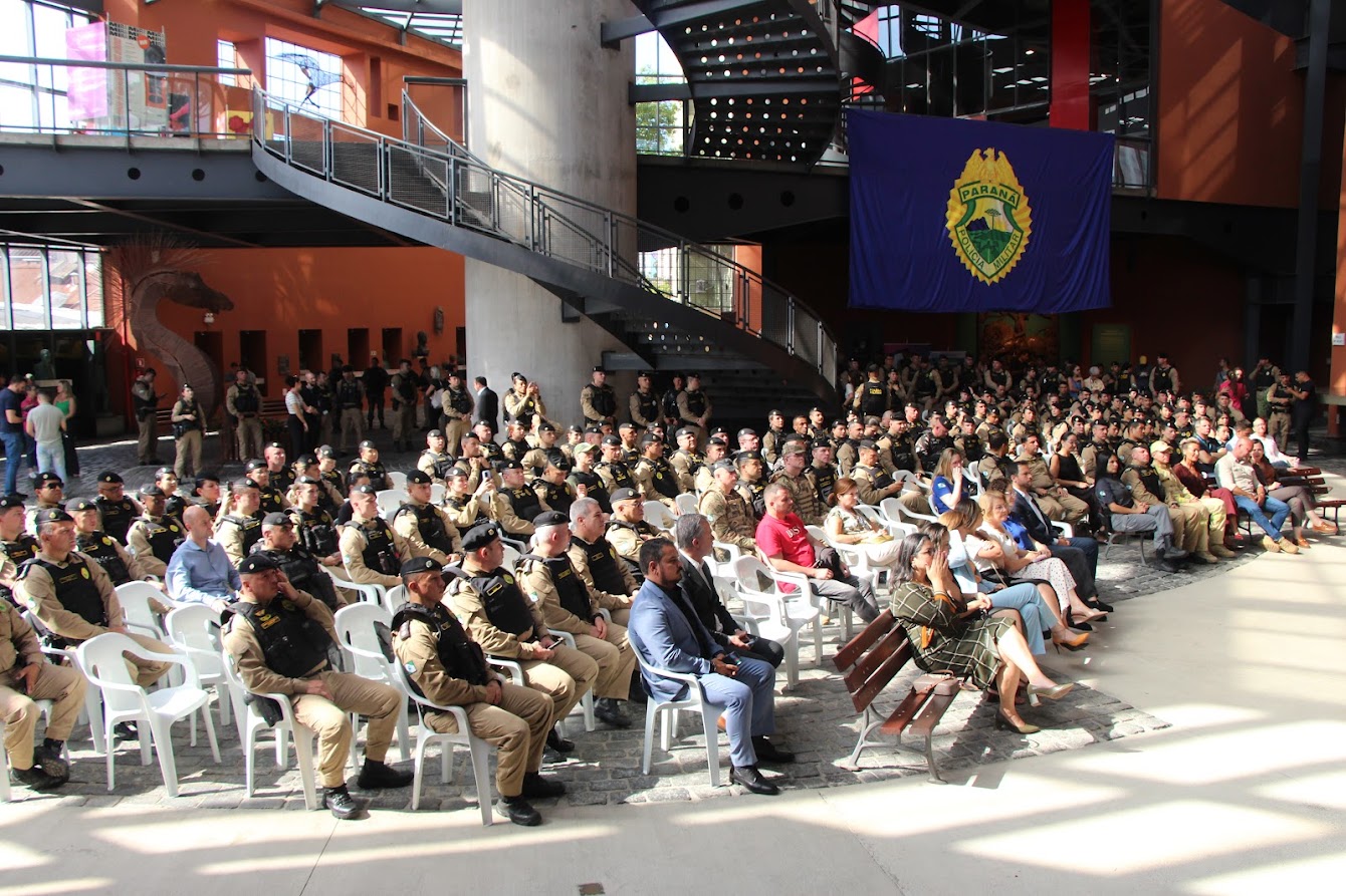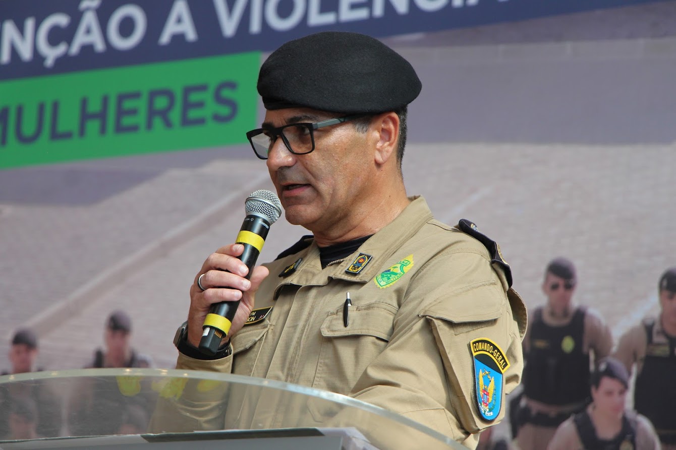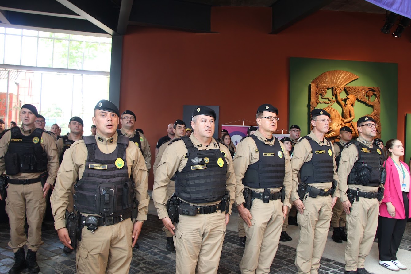PRESENÇAS — Também participaram o comandante-geral do Corpo de Bombeiros Militar do Paraná, coronel Antonio Geraldo Hiller Lino; o comandante do 5º CRPM, coronel Valmir de Souza; o comandante do 6º CRPM, coronel Alessandro Galaski; o comandante do 2º CRPM, coronel Juarez Saldanha Machado; a deputada estadual Cloara Pinheiro; a deputada estadual Marcia Huçulak; a diretora-geral da Polícia Penal do Paraná Ananda Challegre; o diretor-geral da Polícia Científica do Paraná, Ciro José Pimenta; o gestor de Políticas Públicas da Secretarta da Segurança Pública (Sesp), coronel Silvio Roberto Saulo de Tarso Sanson; o chefe de gabinete do secretário da SESP, coronel Fernando Klemps; o diretor de Logística da PMPR, tenente-coronel Pedro Paulo Porto de Sampaio; o comandante do Policiamento Especializado, tenente-coronel Rogério Gomes Pitz; o comandante do Comando de Missões Especiais, tenente-coronel Alexandre Lopes Dias; o comandante do Comando de Aviação, tenente-coronel Andrey Müller Yark; a delegada-chefe da Divisão de Polícia Especializada da Polícia Civil; Luciana de Novaes; a diretora da secretaria da Mulher de Curitiba, Aline Betenheuser; a presidente da Comissão das Mulheres Advogadas, Naila Franco; e o presidente do Grupo Raytec, Jonatas Matos.