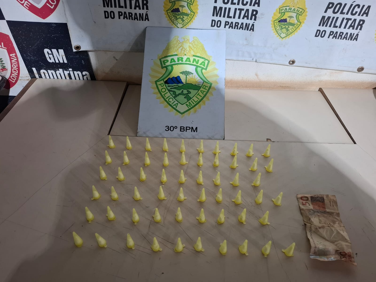 Os policiais realizaram buscas na viela por onde o indivíduo tentou fugir e localizaram, sob uma pedra, mais 54 pinos com a mesma substância, idênticos aos encontrados com ele. Ao todo, foram apreendidos 58 pinos de cocaína, totalizando 63 gramas, além do dinheiro.