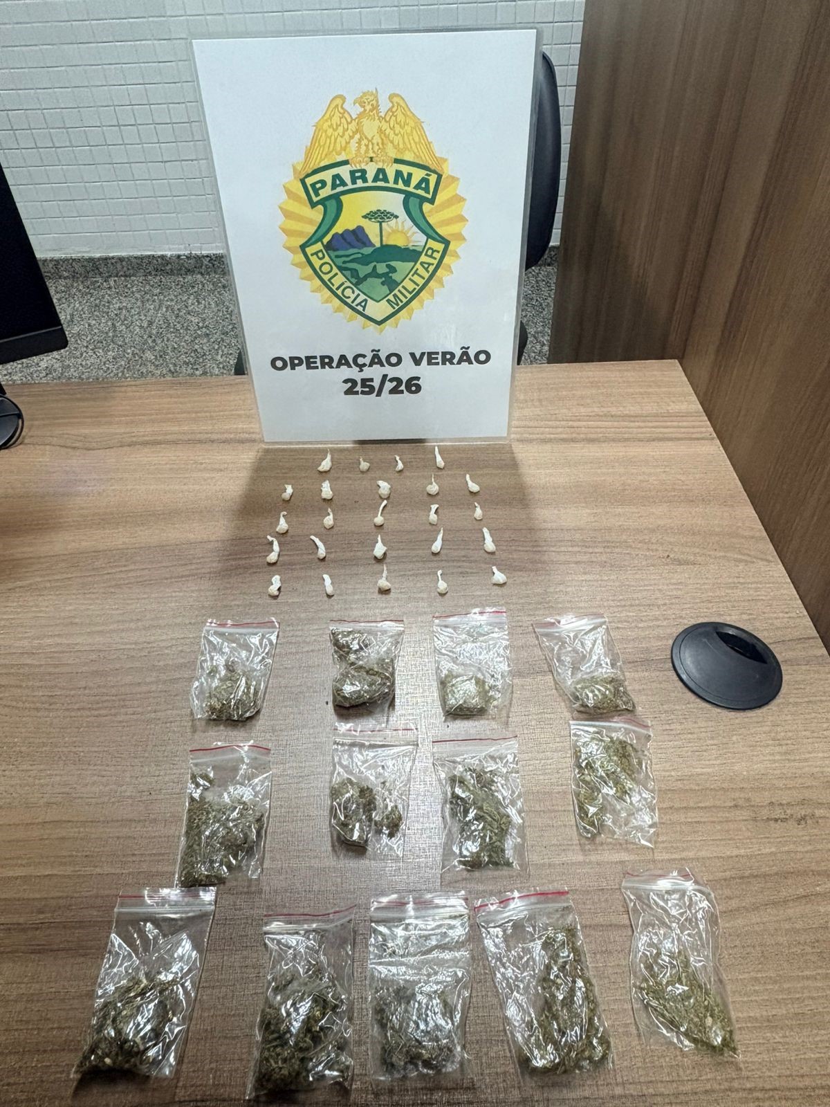 Ao todo, foram apreendidas 13 porções de maconha, 24 porções de crack e um aparelho celular. Diante do flagrante, o indivíduo recebeu voz de prisão e foi encaminhado à Delegacia da Polícia Civil de Matinhos.