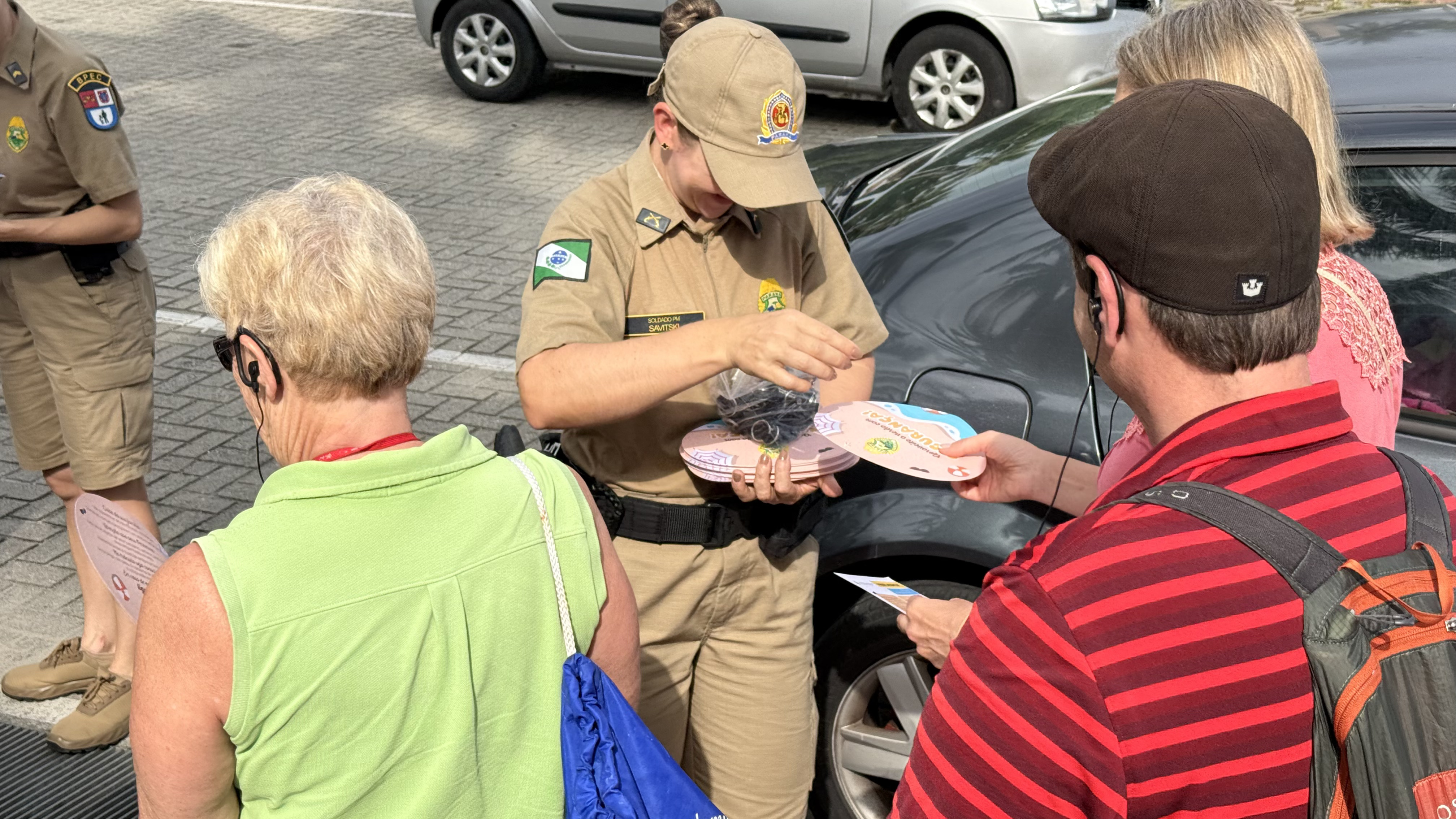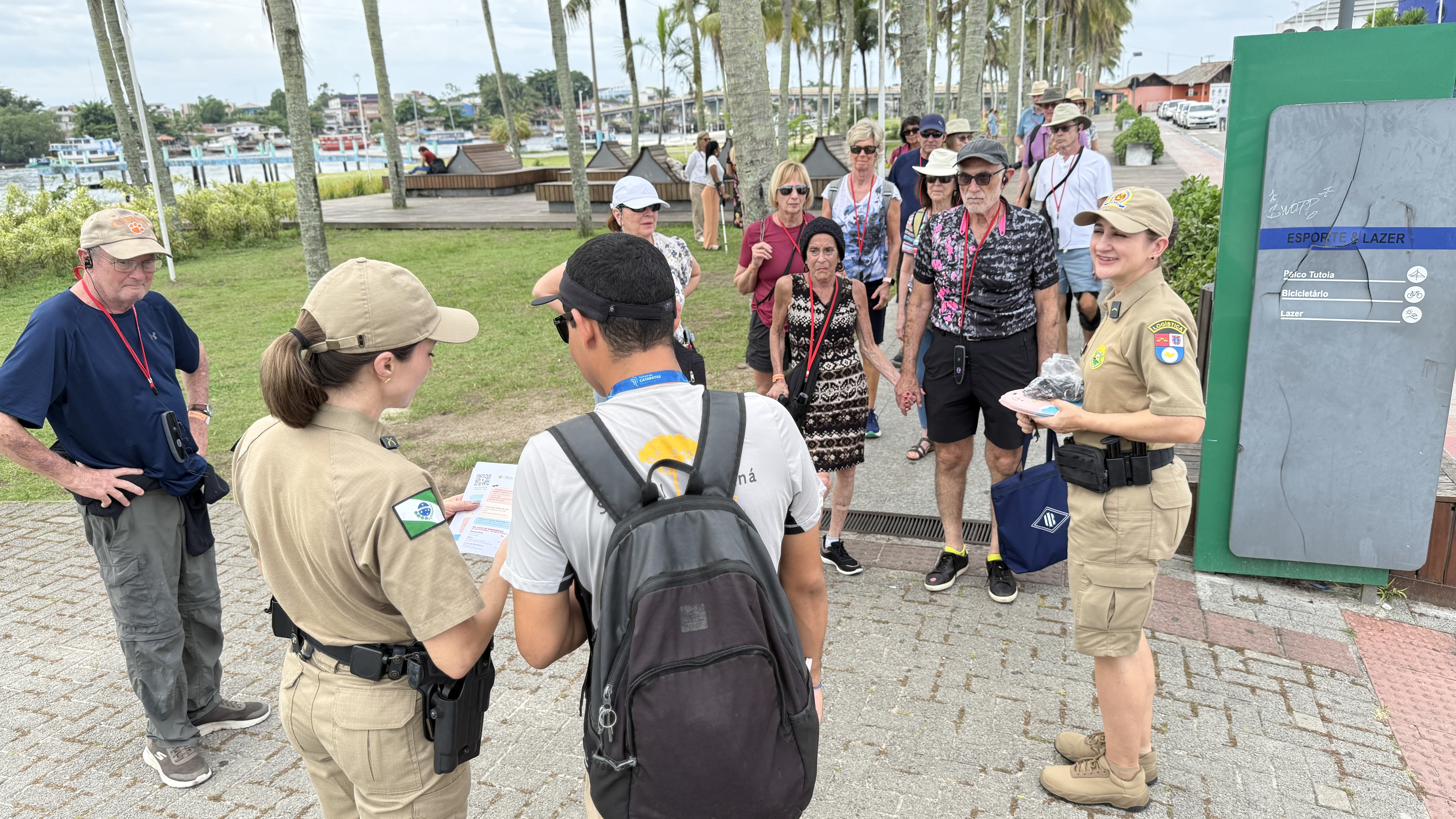 Durante as atividades, os policiais realizaram a entrega de itens de utilidade pública e brindes personalizados, como squeezes, ventarolas e chaveiros, que serviram como lembranças da hospitalidade local. Os motoristas e turistas que circularam pela região também receberam lixeiras para veículos, incentivando a manutenção da limpeza urbana e a consciência ambiental em uma área de preservação e turismo portuário. Essa abordagem permitiu que a equipe demonstrasse a eficiência do policiamento paranaense, consolidando o papel da Polícia Militar como uma instituição parceira, acessível e preparada para lidar com o dinamismo de uma cidade que é vitrine internacional do estado.