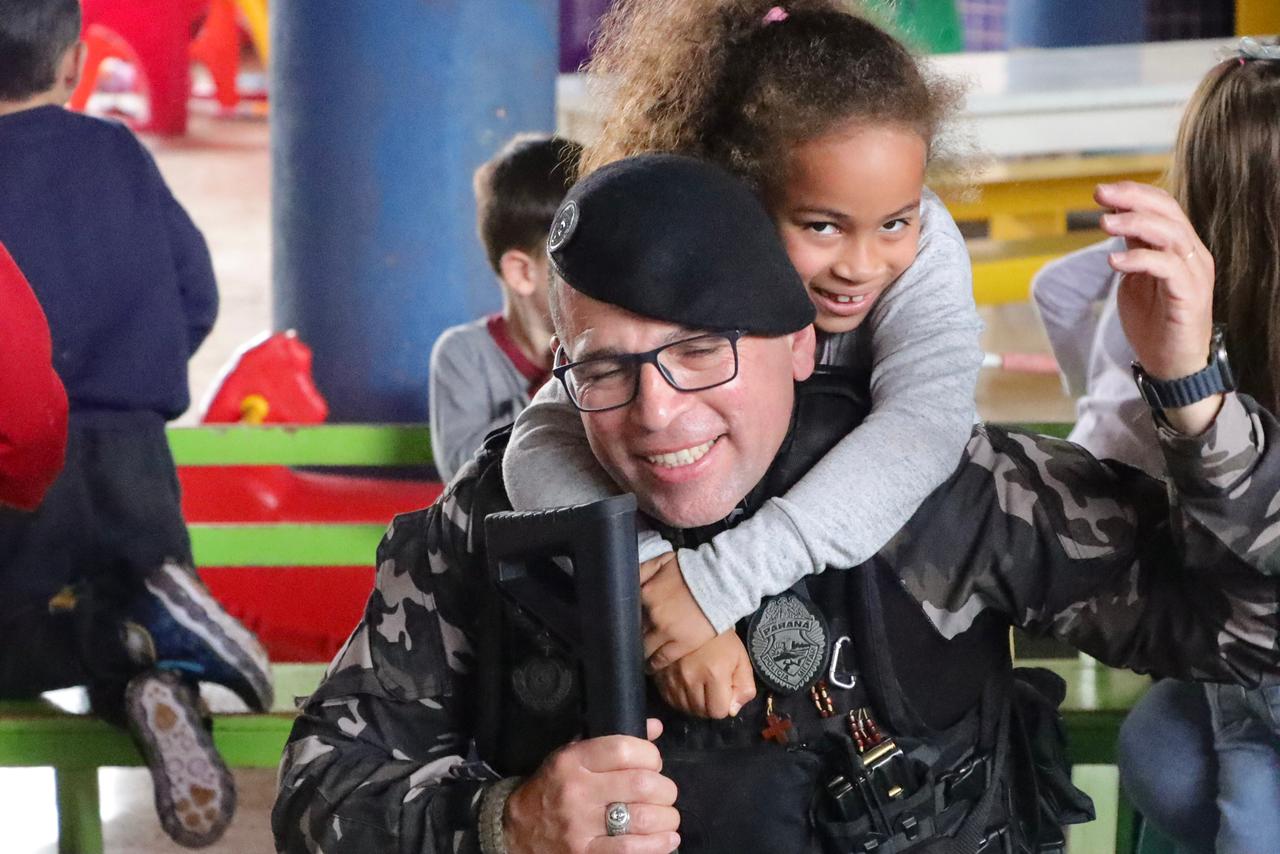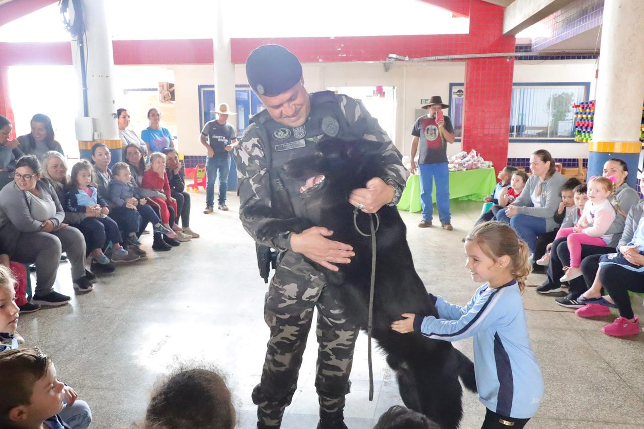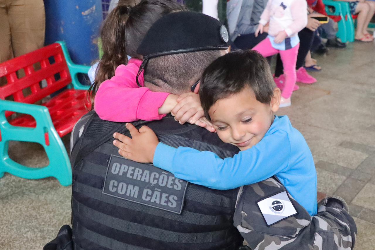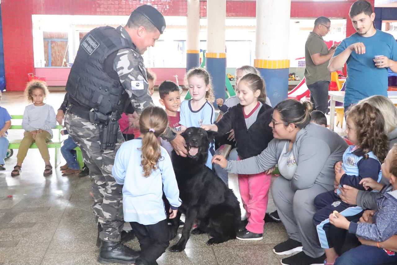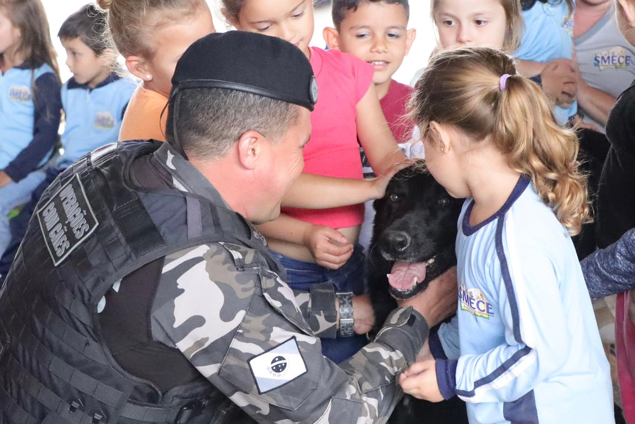 A Polícia Militar do Paraná (PMPR) realizou, nesta terça-feira (18), uma ação interativa com as crianças do Centro Municipal de Educação Infantil (CMEI) Dona Laura, em Rio Bonito do Iguaçu. A atividade, conduzida por policiais da Companhia Independente de Operações com Cães (CIOC), teve o objetivo de oferecer acolhimento e apoio emocional às famílias que ainda enfrentam os impactos do tornado que atingiu a cidade.