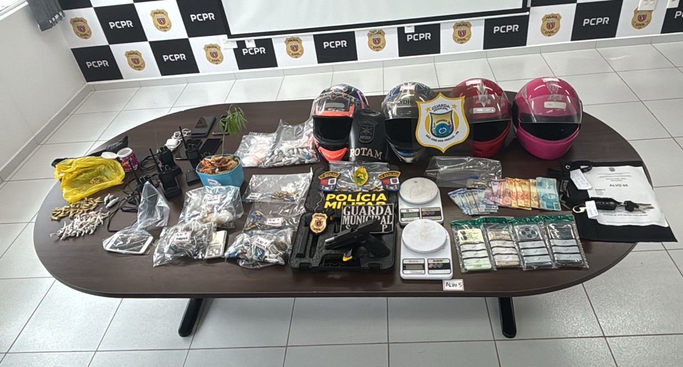 Ao longo das diligências, foram apreendidas cinco armas de fogo e um simulacro, além de 48 munições. Também foram recolhidas três balanças de precisão, quatro rádios comunicadores, três carregadores de rádio, uma bateria, 15 aparelhos celulares, quatro capacetes, um veículo e uma motocicleta.