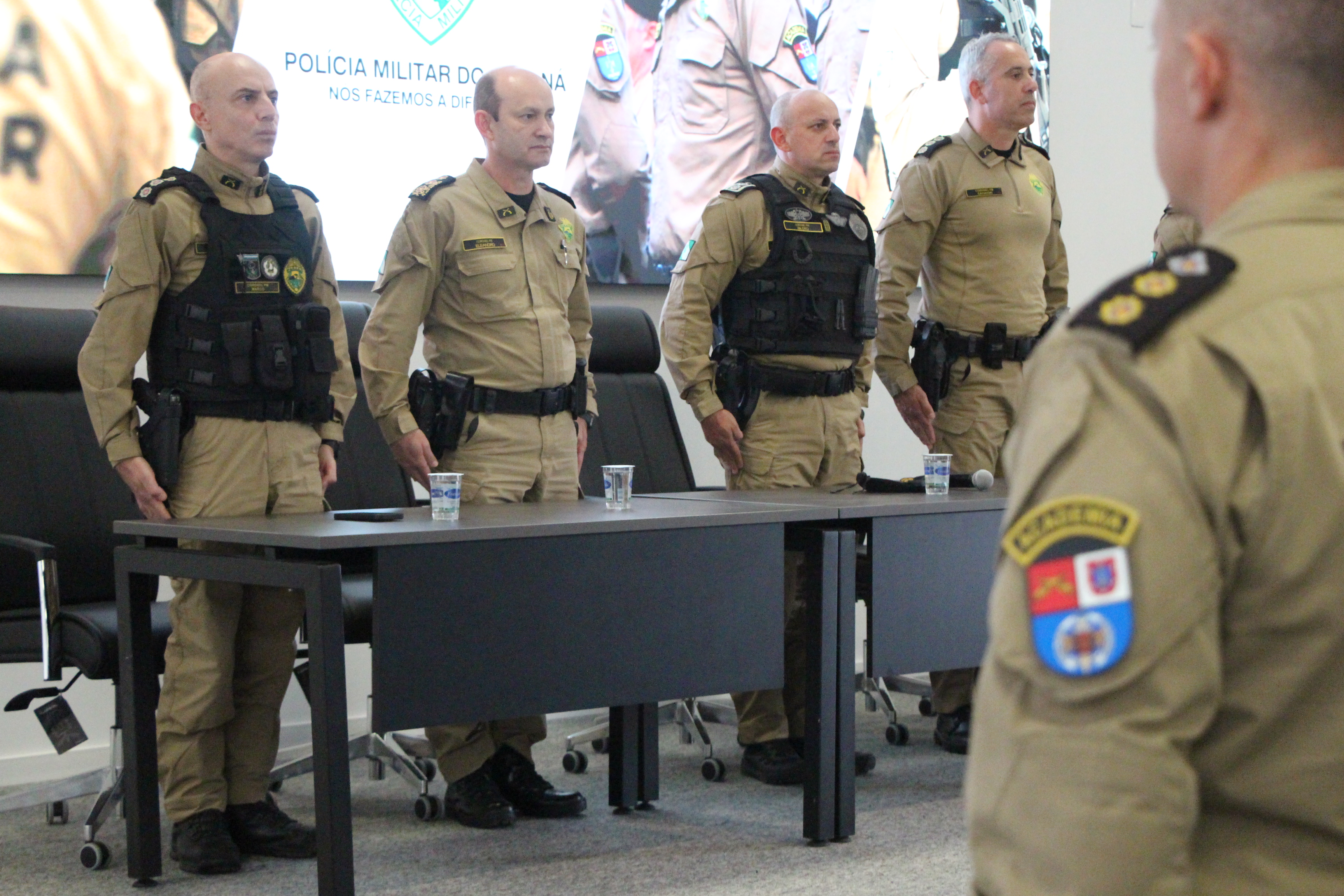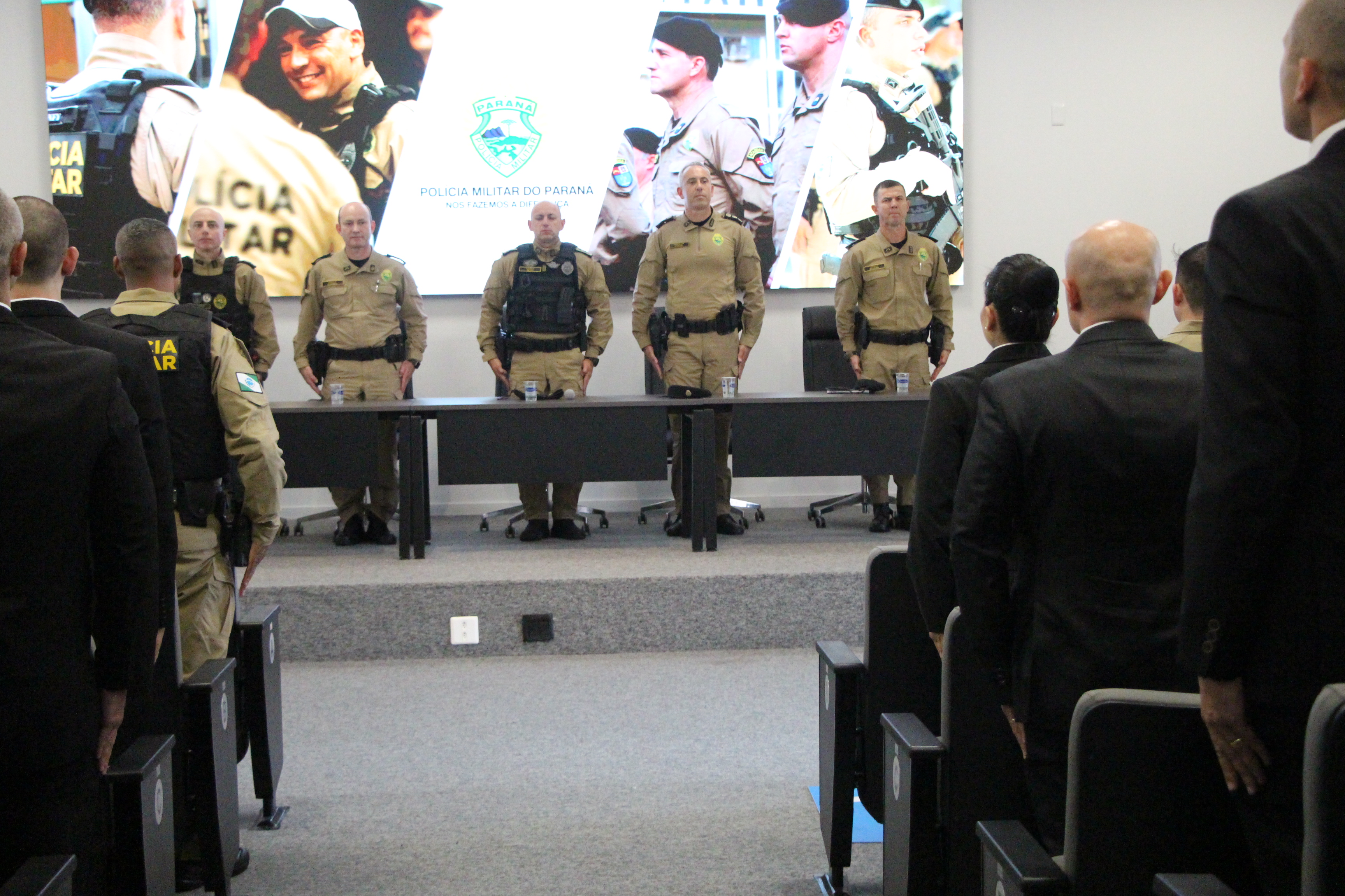 PRESENÇAS – Também estiveram presentes na solenidade o chefe do Estado-Maior da PMPR, coronel Eleandro Azevedo; o diretor de Educação Corporativa, coronel Marco Antonio da Silva; o diretor da Diretoria de Gestão de Pessoas, coronel Juliano Caciatori; o comandante do Comando de Missões Especiais, tenente-coronel Alexandre Lopes Dias; e o corregedor-geral da PMPR, coronel Alfredo Euclides Dias Netto.