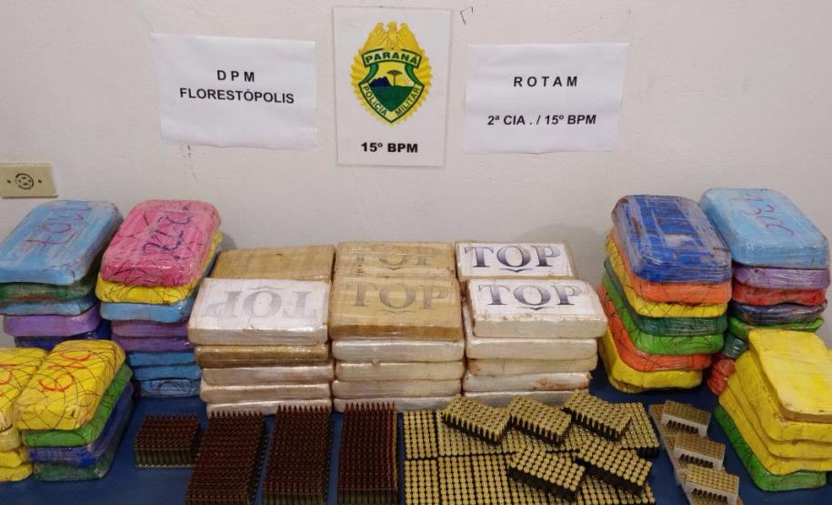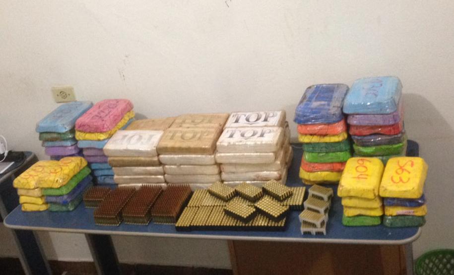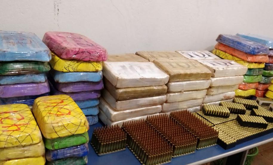 No local as equipes fizeram buscas e encontraram 51,6 quilos de crack; 31,5 quilos de cocaína; 510 munições de calibre 5,56; 500 munições de calibre 9mm; 500 munições de calibre .380; 450 munições de calibre .22.