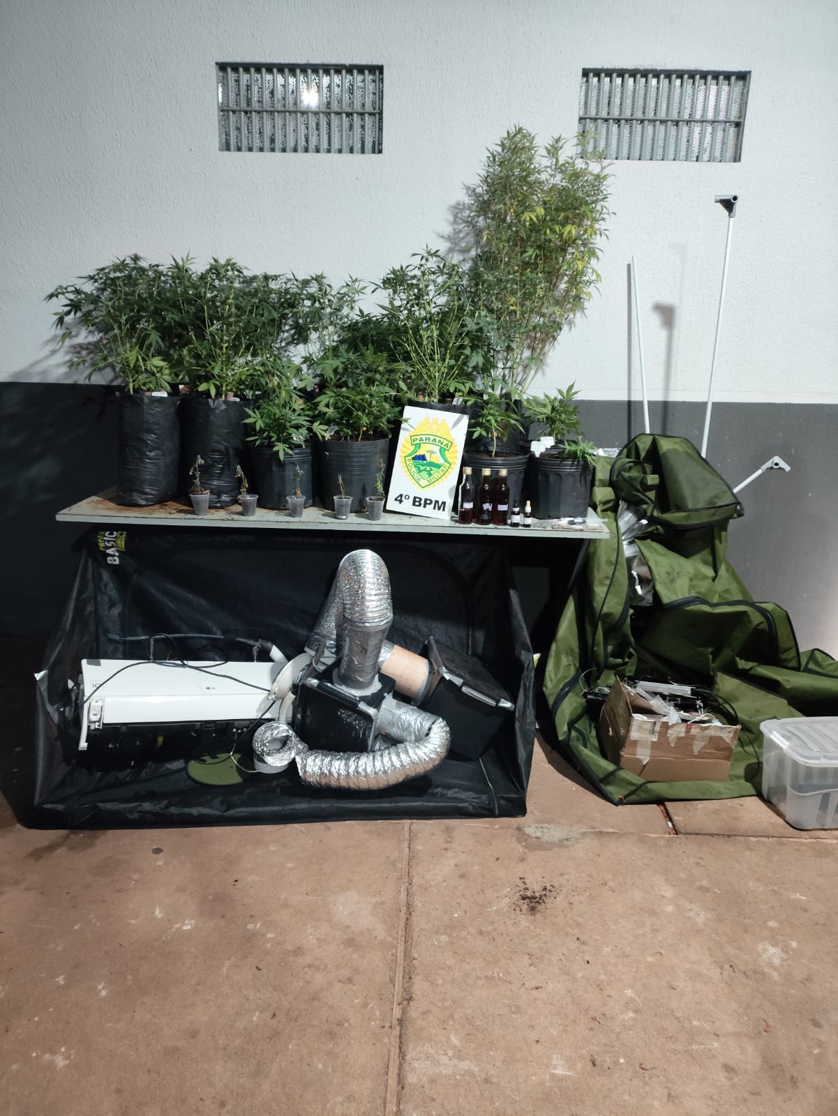 Diante da denúncia, a equipe deslocou-se até o endereço indicado para averiguação, confirmando a situação por meio de registros fotográficos. No local, foi constatada a presença de diversos pés de maconha, além de estufas equipadas com sistemas de iluminação e ventilação utilizados para o cultivo da planta. Também foram apreendidos recipientes contendo óleo derivado da maconha e invólucros com sementes destinadas ao plantio.