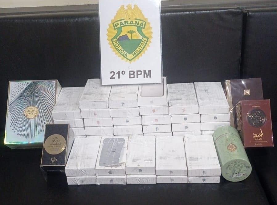 A operação teve início após o recebimento de informações que indicavam o transporte irregular de mercadorias de origem estrangeira. Durante a verificação do veículo, as equipes localizaram 43 aparelhos celulares, sendo 33 iPhone 17 Pro Max, um iPhone 16 Pro Max, três iPhone Air e seis iPhone 15, além de cinco frascos de perfumes importados de marcas diversas.
