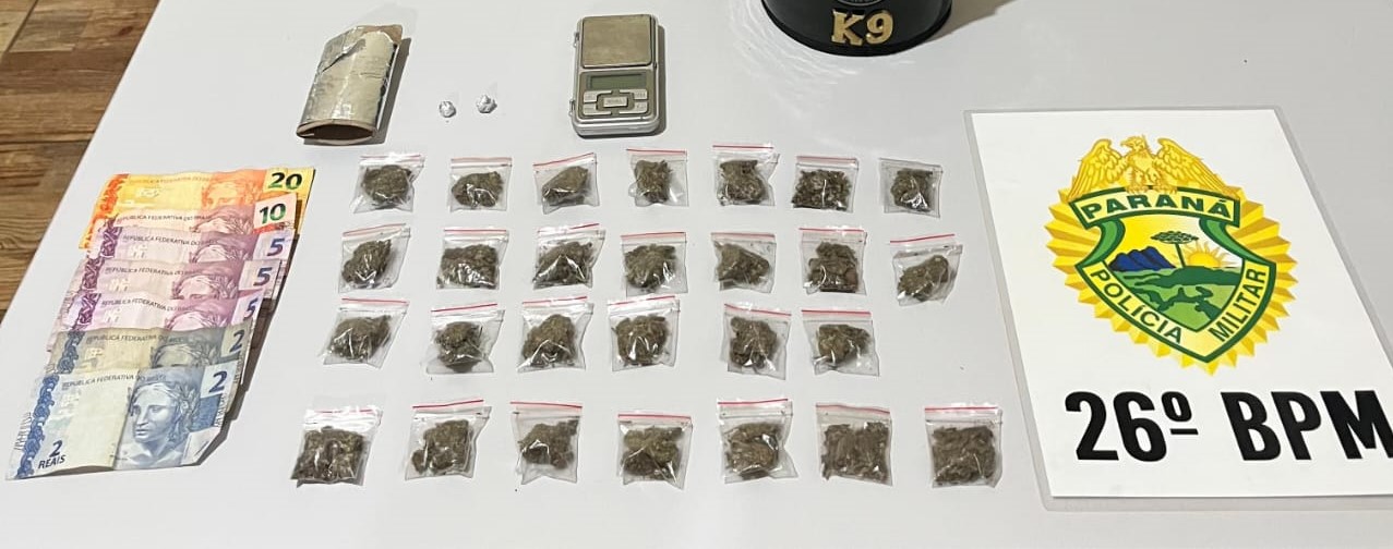 Na noite desta segunda-feira (17), a Polícia Militar do Paraná, por meio da equipe Canil do 26º Batalhão de Polícia Militar (BPM), prendeu um homem suspeito de tráfico de drogas na Vila Martins, em Reserva. A ação resultou na apreensão de entorpecentes, dinheiro e materiais utilizados na preparação e comercialização das substâncias ilícitas.