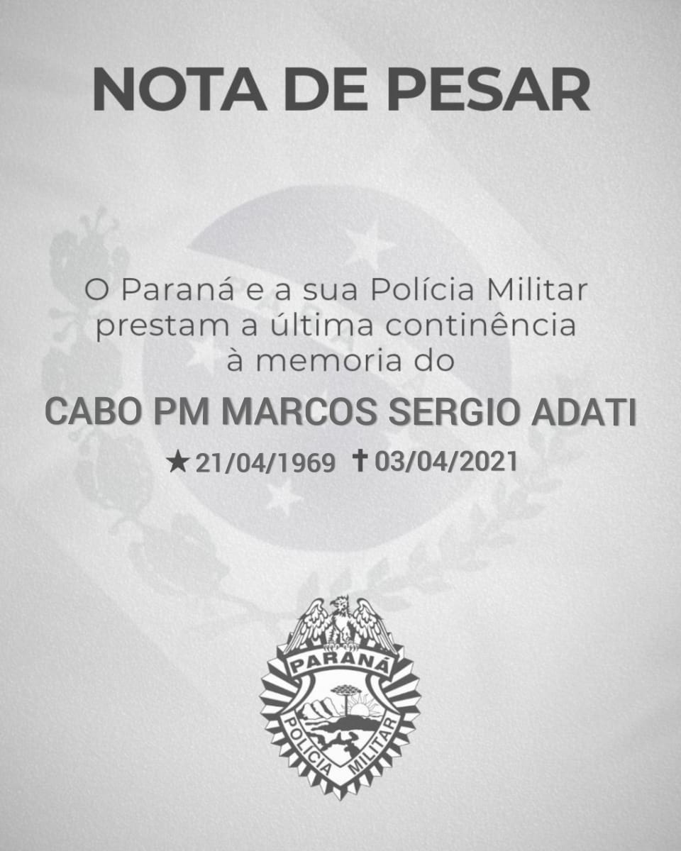 O Cabo PM Marcos Sérgio Adati, infelizmente faleceu na data de hoje, 3 de abril de 2021, aos 51 anos, após dias de luta contra o COVID19.