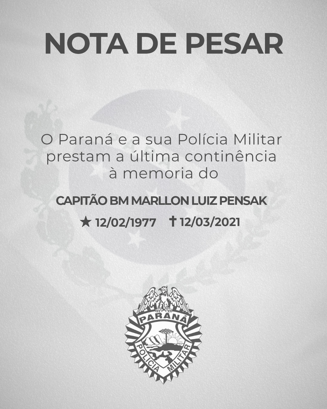 O capitão do Corpo de Bombeiros, Marllon Luiz Pensak, infelizmente faleceu, hoje, 12 de março de 2021, vítima de câncer.